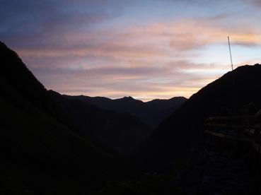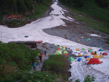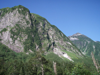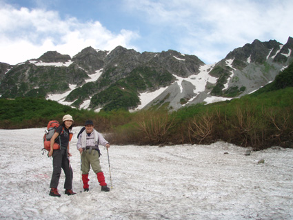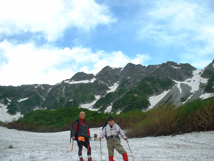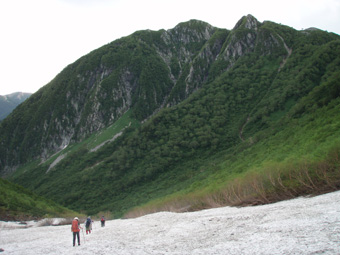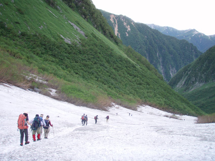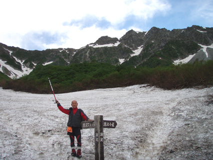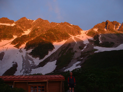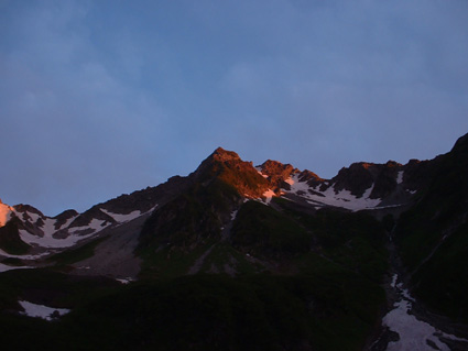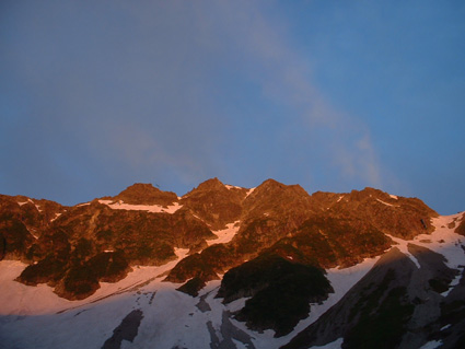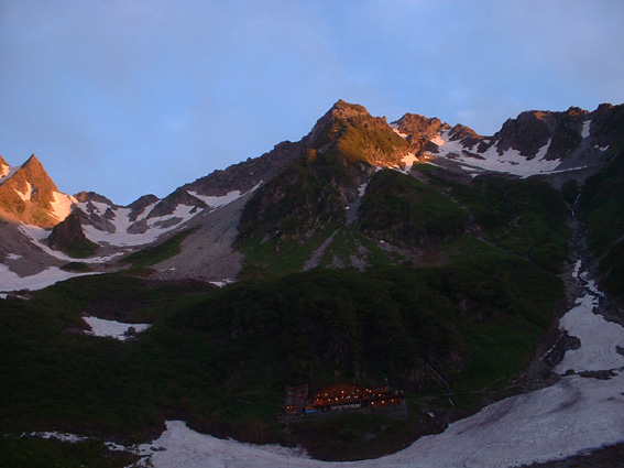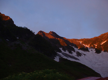 ![]() 朝焼けの稜線(大天井岳方面) 涸沢テント場 窓に差し込む光 夜明けの合図と共に外に飛び出す 朝日が山を染め涸沢のテン場が忙しくなる ![]() 朝日に染まる北穂高岳 奥穂高岳 素晴らしい光景が目の前に広がり息をのみ山並みを追う 昨日の天候が嘘のように静かな朝を迎えた 奥穂高岳のコルには人影が見えるが 山頂を双眼鏡で覗いても未だ動く気配を感じることは出来ない 涸沢から見るモルゲンロートに心が揺れる 素晴らしい眺めだ 山頂の展望を思い浮かべ瞼の裏に映るフイルム あれが笠ヶ岳 あれが槍の穂先 お〜常念岳や蝶も心が逸る ![]() 前穂高岳 奥穂高岳〜涸沢岳 赤く染まる山並み 険しい稜線の一つ一つがクッキリと浮かび上がる 昨日の荒れた天候を思い出すことも出来ない清々しい朝を迎えることが出来た ![]() 夜明けの空に鎮座する北穂高岳(左に涸沢槍) 山は気まぐれだ そして優しくもあり厳しくもある 山の神様に自然の摂理を教えて頂いた様な思いがする二日間になりました 涸沢カールの残雪と山小屋の灯り ピークを照らす朝日 雄々しく鎮座する北穂高岳が融合する一枚の絵に引かれる! ![]() ヒュッテ前にて(Su−さん・Ariさん・Sadaさん・Hodakaさん・Gonちゃん・Haruさん) 下山 朝食を済ませて下山です 昨日の服装とは別世界 朝から陽射しが体を温め身軽な格好で小屋を後にした また来ましょうを合い言葉に幾度と振り返る ! リベンジを約束した仲間の視線に穂高岳の全貌が少しずつ離れてゆく。 ![]() 涸沢雪渓にてSEI 屏風の頭 穂高岳を背景にGonちゃん〜Hodakaさん ![]() 穂高岳の稜線 横尾本谷(後方は北穂高岳) 本谷橋で大休憩だ! 青空に映える北穂高岳〜屏風の頭〜屏風岳の展望が素晴らしい 稜線上を覗くと人影が見える 小屋の脇にも動く影が 次回は俺たちも稜線歩きだと気合いも入る風景でした。 ![]() 休憩 本谷橋を渡る(後方は屏風岩) ![]() 屏風岩&北穂高岳 横尾から望む前穂高岳 蝶ヶ岳の分岐 奥に見える大切戸・・? 何処までも素晴らしい展望が広がる ![]() 横尾からの展望 梓川の気になる木 梓川には流木が多く見られる そんな流木を尻目に川の中州にある巨木は何の木だろう 寂しげでもあり誇らしげでもある木が気になりました ![]() 倒木 新村橋 徳沢から上高地へと足を進めると何と巨木が倒れてるではないか・・? 昨日に通った時には無かった倒木 夜半の大雨で地盤が緩み根こそぎ崩れたようだ 事故は無かった様で一安心です ![]() 梓川(後方は赤沢山・・?) 明神池の売店 梓川の清流と山並み 昨日は濁った流れで在ったがブルーに輝く水面が青空とコラボ 明神池の売店に在る青リンゴが和みをくれた 穂高岳を半周するコースも後半を周り上高地のターミナルに到着した 上高地は人人人・・・・凄いの一言です 沢渡まで帰るタクシー待ち時間は一時間 バス乗り場は長い行列でした 高桑荘に寄り一風呂浴びて帰路につく 高速道路は渋滞して通常より二時間多く係り郡山に到着いたしました 参加のSuーさん Ariさん sadaさん Hodakaさん Haruさん Gonちゃん 穂高へリベンジしましょう ・・・SEI・・・ 戻る |