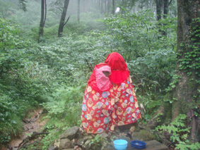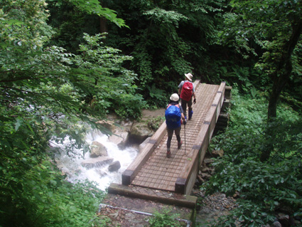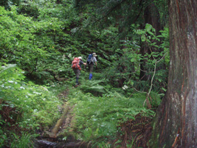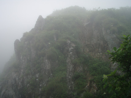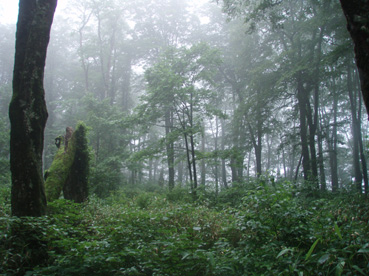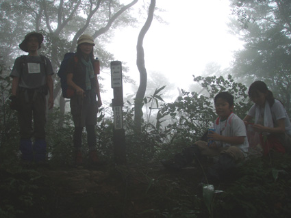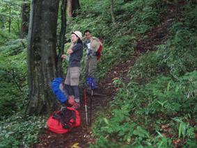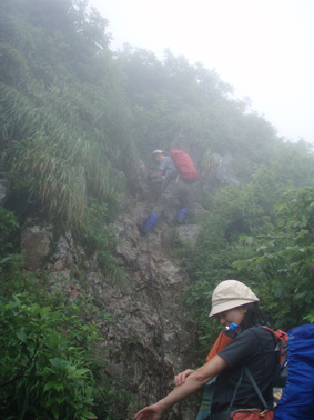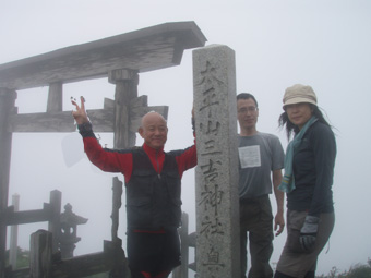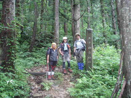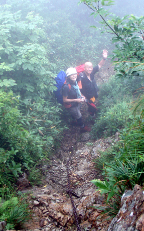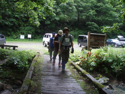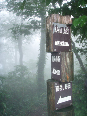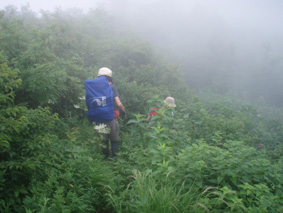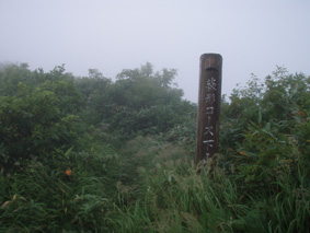 ![]() 駐車場の橋を渡る 旭又登山口にて(SEI〜Gonちゃん〜一匹さん) 日曜日 太平山の登山口に着いたのはAM9:15 今日も昨日と同じような小雨模様です 登山口で準備をしてると現地のボランティアの人と思われる方が来て 山頂の状況や危険箇所などを説明してくれた 小さな橋を渡り登山道へ進む 暫くは杉林が続き静かな歩きとなる 沢に係る石橋を渡ると急登となり 此処から稜線に出るまで同じような登りです 稜線に出ると高山植物の花が多くなり目を楽しませてくれた 次に現れたのがこのコースで一番の難所と言われる鎖場です 大岩の在る場所は切れ落ちた絶壁で展望が在れば素晴らしいだろうと白い空間を眺めた 山頂へ行く稜線はお花が多く お花畑を過ぎて藪を登り終えると山頂へ着いた 山頂はガスで展望皆無 風も強く山頂より少し下りた所で昼飯としました 低山ながら登り三時間半のコースに汗を絞られた体は泡を要求!する しかし強風で体温急降下・・フリースを着込んで泡を口にしたSEI 寒くても{うめ〜}と叫ばずには居られませんでした。。。 ![]() 道中の花ー1 ![]() 分岐 此処から急登 汗が絞られる 広い林道を進み宝蔵岳コースを進む 林道から右に逸れ石橋を渡ると始めからアルバイトを強いられる登りだ! ![]() 道中の花ー2 ![]() 霞むブナ林 まっすぐな杉 途中であった家族連れと一緒に! 暫く杉林が続く 原生林の古木は太く まっすぐに真っ直ぐに伸びてる まるでSEIの様だと話すと一瞬にして空気が濁り話し声が聞こえなくなりました・・・笑 登り始めて一時間ぐらい経ったとき 駐車場にあった車の持ち主か家族連れの4名が先行してた 途中まで私達が先を行きましたが 稜線に出て間もなく家族連れのパワーに追い越される(子供二人の凄い体力の山屋さんです) ![]() 道中の花ー3 ![]() 幻想的で何か出てきそうだ! 道標 宝蔵岳を過ぎると稜線歩きになる 花々が至る所に顔を出し見えない展望をカバーします ブナ林も湿度が高く 蒸し暑いが風景を見つめると涼しげな気持ちに成れた ![]() 道中の花ー4 ![]() 弟子還の岩峰 鎖場を登る 弟子還りの岩場は雨で滑りやすい為 鎖につかまり慎重に登る ![]() 鎖場にて! 道中の花ー5 ![]() 稜線のお花畑を過ぎると間もなく山頂です 岩場を過ぎて左右が切れ落ちた稜線にはギボウシが咲き競ってる そこから間もなく鬱そうとした登りになり登り切ったところが山頂です 大きな鳥居が在り神社建つ空間は広くはないが 展望は良さそうだ!(今日は白いガスに被われてる) ![]() 山頂にて(SEI・一匹さん・Gonちゃん) 山頂は風が強く休憩場所には適さないと少し下り昼飯です フリースを着込み泡を飲む姿は見慣れた光景です 寒いときくらい飲まなければと言われそうな面々でした。。。 神社脇には真新しい建物が建設中です 定かではないが前の建物は焼失した為に建て替えてると聞く・・・・? ![]() 道中の花ー6 下り始めて最初の分岐には鐘が在ります 土台が腐り倒れてるが良い音色を出してましたよ〜〜〜(^O^) ![]() 御手洗清水 地蔵さん 御手洗清水は冷たくて美味しい 山腹からコンコンと湧き出る水は水量も豊富で沢を勢いよく下ってゆく。 脇には赤い洋服を纏った地蔵さんが仲良く並んでた ![]() 少しガスが動く 御滝神社 御滝神社まで来る頃にはブナ林のガスも薄くなり木々の輪郭もスッキリ見える 登山道にはブナの実の落下が多く今年は豊作のようだ 森のクマさんもお腹を空かさず冬を迎えられるだろう! ![]() 御手洗沢を渡る 岩魚が住んでそうな沢 御手洗沢に係る橋を渡れば駐車場の登山口はすぐ其処です 時計を見ると下り始めてから二時間十分 駐車場まであと20分として2時間30分の下りでした。 前日の太平山リゾートキャンプ場の宴会や朝方の小熊出没騒動 そして・・・ 美味しいキリタンポのご馳走と思い出深い二日間になりました 森林ボランティアのSuzukiさん 一匹さん Gonちゃん楽しい時間でしたね有り難うございます ・・・sei・・・ 戻る |