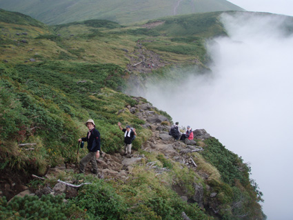ガスで視界は無いが崖を覗くと見えない恐怖もチラリ 落ちたら終わりだよ〜と何処となく声が聞こえた・・・笑