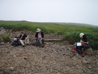 千畳ヶ原分岐にて休憩 草原に架かる木道