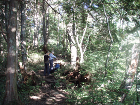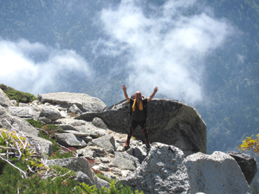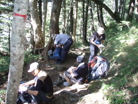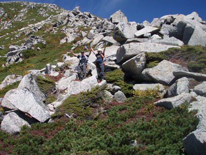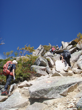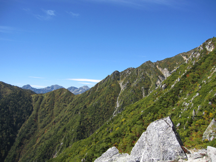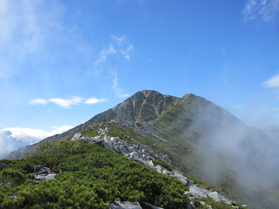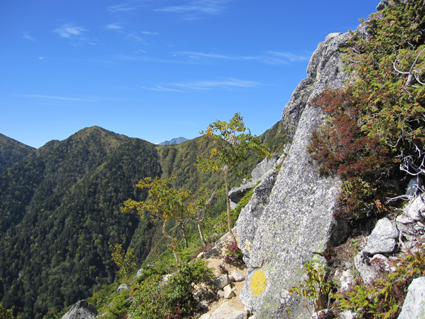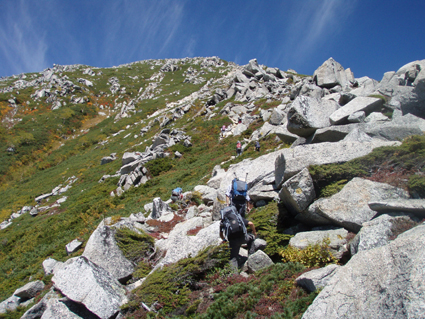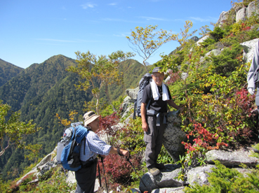 ![]() 前常念岳より(常念岳) 二日前 左足に板を落として怪我をする 痛みが治まらないので病院に行くと なんと左足小指にヒビが・・・(>_<) 痛み止めを処方していただき予定通り三股登山口に来ました ![]() 三股駐車場より(常念岳) テン泊の一コマ 登山口に着いたのは午後4時ころです 駐車場は満杯で途中の道路脇に止まってる車が目立つ 私達は運良く下山してきた人の車が出た後に止めることが出来ました 前夜祭は豪華にとSU−さんが持ってきてくれた越乃寒梅を足下に置き まずはビールでカンパイだ! 時間が経つにつれて寒くなりテントの中に逃げる SadaさんとAriさんは明日のためにと 早めに寝床に着くがSu−さんとGonちゃんSEIは越乃寒梅を空けるまで飲みました 一升瓶が横たわったところでお休みタイムです ![]() ![]() 登山マップ 分岐(道標) 駐車場から20分程で登山者管理棟に着きます 此処で登山届けを出して常念岳へと登り始めた いきなりの急坂で汗が絞られる 林には朝から光が溢れ登山道を照らす ![]() 道標と休憩の様子 蝶ヶ岳への迂回路まで来ると朝方のヒンヤリとした感じがなくなり皆さん衣替えです 登山道は歩きやすく林が日傘となる ![]() ![]() 紅葉が鮮やかな山肌 前常念岳の大岩へ 前常念岳の岩場まで来ると いきなり展望が全開だ 木々も色つき青空の中に溶け込み 此から始まる素晴らしいドラマが私達を歓迎してくれてるようです ![]() 前常念岳から望む稜線の岩峰 前方には梓川側の急坂が見える 切れ落ちた鋭い岩峰はアルプスの象徴でも在る ![]() 岩峰群を登るメンバー 大岩を登る仲間は大展望に惹かれて足が止まる回数が増えた ![]() 大展望の中で休憩です この空間を何で足早に駆け抜けなければ成らないのか 時間は関係ないとばかり 大休憩を繰り返す 此処でSEIが登りにもかかわらず不謹慎だが泡を頂きました 「いや〜旨めいの何のって」 言葉になりません 真っ青な空 鋭い稜線 鮮やかな常念沢が演出してくれれば至福の時と言う語源がぴったりです 岩に下ろした腰は接着剤でも塗られてたのか動こうともしませんでした・・・(笑) ![]() 刻々と変化する山並み 素晴らしい展望に足止めされるSu−さんとGonちゃん 標高を稼ぐにつれて穂高岳が姿を現す 富士山はと南東方面を覗くが姿を確認するには至らなかった 次のページへ |