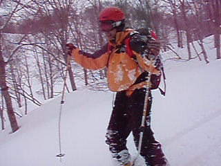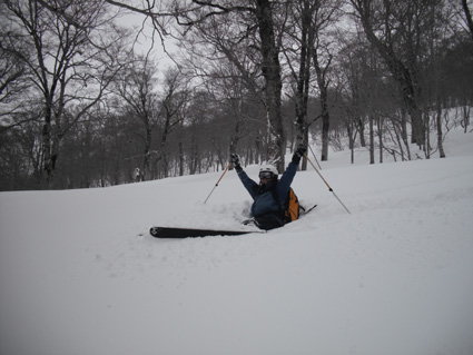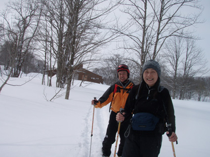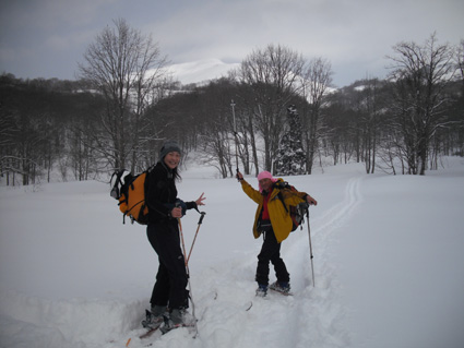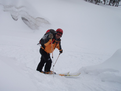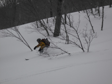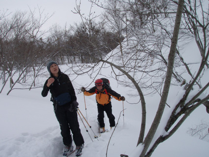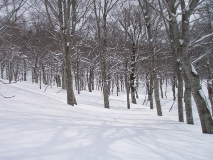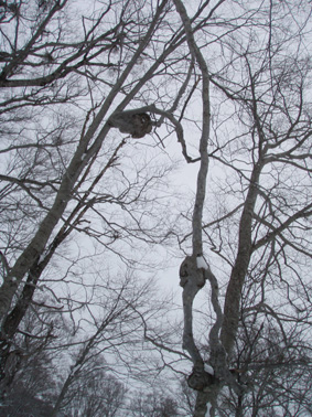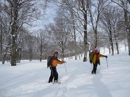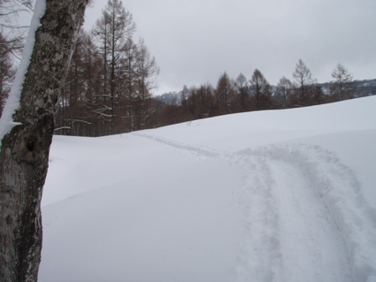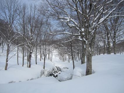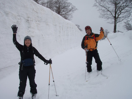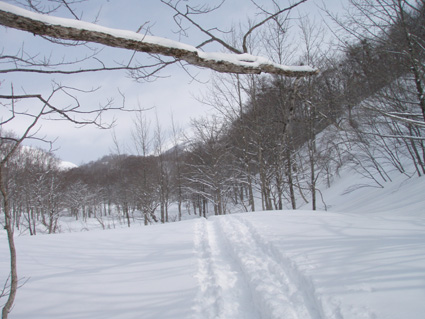![]() 湯殿山〜姥ヶ岳 天気予報に反して道中は陽射しもあります 月山湖を過ぎて志津温泉まで来ると小雪もちらつくが湯殿山や姥ヶ岳がクッキリと見えてた 強風が吹く予報も外れ 穏やかな山には続々とバックカントリーを楽しむ人が訪れます 私達は早々にスタートすると昨晩に降ったと思われる新雪が30cm ラッセルも軽い雪でさほど苦になりません 月山ネーチャーセンターを過ぎるといよいよ姥沢めざし登りだ! 姥沢駐車場の手前は斜度があり何時もアルバイトを強いられる・・・ 駐車場で昼飯&泡タイムを過ごしいよいよ滑降開始 軽い雪で今時期こんなに板が喜んでくれるのは珍しい 辛い登りも楽しい下りは一瞬で終わってしまうのが山スキーの醍醐味か! 素晴らしい月山の山肌でした ![]() 雪の 回廊 志津温泉通り 志津温泉まで行く道は雪の壁です 青空に聳える湯殿山〜姥ヶ岳〜月山は素晴らしい眺めだ! ![]() 行き止まりの場所 準 備 温泉街を過ぎると直ぐに行き止まりとなる 其処にはバックカントリーを楽しむ人達が停めたと思われる車が所狭しと並んでます ![]() 林道から山肌へ ネコヤナギ 道路から外れてネーチャーセンター方面へ雪面を進む 目に飛び込む木々の芽はふくらみ、ネコヤナギの木は綿帽子の殻を破り顔を出してます ![]() 穏やかな中の歩き 新雪を歩く 無風の気持ちいい陽射しの中を話しを楽しみながら歩きます 予報の雪や強風は何処に行ったのでしょうか・・など・・予期せぬ好転に浮かれるメンバーでした ![]() 芽吹く木々を見るGonちゃん ネーチャーセンター到着 ネーチャーセンターは雪に閉ざされて雪囲いの姿は残ったままですが・・・ この雪囲いもGWまでには外され活気が戻るのでしょうね! ちょうどその頃に湯殿山や目線にある遠望がガスに被われ始めた ![]() 此処から姥沢方面へ登る 元気なHaruさん〜Gonちゃん 木漏れ日降り注ぐ真っ白い雪面を足下に感じながら景観を楽しみ進みます ![]() 影 絵 ![]() 石跳沢は口を開けてる ブナ林は気持ちが良い 少し登ってくると沢が開けてる所も出てきた 豪雪地帯と言われてる山形県の月山にも間もなく春が訪れる 沢は雪解け水を運び、月山湖の貯水を助け大地を緑にする恵みの源なのだ! ![]() 湯殿山を後方に一枚 「カシャッ」 ![]() 綺麗な新雪を踏みしめて歩く ウサギの足跡を発見 ネーチャーセンターも離れ適度な斜度の所から斜面に取り付く 急斜面を登り切ると緩斜面のアップダウンが現れ ブナ林のマイナスイオンが満ちあふれた山肌は疲れを感じないで進むことが出来た ![]() 寝てるのはSei 雪の回廊へ出た 緩斜面も終わり姥沢駐車場に取り付く最後の急斜面が現れた 此処ばかりは疲れを感じないとは行かない場所です・・・(苦笑) 小屋の裏手に回らずに道路に出た 除雪がされた道路は段差もあり慎重に下る、5m位はあるだろう雪壁に何故かウサギが 登ろうとしたのか足跡の先に爪痕が刻まれてました・・・心和む一コマです ![]() 姥沢駐車場へ到着です 重機が並ぶ駐車場 駐車場に着くと登り始めには見えてた姥ヶ岳もガスに閉ざされ姿は在りません 駐車場の除雪をするた為の重機が・・?4台行儀良く並んでました 小屋の裏手に回り腹減ったと昼飯の時間になる 今日は金色の泡を頂きます、何を飲んでも山で頂く泡は絶品の味で至福の時が流れるので在りました ![]() Seiが滑る こんな事も! ![]() Gonちゃん 奇声を上げて下るGonちゃん ![]() 気持ちいいと戯けるGonちゃん Haruさん 続いてHaruさんが滑降開始です ![]() 飛ばします 雪まみれのHaruさん 軽い雪を蹴り豪快に下って来ました ![]() Sei 美味しい雪です 最後にSei なにも言えねえ〜 気持ちいい雪だや〜〜〜〜〜 (^O^) ![]() あっと言う間の滑降でした ブナ林に在る小屋 広い林間の豪快な滑りは あっと言う間に終結です この醍醐味を味わうために辛い登りがあり優しい林が待ち受けてるのだと思う! ブナ林の探索コースに在る小屋は尖り屋根を雪面に出してました ![]() 瘤を持つ木 ヤドリギが多いですね! ブナ林の中にはヤドリギが多く見られ不思議な瘤を持つ木も発見する 優雅な月山スキーも終わり車のデポ地に着いたのはPM1:15分で、之から始まる第二弾・・? それは志津温泉にある「えびす屋」の山菜蕎麦と温泉に浸かることです 温泉に浸かってる間に蕎麦を用意していただき風呂上がりに食べる山菜蕎麦&泡は止められない Seiは運転のためにノンアルコールを美味しく飲みほしました・・・(笑) Haruさん Gonちゃん 次回はコースを変えて滑降を楽しむべない ・・・Sei・・・ 戻る |