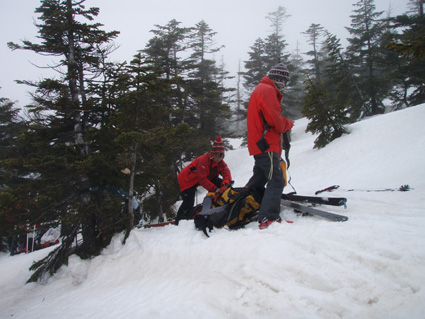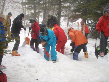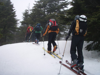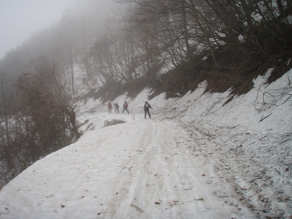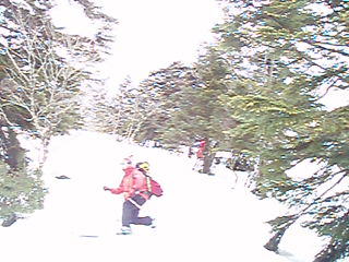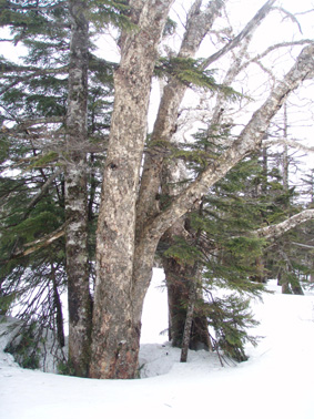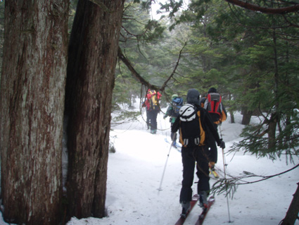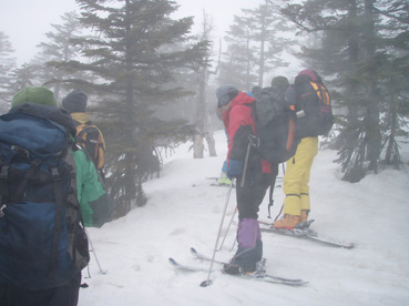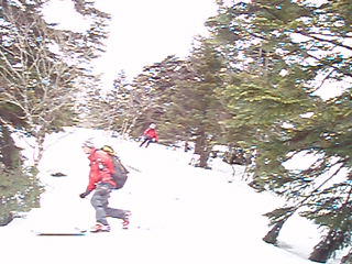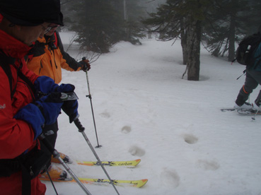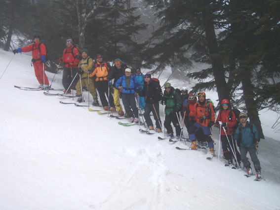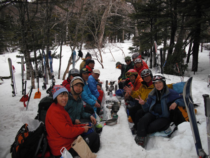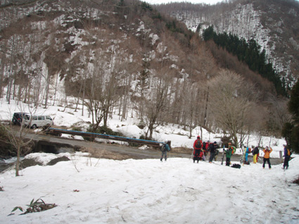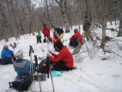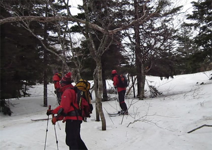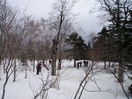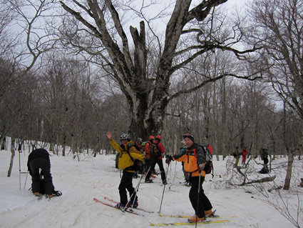 ![]() 磐梯吾妻スカイライン(雪の回廊) 兎平駐車場 煙突おじさんの企画されました 東吾妻山〜小倉尾根下り山スキーツアーに参加しました 総勢16名の参加者により 山は色とりどりのウエアで花が咲き・・・ 歓声を上げての滑降は尾根下りの醍醐味を存分に楽しむ事が出来ました 朝の雨と風でどうなるのかと心配もしましたが 参加者が素晴らしい山仲間と言う事で・・・?・・・・(笑) 林間を滑るのには殆ど影響が在りませんでした これもリーダー煙突おじさんのコース設定のお陰様と感謝いたします 参加者の皆さん有り難うございます ![]() 集合写真(二人足りません) 参加者 煙突おじさん・郡山山岳会さん8名・ぽこ&けんいちさん・山で会えたらさん二名・游山3名・・・ 総勢16名の参加で東吾妻山〜小倉尾根下りに出発です ![]() 樹林帯を登るメンバー 朝の雨も上がりガスが出てるが山歩きには恰好のツアー条件と言いましょう・・(苦笑) 風が強いために予定してた山頂経由を変更して兎平からスカイラインを1kmほど土湯方面へ下り 斜面に取り付いた 其処から緩斜面の登りを1900m地点まで目指すことに成ります ![]() 熊の足跡を発見 登り始めて30分ほど過ぎた頃に先頭の煙突おじさん達が笛を鳴らし始めた 何事が・・? と追いついて見ると大きな熊の足跡が点々とある 勢いの良い下りの足跡(右)とユッタリ歩きの大股の足跡が爪痕まで見えてた 近くに潜んでる可能性があると数人が笛を一斉に鳴らしたのです ![]() 滑降地点1900mまで間もなくです シールを外す(1900m地点) 標高を上げるに従って木々を吹き抜ける風の音が大きくなり林間を通り過ぎてゆく 山頂は此の分だと強風間違いなし、1900m地点まで来ると寒さで先ほどまで脱いでたウェアを羽織りました ![]() 滑降準備 ガスの係る樹林帯を下ります リーダーの煙突おじさんが山頂へは行かないで此処から下りますと話されると 游山メンバーからハーイと元気の良い返事(登りは短い方が!)・・・笑 ![]() ツリーランの途中で記念写真 広い林間下りは気持ちが良い・・・ 斜度も適度でザラメ雪の滑りは板が喜びます 列を作り滑降を楽しむメンバーが勢揃いして記念写真を一枚撮りました! ![]() ランチタイム(スノーテーブル作り) 楽しいランチタイムです 1550m地点で昼飯タイムになりました メンバーがスノーテーブルを作り二列に並んでのランチは豪華な食材が次々出てくる 私達(ゆうざん)は行動食程度の食材しか無く皆さんの料理を遠慮無く頂き満腹です 皆さんご本当に馳走様でした m(_ _)m ![]() 立ち止まり後続者を待つメンバー 読図にてコースを確認する ↑ 煙突おじさんから送られてきました写真を追加UPいたしました (有り難うございます) ![]() 見事なダケカンバ 休 憩 山腹には巨木のダケカンバが多く枝振りもお見事だ! ![]() 尾根を歩く 鳥子平(大ブナの木) ツアーで特に感じたのが参加者の多くの方が立ち止まると必ず地図とコンパスで方位を確認する姿です Seiは最近GPS頼りで地図を確認する事が少なくなりました反省です・・・ ![]() ガスが切れて山裾が見えた 気持ちの良い林間 下山途中からガスが切れてきて山裾が見える 磐梯山や猪苗代方面の展望を空想の中で白いカーテンに映し出してみた 楽しい滑りの一コマ ↓ ![]() ![]() ![]() ![]() ![]() 滑りの写真は此処まで!(全員の写真が無くてすみません) ![]() 最後の休憩です 唐松林 鳥子平で最後の休憩を楽しみました 此処からは林間も狭く斜度も在り慎重に下ります井戸尻川を眼下に見て林道へ! ![]() 井戸尻林道へ下りる 皆さん元気に林道へ下山しました ロングコースの尾根下りも間もなく終わりです ![]() 井戸尻川取り付き位置(橋の所へ) 林 道 林道へ係る橋の所へドンピシャのコース取りに皆さんの読図に感心したり感動したりです 何時もと違う行動や食事タイムに素晴らしい一日を感じることが出来た ![]() 杉 林 車のデポ地へ到着(浦谷地) 最後に杉林を進むと車のデポ地に着く デポ車に乗り箕輪スキー場の駐車場へ移動した 反省会は母成温泉です 温泉に浸かり今日の行動や山談義に花が咲き長いお風呂タイムでした 初めてあった方が多い中で道中の和やかな雰囲気は山仲間ならではのスキーツアーと感謝いたします 16名の山仲間に感動の一日を有り難うございます ・・・Sei・・・ 戻る |