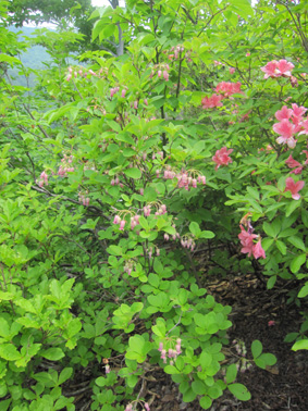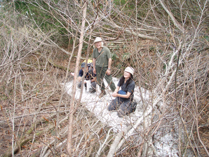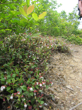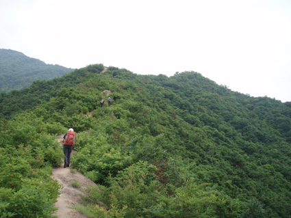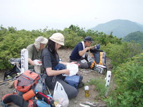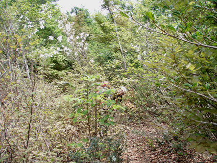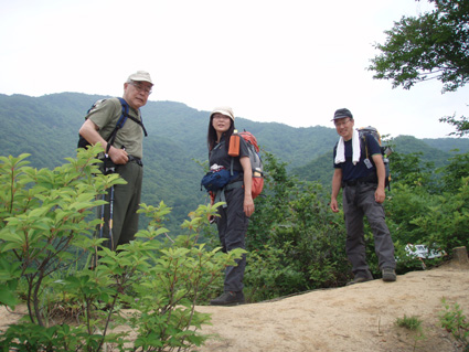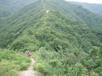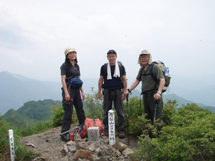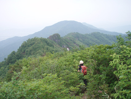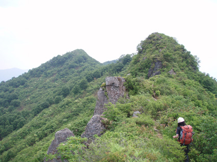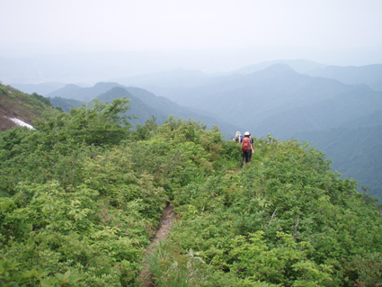 ![]() 登山口(Ariさん〜Suーさん〜Gonちゃん) 滝見台にて! 13日は新潟県に在る唐松山〜上権現堂山へ登りました 蒸し暑く無風で陽射しの中の登りは地獄の山です・・・(笑) 登り始めから汗がしたたり落ち 水分補給が続きます 稜線の分岐に出れば風もあるだろうと甘い考えのSei 見事に予想が外れ稜線歩きも地獄の蒸し風呂だ! それでも展望の良い歩きと足下の花が力を与えてくれる 私達は所々に現れる残雪を頭に乗せて涼をとり山頂を目指します 猫岩を巻き小さなコルを通過すると山頂へ着いた。 山頂は狭いピークだが360度の展望は申し分在りません 南に八海山〜越後駒ヶ岳〜荒沢岳 左回りに会津朝日岳や浅草岳がボンヤリと霞んでる 私達は30分の休憩で山頂を後にしました 下山は急ぎ足で稜線を下る 時々止まるのは太いワラビが呼び止めるからだ・・・笑 稜線分岐で大休憩 Seiはザックをデポして上権現堂山まで足を延ばしました 登山口に着いたのはPM3:40 麓にある中子沢温泉で汗を流して帰路についた。 ![]() 不動滝 ウラジロヨウラク & レンゲツツジ・・・? 最初に着いた高台は滝見台! 豪快に流れ落ちる水流と涼しげな音が聞こえるが・・・朝から地獄を味わう暑さです ![]() 尾根を登る 手の又沢 尾根に出ても無風状態が私達を待ちかまえてた ![]() ![]() 霞んで見える越後駒ヶ岳 無風の稜線歩きは地獄だ! 湿度が高く空気中の水分が邪魔をするのか山々が霞んで見える ![]() ![]() 上権現堂山 タムシバに隠れるGonちゃん 稜線より上権現堂山を振り返り眺めた 登山道にはタムシバの花が多く したたり落ちる汗を他所に涼しげに感じることが出来る ![]() ![]() 猫岩に近づく! 奥に唐松山のピーク 猫岩はピーク越えを諦めて巻いて進む 奥には目指す唐松山のピークが間近に見えてきました ![]() ![]() 雪渓で戯れるメンバー 山頂(Gonちゃん〜Su−さん〜Ariさん) 登山道脇には雪渓が至るところにあり涼をとることが出来た 雪を頭に載せて帽子を被ればインスタントクーラーの出来上がりです 溶けた雪は顔をつたわり胸元を通過してパンツへ到達する、まるで・・○らした様でした・・・・(笑) ![]() ![]() 楽しい泡タイム 下山 山頂は素晴らしい展望です 疲れた体に泡を注ぎ込むとイッキに力が蘇るSei 霞んで見える山々を視線が追いかけた。 山頂滞在は30分で下山開始 南に八海山〜越後駒ヶ岳〜荒沢岳 左回りに会津朝日岳や浅草岳がボンヤリと霞んで見ることが出来た ![]() 長い稜線歩き(中央の尖りが上権現堂山) 猫岩(鈴が付いてます) 下山は長い稜線歩きが待ってます 遠望に見える上権現堂山の分岐が尾根筋だ フーと溜息混じりに眺める景色が又霞む! ![]() 猫岩の全景 猫岩は岩越しにも登山道が在ります しかし疲れた体に無理は禁物と巻き路を通過した ![]() 鏡池には残雪が在りました 今日の一番楽しみは何と言っても残雪の場所です 雪と水が在る場所は涼しい微風が感じられる ![]() 上権現堂山 山頂 稜線から尾根筋に出る分岐が上権現堂山の分かれ目だ! 大休憩を取ることにした為にSeiは上権現堂山まで一っ走り行ってくることにした 登山道を登り切り平らな場所から一旦下り、登り返すと山頂に着いた 広いピークは林に囲まれて展望は期待できない・・・・? 三本の柱に吊り下がる鐘に時を感じる事が出来ました 蒸し暑く無風の山歩きは蒸し風呂の中のようで地獄である それでも展望の良い稜線歩きが心を爽やかにしてくれた 唐松山は奥の深い素晴らしい山でした 秋の澄み切った空の下に又来てみたいです Ariさん SU−さん Gonちゃんお疲れ様でした ・・・Sei・・・ 戻る |