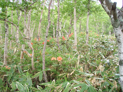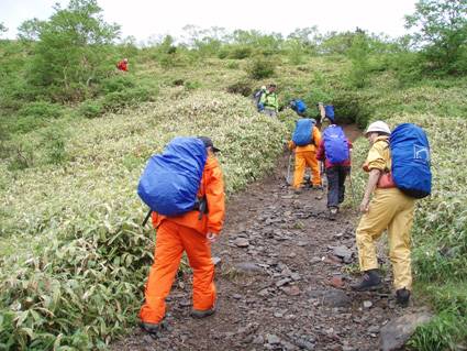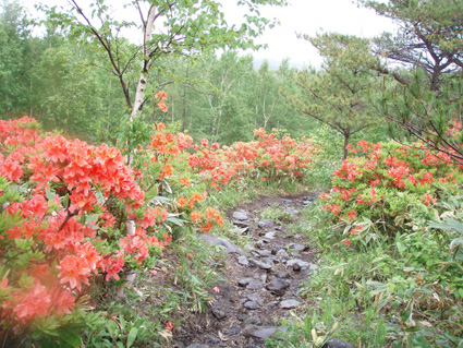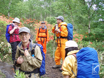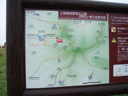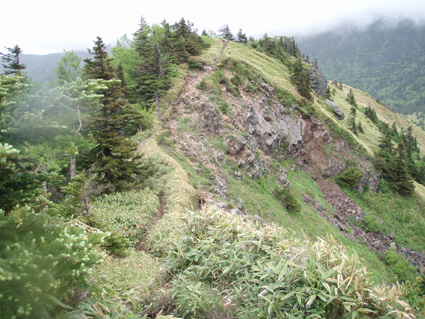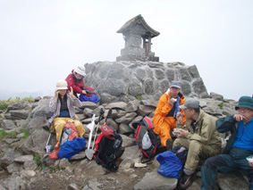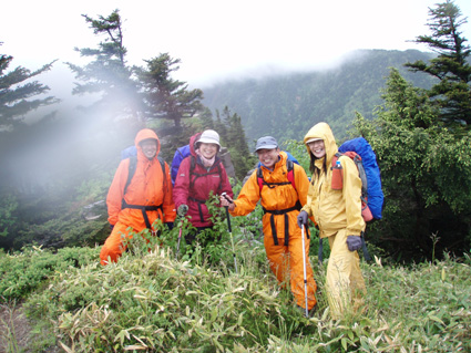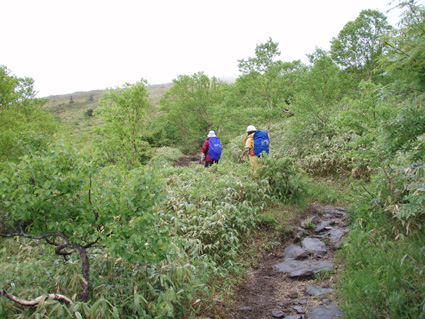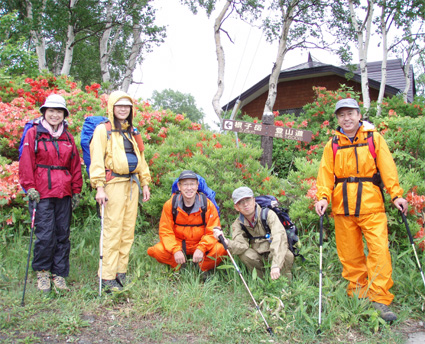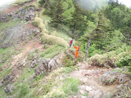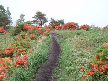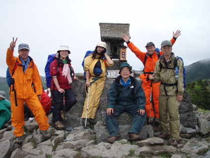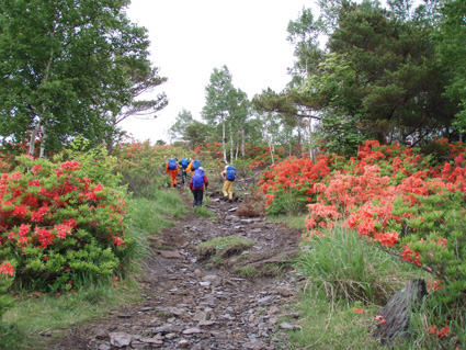 ![]() 登山口(Yukariちゃん・Gonちゃn・Su−さん・Sadaさん・Haruさん・一人足りない) レンゲツツジの登山道 登山口に着いたのはAM10:00と遅いスタートになりました 雨の降る中を根子岳〜四阿山を一周する予定です ![]() 菅平高原スキー場が眼下に! 案内板 山の斜面は赤く染められレンゲツツジが最盛期です 眼下の山々にはスキー場が多くピークから伸びる滑降斜面が放射線の様に作られてる ![]() 白樺の山肌にツツジが咲いてます 休 憩 白樺林の登山道には高山植物も多く 疲れを感じないで歩くことが出来た ![]() 白樺林 森林限界は直ぐだ 笹で被われた斜面から顔を出すオレンジ色のツツジが点々と現れます 白樺の斜面を過ぎると木々の背丈も低くなり森林限界に! ![]() 道標前(Haruさん・Yukariちゃん・Su−さん・Ariさん・Gonちゃん・Sadaさん) アルプスは雲の中 笹の斜面に着くと遮る物も無く視界良好だ・・・・が・・・・遠望の山々を見ることは無かった ![]() 山頂直下は笹で被われてる 稜線の道標 山頂直下は風が強く 雨も足下から舞い上がる様に吹き付ける ![]() 山頂(Haruさん・Yukariちゃん・Gonちゃん・Ariさん・Su−さん・Sadaさん) 四阿山は雲の中でした 山頂には多くの登山者が居ます 私達も隠れるところのないピークで祠の土台に守られて食事にしました 東には之から登る四阿山が頭を隠して裾野だけが見えてる ガスが舞い風の強さを伺うことが出来た ![]() 休 憩 ![]() 四阿山へ向かうメンンバー 奥に四阿山 休憩を済ませて四阿山へ向かいます ![]() 根子岳から北へ延びる稜線 引き返した場所で写真を撮る ヒューヒューと風が通りすぎる音も高くなり 稜線歩きも腰を落として歩く姿勢になるメンバー 四阿山の山頂方面はガスが忙しく動いてる 遅い出だしと之からのコース時間を考えて無理は禁物とリーダーのSu−さんが此処で撤退を決めた ![]() 西斜面が崩れてる 振り返り眺める 之から四阿山に登る気持ちを切り替えて稜線の風景を楽しんだ ![]() 山頂直下の斜面 下 山 下山は足取りも軽やかだ・・・・・ 何でか・・・・? それは今日の宿で宴会が待ってるからなのです・・・・(笑) ![]() レンゲツツジが登山道を飾ります 駐車場近くの斜面にはツツジの群生地があります 小さなお花さんも多く雨に濡れて元気な姿を見ることが出来ました 根子岳から四阿山を一周するコースで登り始めたが・・・ 根子岳の山頂から稜線に出た所で強風と足下から吹き上げる雨の為に撤退しました 今日の宿は「ロッジ 花紋」だ! 早く宿に行き皆さんと宴会を楽しみましょうね! 明日の湯ノ丸山へ続きます ・・・Sei・・・ 戻る |