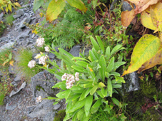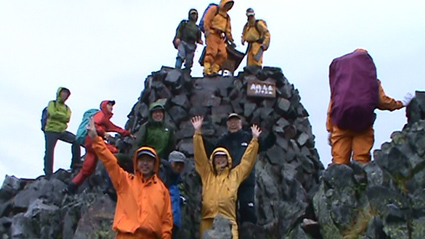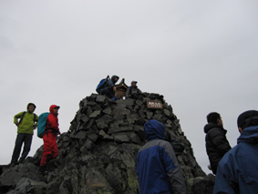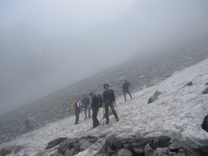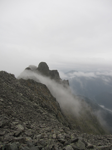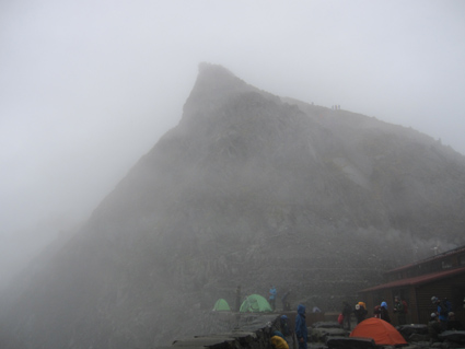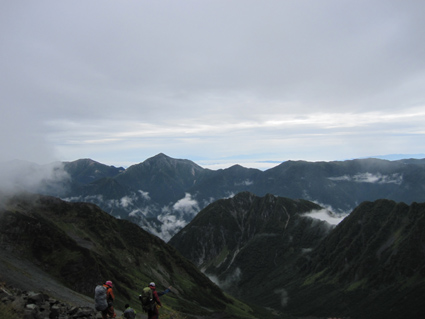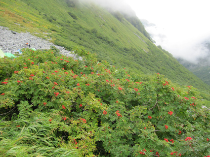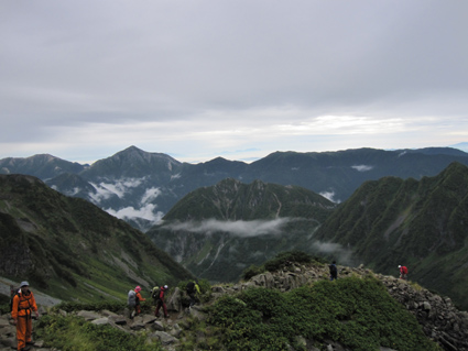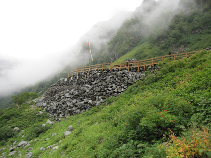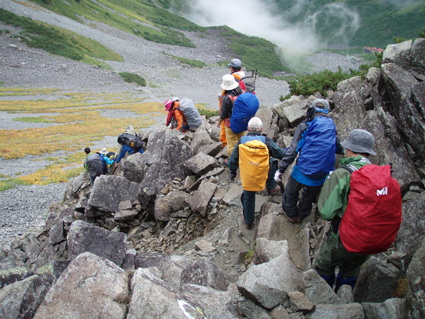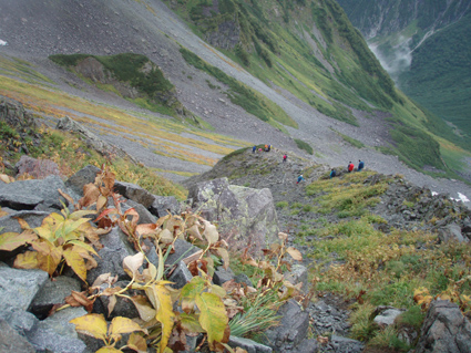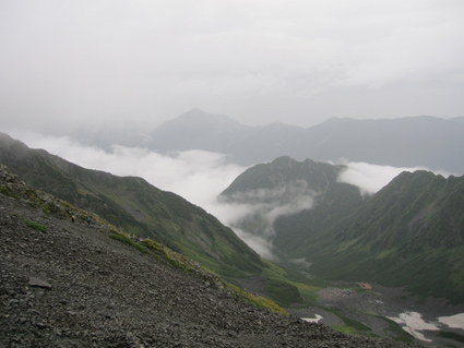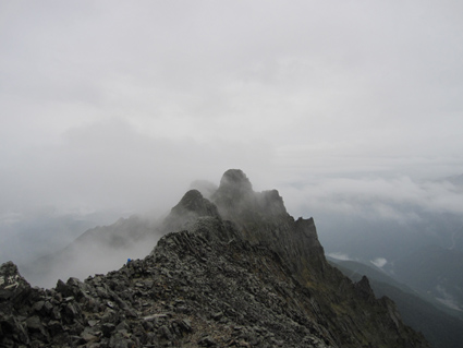 ![]() 奥穂高岳に登る登山者 雲が動く 夜中に屋根を叩く雨音で目覚めた いや〜な予感が的中し 雨の中で行動することになりそうだ! 外に出るとウエアを着て次々と山頂を目指して登る登山者の姿がありました ![]() 山頂には登山者が! ジャンダルム 私達も朝食を済ませて雨の様子を見ることにした 六時を回った頃に雨も小降りになる、それでは「いぐべ」と山頂を目指して梯子に取り付き 鎖場をよじ登り大岩に張り付いて、冷たい雨の洗礼を受けて山頂に着いた ![]() 山頂のケルン前にメンバーの姿 Haruさん 山頂には多くの登山者が祠のあるピークに登るため順番待ちです 私達はケルンの手前で記念写真を撮り下山した ![]() Haruさん〜一匹さん〜Sadaさん Gonちゃん ジャンダルムを背景に皆さんポーズです ![]() ジャンダルムの神秘的な姿 道標 二年越しで登った奥穂高岳は今回も雨の中でした ![]() 下山の様子 ガスに覆われた奥穂高岳 ガスの中を小屋まで下りる 振り返ると、うごめくガスの中から奥穂高岳の姿が霞んで見えた ![]() 集合写真(Ariさん・Sadaさん・Haruさん一匹さん・Sei・Gonちゃん) 小屋の前で写真を撮りいよいよ下山です ![]() 波打つカール 雲間の常念岳 ザイテングラートを慎重に下り 眼下の様子や目線に広がる尾根を眺めて穂高岳を後にする ![]() 草紅葉の斜面 ザイテングラート 紅葉は未だでしたが斜面に色付く黄金色が優しく語りかける 再会を約束してくれてるようでした ![]() 展望を追う! 足下が秋色に! 雨も上がり少しずつ視界も広がる ![]() 急斜面の下山 最後に大岩と抱き合いながら高度を下げた ![]() 雪渓 お花畑の斜面 カールに残る雪に哀愁を感じ 斜面の花に心が時めく・・・ ![]() お花さん ![]() 涸沢ヒュッテ 癒しのキジバト 昨年の風雨に打ちのめされて、お世話になったヒュッテの横を通り足を進める 予定ではパノラマ新道を下山するはずでしたが・・・ 一時間半の遅れを取り戻すために往路を戻る ![]() 梓川の主 山の主か・・? 横尾を過ぎて間もなく梓川の主が河原に鎮座してた 我こそも山の主なりとでも言いたげに大きな猿がオオカメノキの実を頬張る姿が木の上に・・・(笑) ![]() 梓川に動く黒い物体(動画にリンク) 3日目は奥穂高山荘の屋根を叩く雨の音で目が覚めた 二泊三日の山旅も無事に終了 沢渡温泉(高桑荘)で汗を流し、温泉のお婆ちゃんにドリンクをご馳走になり帰路につく Ariさん・Sadaさん・Haruさん・一匹さん・Gonちゃん お世話になりました ・・・Sei・・・ 戻る |