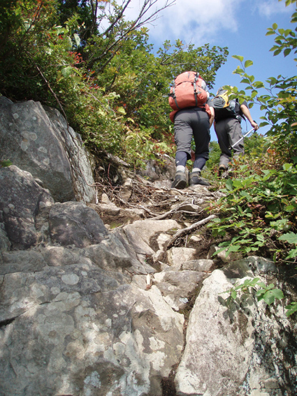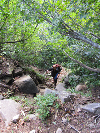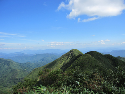 ![]() 守門岳(流れるような曲線!) 秋晴れの中で守門岳に登ってきました 大白川コースは登りはじめから急坂で危険箇所もあり注意が必要だ! 登山道の岩は滑りやすく、其処に加えて粘土質の登山道に急勾配と来てれば・・・です・・・(笑) 途中には歓迎しない長物(ヘビ)が数カ所に陣取り私達を威嚇します 先頭を行くSu−さんは悲鳴を上げてバック・・・、そんな事件も楽しみながら登る 山頂の展望は申し分在りません日光白根山を始め越後三山などなど360度のパノラマを楽しみました 6コースある登山道から次々と登ってくる登山者で賑わいを魅せる!山。 ![]() 登山口(Sei〜Su−さん) 登山口の道は昨晩の雨で泥んこ溜まりが出来てます しかし朝から秋晴れが広がり、登山日和と言う言葉がピッタリ似合う出足となりました ![]() 布引ノ滝コース 登り初めて直ぐに布引ノ滝へ行く分岐に出る 此処は私達が予定してたコースです・・・Ga・・・ご覧の注意書き!で敢え無く直登することになった ![]() 最初に出た展望の場所から守門岳 此処のコースはとにかく斜度があり滑りやすいのだ! 水分補給をこまめに取り最初の開けた場所に出た、そこから見る守門岳は遙か遠くに見える ![]() 最初の休憩です 回り込むように近づく稜線 雨に濡れた登山道に惑わされながら進む、小さな岩も滑る・・滑る・・・滑る 足下に注意して進めば時折出てくる長物(ヘビ)が視界に飛び込み先頭を行くSu−さんが悲鳴を上げて吹っ飛んできた 「うひょ〜〜〜」 「へ へ へ ヘビ だ〜〜〜」・・・(T_T) 真っ青になり戻ってくる顔を覗くと、このまま気絶してしまうではと心配になりました・・・(笑) ![]() 切り立った岩場を進む! 斜度のある岩場! 危険な箇所も在ります ![]() 目線になってきた山容 粘土質の登山道は滑りやすい 一歩一歩 滑る道を回り込むように登ってゆくと景色が変わり、曲線が近づく・・・ ゴツゴツとした山容も次第に表情がハッキリし正体が確認できた ![]() 秋色に! 間もなく稜線に出ます 足下の木々も色つき始めてる 疲れた体も秋色に勇気つけられ、気力が湧き元気に登るメンバー ![]() ![]() 木々の背丈が低くなる 温度が極端に下がる大岩 高度を上げるほどにブナの巨木も無くなり灌木地帯と成る そこに大きな岩の脇を通る場所に出た なんと! 不思議に! 冷蔵庫の中に入ったような涼しい風を感じることが出来た 滑る岩&急坂 滑る登山道にはロープが多く張られてる ![]() ![]() 秋空に広がるウロコ雲 ピークが目の前に! 分岐を過ぎて稜線に出ると山頂は目の前に 一ノ芝〜二ノ芝〜三ノ芝(分岐)と言われる草地からの展望です 空を見上げれば魚のウロコの様な綺麗な雲が並び、青い天井に魅せられ無我無心に浸る事が出来ました ![]() 浅草岳 山頂から見る隣の高峯は浅草岳だ! 流れるような尾根は見る場所により此程変わる物なのか、田子倉ダムから見る鋭い山容を見ることは出来なかった 山頂(Su−さん〜Gonちゃん〜Sei) 山頂到着! 広い空間も多くの登山者で賑わってます ![]() 連なるコブのピーク 遠望には日光白根山や会津の山々! 広がる展望をおかずに泡で 「お疲れ様〜」 プシュッと栓を開ける音がピークに震撼した・・・ 此処からは無心になり時を過ごし 話すこと全てが真新しく新鮮になれる空間でもある! ![]() 山頂の方位盤 下山時に振り返りピークを仰ぐ! 山頂は小さな岩や小石が並ぶ広場で30人くらいは余裕で楽しめて・・・ 大展望の空間は魅力がありなかなか下山の文字が浮かばない、私達は55分間の休憩を楽しみピークを後にした 守門岳登山記録の動画です 大白川コースは登りはじめから急坂で危険箇所もあり注意が必要だ! 登山道の岩は滑りやすく、其処に加えて粘土質の登山道に急勾配と来てれば・・・です・・・(笑) 途中には歓迎しない長物(ヘビ)が数カ所に陣取り私達を威嚇します 登り切れば其処には大展望の守門岳だ!そして感激のパノラマが広がる 此処からはお泊まりの宿の記録です ↓ ![]() 夕ご飯です 変なSei ![]() 朝食です 食事の部屋 ![]() 旅館の前には浅草大橋 宿の玄関です お泊まりの宿 「音松荘」さんの記録です 音松荘は浅草岳登山口に在り、守門岳の登山者や渓流釣りに訪れる お客様に愛される宿! 優しい女将さんや美味しい料理に癒され、時が過ぎるのを忘れてしまいます お米は魚沼産コシヒカリを使って炊きあげたご飯で最高の贅沢を味わう 熱燗のお酒も手伝って前夜祭が盛り上がりました。。。
