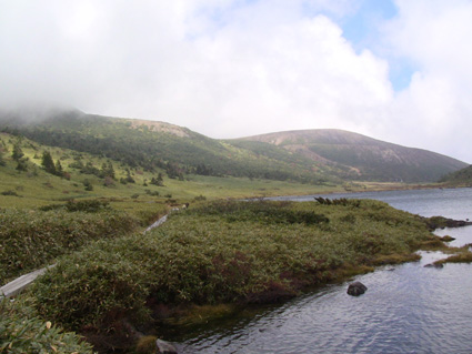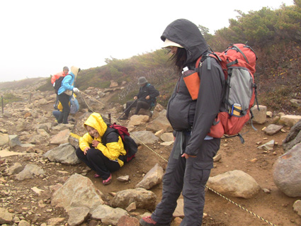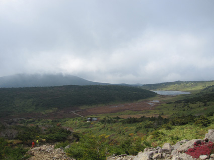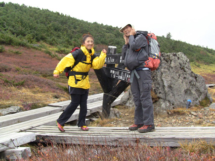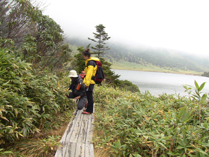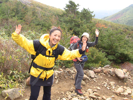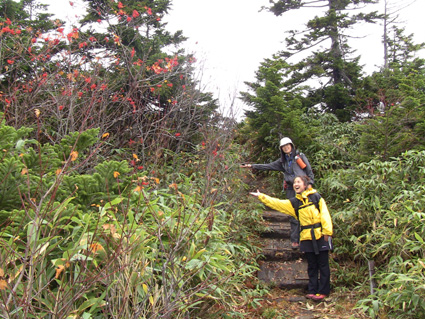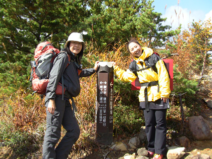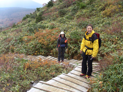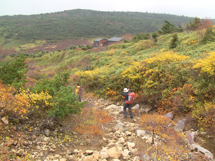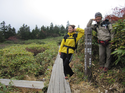 浄土平の駐車場は車で溢れ、やっとの思いで車をデポして強風の中を一切経さんへ向かう、 尾根伝いの登山道は危険なために通行止めだ! 酸ヶ平小屋を巻くように尾根から稜線へ出た。其処はとんでもない強風が吹き荒れてて・・・ ![]() 遊歩道のGonちゃん&郷ちゃん 噴煙を背景に郷ちゃん 浄土平に着くと最初に突風の洗礼を受けた 青空も覗いてる天候だが画面では想像もつかない風が吹いてるのです ![]() 直登コースは危険なために通行禁止です シラタマ 直登コースに来ると危険なガスが発生してるために通行禁止です ![]() 分岐にて(Gonちゃん&郷ちゃん) Sei〜郷ちゃん 蓬莱山の懐にはいると風の影響が無くポカポカ陽気を肌で感じることが出来た ![]() 飾り付けされた山肌 眼下の紅葉は凄いことになってる 本当に盛りなんですね〜 お見事な色つきに歓声を上げて喜びを表す二人の姿がありました ![]() 蓬莱山を巻くように在る木道 吾妻小富士 此処のあたりでは未だ余裕の表情だ! ![]() 元気いっぱいの二人 東吾妻山はガスの中 尾根を進むにつれて険しい表情に変わる郷ちゃん ![]() まだ一切経山は見えてる 突風に行く手を阻まれた二人 もうだめ息が出来ないと座り込んでしまう・・・ 左上の写真では見えてた一切経山のピークも此の後はガスの中に姿を隠しました ![]() 敢え無く下山となる 山頂手前300m位の所で撤退です 「こりゃ〜だめか もどんべか」 と 話すと 逃げるように登山道を下る姿が在りました・・・・(笑) ![]() 紅葉に囲まれて! 稜線を歩いてるときには泣きそうな顔だった二人は、下るにつれて元の笑顔に返る! ![]() 分岐に戻りました 鎌沼の遊歩道 遊歩道の分岐まで来るとご覧の様に元気な姿あり ![]() 奥に見えるのは一切経山 沼の周回コース ガスが忙しく動き山のテッペンを通り過ぎる 見え隠れする山容が風の強さを物語る風景でした ![]() 植物探索 分岐にて!(郷ちゃん〜Sei) 沼の周辺は風も弱くのんびり探索を楽しんだ ![]() ナナカマドを案内する二人 真っ赤なナナカマドの実を見つけてご案内の二人です 「これがナナカマドの紅葉」 ・・・わがってるっちゅうの・・・ ![]() 案内板にて(Gonちゃん〜郷ちゃん) 大きな看板の所で昼飯にするかと思いきや風が強くてダメ! もう少し下ってからにすんべと沼から離れて遊歩道を進む。 ![]() 吾妻小富士を背景に(Sei〜郷ちゃん) カメラアングルが良いから振り向いてとGonちゃんに言われポーズだ! ![]() 紅葉の木々と吾妻小富士 ![]() 下山時の郷ちゃん 泡タイム(郷ちゃん〜Sei) 泥んこ道を下り、合流地点まで間もなくと言う場所で泡タイムだ 木立の中は風もなく泡を片手に、おでんや煮込みうどんを作りガッツリ食べました 強風の中の登山でしたが楽しく紅葉の山肌に甘えることが出来た一時でした 郷ちゃん Gonちゃん楽しがったない ・・・Sei・・・ 動画をご覧くださいね! 戻る |