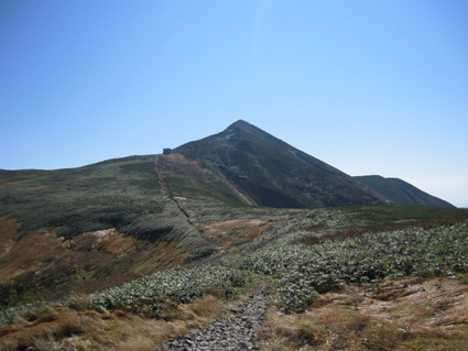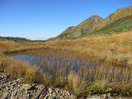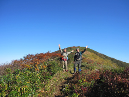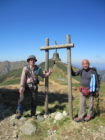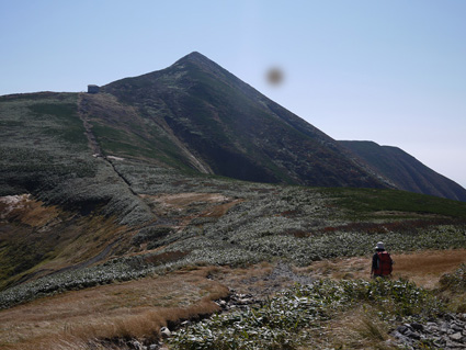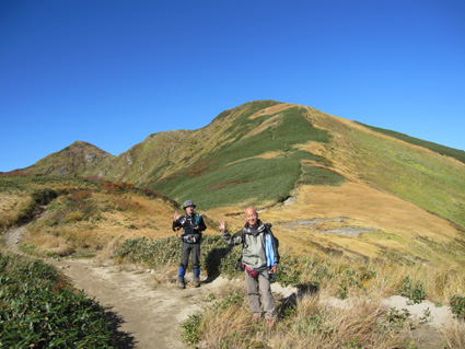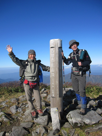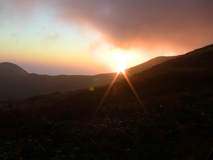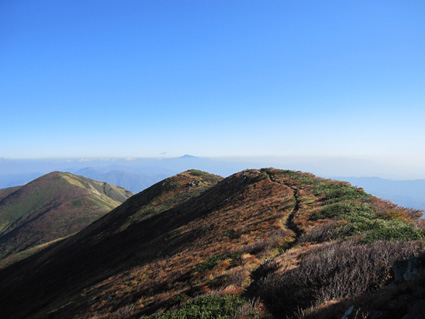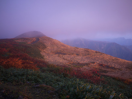 ![]() 西朝日岳稜線から大朝日岳の尖りを望む! 9日は竜門小屋から〜西朝日岳〜中岳〜大朝日岳をピストンでした 昨日と違いザックには行動食と泡が入ってるだけの軽装にて稜線を歩く 山を染める日の出を拝み小屋を出たのはAM6:45分・・・ 快晴無風の登山日和を絵に描いた様な天候です 360度の展望の中に頭を白く変えた尖りは鳥海山で隣に月山が雲の上に出てる 背中には以東岳が陣取り右手に飯豊連邦が輪郭を現してた 左手に見える小朝日岳の断崖は鏤められた宝石のように錦色の光を放す 道中は小刻みに泡タイムを楽しみ大朝日岳にAM11:00到着・・・ 南に見える祝瓶山を眺めて長い休憩をとり至福の時を過ごしました ☆ ☆ 抜ける様な青い空の下で時を過ごす ☆ ☆ 小屋にはPM2:15分に戻り 二日目の宴会突入です 小屋の中はチョー満席状態で一階の宴席は山家さんでいっぱいだ 私達は二階に陣取り隣のグループ(新潟から来た人)と和気藹々に過ごしました ![]() 竜門小屋から日の出の風景 稜線から顔を出した太陽 日の出と共に小屋から出て赤く染まる稜線を捉える 皆さんカメラを構えて真剣なまなざしです ![]() 赤く染まる南寒江山 早朝の西朝日岳 真っ赤に染まる山肌も時間と共に色彩が変わる ![]() 竜門山を出発 降り注ぐ日射し 真っ青な抜けるような天を仰ぎ稜線を進む 其処は正に雲上の楽園で何処を見ても山々山・・・と続く 此程までに奥深い山は東北に来なければ味わうことが出来ない風景だ アルプスの雄々しい切り立った山も魅力だが・・・ 何処まで 行っても 見ても 流れるような曲線が見れるのは懐の深い山に来なければ味わうことが出来ない ![]() 稜線に描かれた道(奥中央に月山) 大朝日岳の尖りが見えた 遠望を眺めると雲間に見える白い尖りは鳥海山、その左手に雲の上に頭を出してるのは月山だ 西朝日岳まで来ると中岳の奥に大朝日岳のピークが独特の形で現れた ![]() 西朝日岳 (Gonちゃん〜一匹さん〜Sei) 西朝日岳でチョイ休み この辺りから気温が上がり始めて上着を脱ぎ捨てる(捨てないで持ってきた)・・・(笑) ![]() 草紅葉に染められた山肌 無木立地帯は草紅葉が盛りです 真っ青な空に浮かんだ山々の輪郭は絵を見てる様な錯覚にしたる事ができた ![]() 中岳のコルで一休み (一匹さん〜Sei) 道中は小刻みに泡タイムを取り入れ のんびりと絶景を堪能します 足取りも軽く ザックも軽く 口も軽くなり行き交う山家さんと立ち話をする姿多し・・・ ![]() 袖朝日岳方面 不思議な煙が出る苔 岩峰波打つ勇壮見て 「こりゃ〜 来た者だけにしか わからんばい」と!」 自慢げに話が飛びだした。 ![]() 霜柱の葉 ナナカマド ![]() 大朝日岳&避難小屋 間もなく尖りへ 中岳を下ると大朝日岳も目の前です 小屋の形もドンドン大きくなり気持ちは駆け出しそうだ ![]() 金玉水 コルに在る名水「金玉水」に寄り柔らかい舌触りを楽しみました ![]() 大朝日岳山頂 (一匹さん〜Sei〜Gonちゃん) 3年ぶりに訪れた大朝日岳 (前回は残雪残る6月15日)山頂で歓喜のバンザイです ![]() 新雪が残る山肌 山頂より平岩山方面 山頂から望む風景は何時間でも眺めてる事が出来た ![]() 大朝日小屋の前で! (一匹さん〜Sei) 小朝日岳 (色つき始めた尖り) 山頂滞在40分 そろそろ帰るんべか〜と下山、小屋の前にある鐘を記念に写真を撮りました。 ※ 最終日は感激の下山をUPいたします 動画をお楽しみ下さいね! 戻る |