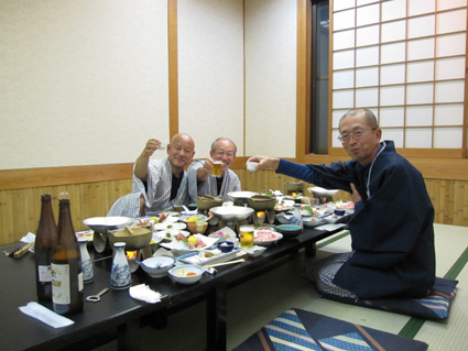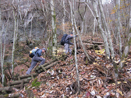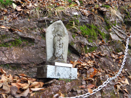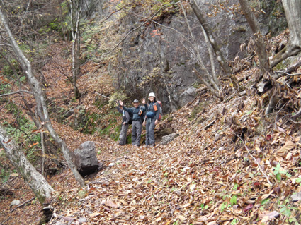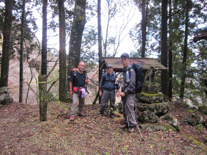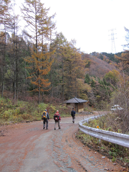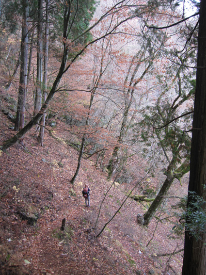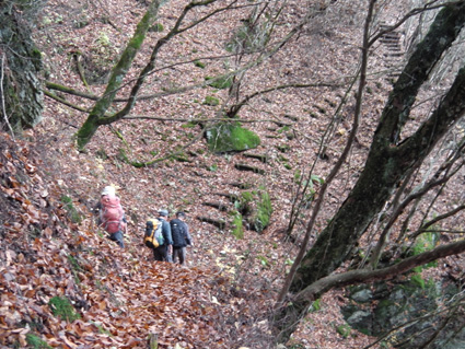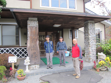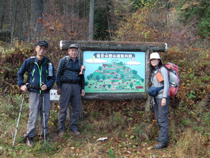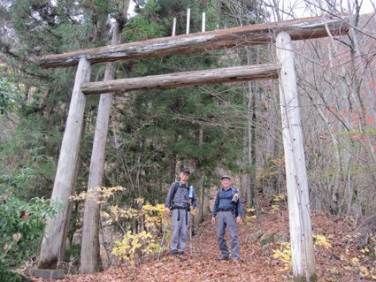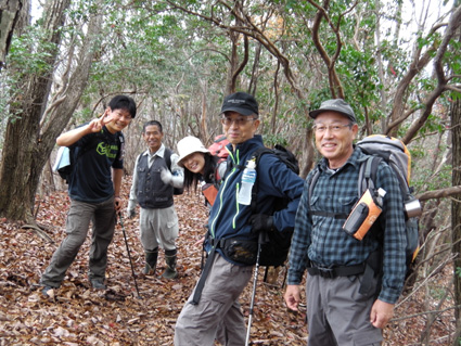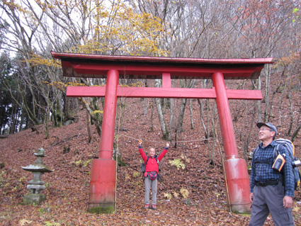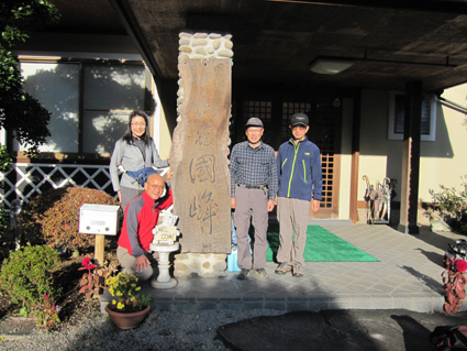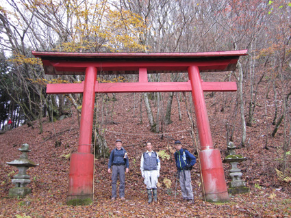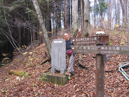1370mで歩行時間2時間30分の山ですが山頂の展望がよく素晴らし山と聞き福島から訪れる 下仁田町と甘楽町の境にあり私達は神の池公園登山口から登る! 紅葉は終わりに近づくも名残色を楽しみながらの登山道は気持ちが良く山頂へは一時間ほどで着きまた・・・ 山頂の大展望を地元ガイドさんに案内していただき至福の時を過ごすことが出来た・・・感激の山になる! ![]() 一ノ鳥居 Sadaさん〜Su−さん 一の鳥居で早くも休憩です ん〜〜〜 何分歩いたのか まあ楽しむことに致しますか・・・(笑) ![]() 分岐のSei 名残のモミジ 休憩も終わり出発前にSeiも記録写真に収まる 落葉した木々の間からはモミジが際だってます ![]() 落ち葉の登山道を行く 積もった落ち葉を踏みしめると「カサッ カサッ」と小気味良い音を奏でる! 重なり合う落ち葉の演奏は足音となり後から付いてくる ![]() 落葉を踏みしめ山頂を目指す サワサワと吹く風が汗ばんだ体を通りすぎ体温を下げた 「 気持ちいい〜 」 木々の空間に見える小さな姿は小枝を飛び交う野鳥だ! 上下に羽を動かしてチュッチュッと囀り まるで山の案内人のように登山道を先導してくれる。 ![]() 道標の直ぐ上に稲含神社がある 折れた登山道に在る道標で一休み 上を眺めると神社の建物を見ることが出来た。 ![]() 階段状の登山道を登る 一旦おりて登り返すと山頂は直ぐです ![]() 幼い少女の冥福を祈る地蔵 山頂の方位板 登山道から滑落した少女を祀る石像で手を合わせて鎖場を進む! 其処は稲含山のピークです ![]() 山頂(Su−さん〜Sei〜Gonちゃん〜Sadaさん) 槍ヶ岳を望む 山頂には数名の登山者が寛いでました 私達が遠望の山々を見てると、山頂にいた地元のガイドさんが案内してくれた お陰様で荒船山の肩に見える槍ヶ岳の尖り等々を捉えることが出来ました ガイドの岩井さん有り難うございました。 ![]() 下山時(連チャンで来た男性〜地元のガイドさん〜Gonちゃん〜Sadaさん〜Su〜さん) 下山は案内を頂きながらガイドの岩井さんと下ります 道中は木々の説明や花の群生時期なども教えていただき大変参考になりました 有り難うございました ![]() 鳥居峠の(赤鳥居)Su−さん〜ガイドさん〜Sadaさん Sei〜Su−さん 赤鳥居で後方を歩いてたSeiを皆さんが待っててくれた 楽しいお話を聞きながらの下りはアッという間に登山口へ。。。 ![]() 鳥居峠側の登山口(Sei・Su−さん・ガイドさん・Sadaさん→Gonちゃん) 鳥居峠登山口で岩井さんとお別れです 帰り際にガイドの岩井さんから2012年のカレンダーを皆さんで頂いたので・・・ Seiは早速・・・川上の山小屋へ飾らせて頂きました ![]() 林道を下る 分岐から駐車場までは林道を下りました ![]() ![]() 織田家位牌堂を訪ねて! 宿に入るには時間が早かったので織田氏史跡保存施設に回る 位牌堂には八代に渡る位牌が祀られてました ![]() 武家屋敷庭園 門 次に武家屋敷に足を運び庭園を探索した ![]() ギャラリーを訪ねて(Su−さん〜Gonちゃん〜Sadaさん) 宿に到着 門の外に在る長岡今朝吉記念ギャラリーで絵を拝見し! 記念に「馬二頭」と言う絵はがきを購入する 何とも気に入った絵で題材の馬二頭も、ほのぼのと心が癒されました ![]() 宴会 豪華な食事 今日の宿「国峰」に到着して早々温泉に入る 宴会前に部屋で盛り上がるメンバー 写真は極秘です・・・(笑) 宿の料理は新鮮な食材のオンパレードです 極旨の料理が次々と出てきて酒も捗る、だんだんテンションが上がり二次会へ・・・と・・・成れば・・・ハハハ ![]() カラオケ開催 翌日お泊まりの宿(Gonちゃん・Sei・Su−さん・Sadaさん) カラオケを貸し切り状態で盛り上がりました 早寝のために酒も残らずに翌日の4峰登山(十二ヶ岳〜中ノ岳〜小野子山〜雨乞山)へ 元気に宿を後に致しました 13日の山へ続きます・・・Sei・・・ 動画をご覧くださいね! 戻る |