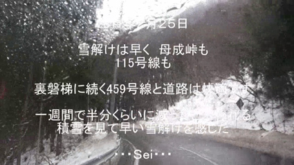 ![]() 母成峠の残雪 怪我の手術も終わり久しぶりに裏磐梯の山小屋まで足を延ばす 峠の雪は極端に少なくなってた ![]() 中ノ沢温泉街 車中のLove ![]() 山小屋近辺の雪は1mをきったか! Loveの専用車 ![]() 山小屋です 雪遊びのLove ![]() 埋もれてるテーブル 小屋の引き戸 ![]() 459号線の積雪 久しぶりに裏磐梯方面に行く 積雪が極端に減ってるのが解る国道沿いの雪景色・・・ 山肌を見ても黒いところが目立ちます 春の訪れが感じられる車窓からの景色でした。 戻る |