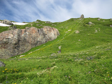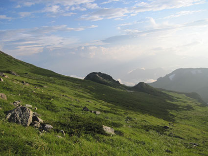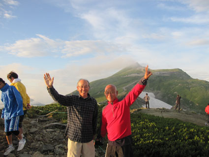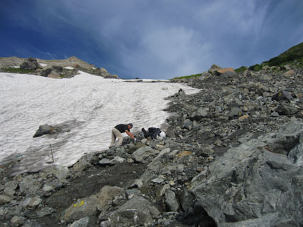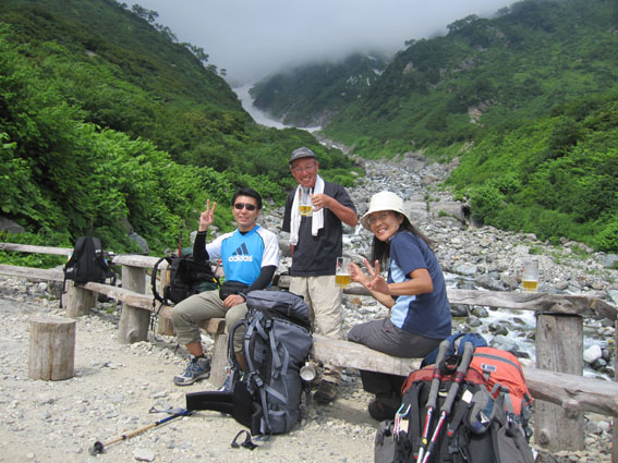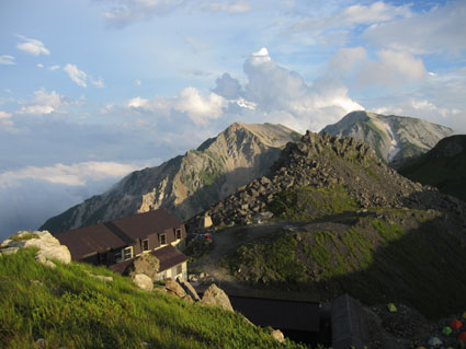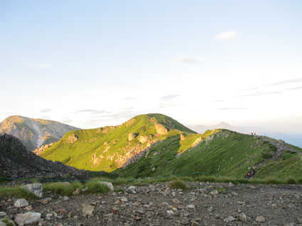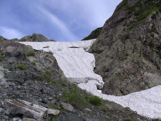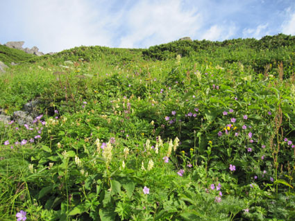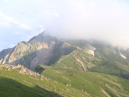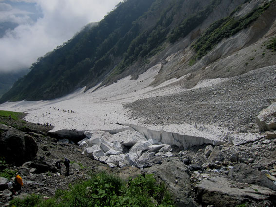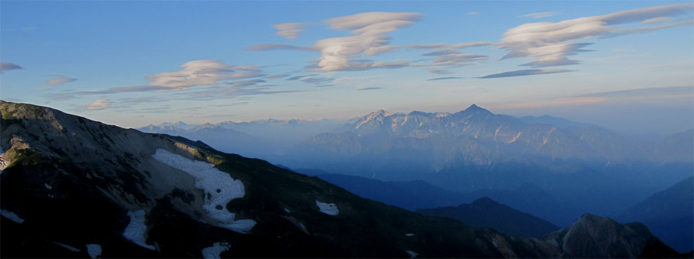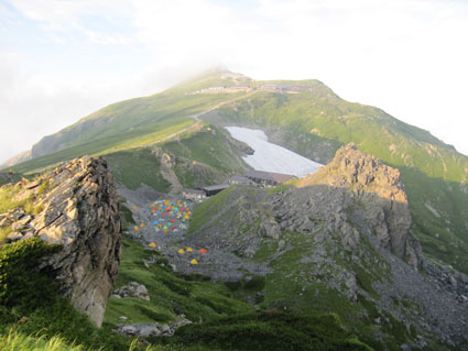 ![]() 稜線より(左奥に槍ヶ岳〜右の尖りが剣岳) 北アルプスの旅・最終日は白馬大雪渓を下る 目が覚めると朝日が降り注いでた、急いで起きて稜線へ走る、其処には突き出た尖りの剣岳の姿が有りました 白馬の大雪渓を下る時に斜面を彩る花々に出会うことが出来る 鋭い尖りのガレ場から視線を落とすと其処には花の楽園が広がってた ![]() 朝日に照らされた杓子岳 杓子岳に朝日が落ちて 杓子岳の切れ落ちた岩峰が赤く染められる、時間と共に赤から解放された山は緑へと姿を変えた ![]() 白馬岳のピークを背景に(Su−さん〜Gonちゃん) 穂高岳〜槍の尖り ヒンヤリとした朝の微風が気持ちまで爽やかにしてくれる 目を細めて遠望を見ると現れたのは、迫力有る山並みは穂高岳から連なる槍ヶ岳です ![]() 剣 岳 稜線の道標 剣岳を望遠で引き寄せる、その迫力は此の地に足を運んだ者にしか感じ取ることが出来ないのだ。 ![]() 頂上小屋 テン場の様子 頂上小屋と肩を並べる杓子岳と鑓ヶ岳。小屋の脇にはカラフルなテン場が在ります ![]() 稜線より西の斜面を捉える Su−さんとSei 下山前の探索を終えた私達は小屋へ戻りました。 ![]() テン場越しに白馬のピーク 杓子岳への縦走路 惜しむ様に風景を脳裏に焼き付ける、また来るねと誓いの囁きと共に! ![]() 左端の高台に登り展望を仰ぐ Su−さんとGonちゃん 先ほどまで居た高台を振り返り剣の前で記念写真を撮る ![]() 剣を背景にSeiとSu−さん カメラを構える登山者 多くの登山者が朝日に照らされる北アルプスの展望に魅了されてました ![]() 小屋を後にします Gonちゃん〜Su−さん〜Sei お泊まりの山小屋ともお別れです 美味しい料理と心休まるお持てなしに感謝いたします。スタッフの皆さん有り難うございました。 ![]() 杓子岳〜鑓ヶ岳 斜面のお花畑 ![]() 頂上小屋脇に有る岩峰を背景に納める 案内板とSei 下山時の私達は笑い声と共に花と戯れた ![]() お花畑の斜面 大雪渓の上部 ![]() 避難小屋にて(Su−さん〜Gonちゃん) 小雪渓 避難小屋では管理人と山談義を暫し楽しむ! ユーモアの在る話し方に爆笑です・・・短い時間でしたが有り難うございました。 ![]() 大雪渓を眼下に見る 雪渓のSu−さん 雪渓に下りたSu−さん 何をしてるかと言うとビールを冷やす雪を確保してるのでした・・・(笑) ![]() 亀裂の入った雪渓 岩室跡 亀裂の入った雪渓は今にも落ちて来そうで怖いです ![]() キケンの文字 崩れた雪のブロック 間もなく大雪渓に取り付く位置に来た デブリが多く見られ落石には注意が必要です 雪渓を下ってるときに左手の崖で大きなドスーンと言う音が聞こえる 登山者が揃って音の方角を見つめる、暫く注視するも石が転がる気配がないので足を進めた。 ![]() 白馬尻にて! Saiさん〜Su−さん〜Gonちゃん 白馬尻小屋で最後の泡タイムです 隣に居た登山者と挨拶を交わす 彼の名はSaiさん、此から山頂を目指し登ると話される短時間の出会いでは在ったが楽しい時間でした 日本に住んでる山が好きな彼とまた何処かで会えるかな・・・・? 有り難うございました。 北アルプスの旅・最終日は白馬大雪渓を下ります 登山道に咲く花々に見送られて足を進めると其処には斜度の有る大雪渓が待ってた。 慎重に下るも転けること数回・・・笑いの中にも緊張が走る・・・ 今回の泊まりは食事も含めて全てチョー満足でした。 白馬尻ではSaiさんと出会い会話が弾む! またお会いいたしましょうね! そして三日間の山旅が集結した。 戻る |