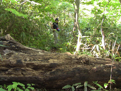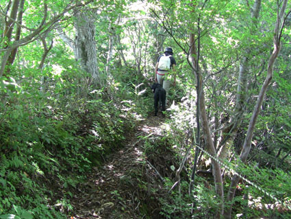 ![]() 登山口(Gonちゃん〜Love) 登山道の様子 台風一過の爪痕が大きく予定されてた山は中止になり、選んだ近郊の山が小白森山です 各地で交通網が遮断されたり土砂崩れなどの被害が出てアプローチの長い場所は時間が計算できない・・・? 此処は比較的しずかな山歩きが出来る ただ三年前に来たときも熊騒動があり地元猟友会の方々が熊を追ってました そこで今日はLoveをお供に入山となった訳で在ります・・・(笑) ![]() 苔とキノコ 倒 木 福島県のキノコは現在、販売や食することを自粛してます 大好きなキノコが出てても食べることが・・? それでも気になるキノコさん 出てると必ず気にとめて語りかける山旅となりました ![]() 色つき始めた稜線 細尾根 山の麓は未だ青い葉が付いてる木々が多く、秋色は未だ先かなと思いつつ高度を稼ぐと なんと尾根では木々の色が変わってるではありませんか・・・ ![]() 道 標 ツキヨタケ 今日の山で一番の難所(ではありません)蟻ノ戸渡りへ着いた 此処は風通しも良いので休憩です Loveの給水は豪快でガブガブ飲み干すカップは見る見るうちに渇水しました・・・・(笑) 私達も持ってきた缶酎ハイを頂きながら、目線に移りゆく秋色を楽しむことが出来ました ![]() ハリタケ 小白森山 山頂(Love & Gonちゃん) 山頂まで来ても誰にも会うことはなかった 少し雲が多くなった来たが天気予報から崩れることは「ながっぺ」と話しながら食事を楽しむ! ![]() 休 憩 山頂のSei & Love 山頂は10人も座ればいっぱいになる空間です 空間は道標のある場所と三角点が在る所の二カ所があり三角点の方が少し展望が良い様に思う ![]() 山頂から(小野岳〜二岐山〜大戸岳) Loveと一緒 隣の二岐山が尖りを披露すれば左に小野岳〜右に大戸岳が陣取ってる Loveも山頂が気に入ったのかご機嫌でした。 ![]() 山頂直下の藪道(急坂) 眼下の二岐温泉 山頂直下の急坂は足下が見えないヤブヤブです 小さな切り株が出てると足を引っかけドスコイと尻餅をつく・・・そんな珍事を数回目にしました・・・苦笑 ![]() 遠望のゴルフ場 何故ワイヤーが絡まる(山頂直下のブナ) 眼下には緑の絨毯を引き詰めたゴルフ場が在ります また尾根上に在るブナの古木にはワイヤーがグルグル巻きに成ってる光景を目にした 何に使ったのか何の為のワイヤーなのか・・・? 不思議な光景です。 ![]() 登山道 見事なダケカンバ 登山道は刈り払いされてなく自然のままだ こんな自然のままの登山道も懐かしく思う 今は何処に行っても綺麗に整備された登山道が当たり前の時代・・・ 自然のまま残されてる登山道を歩きたい方は是非! 小白森山へ「きてくなんしょない」 ![]() 紅葉が始まった チタケが多く出てた山肌 尾根の色つきを見て麓へ下りれば山肌にチタケをいっぱい見ることが出来る 今日も楽しい四時間半の山旅が終了しました 動画をお楽しみ下さい 戻る |