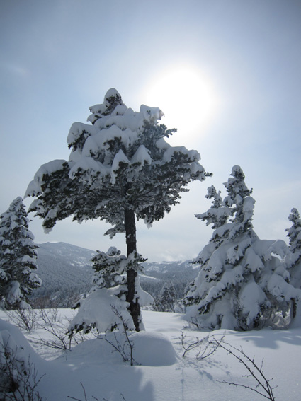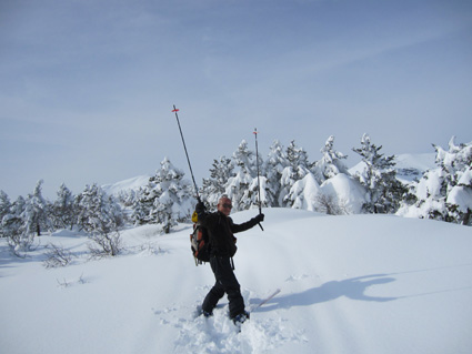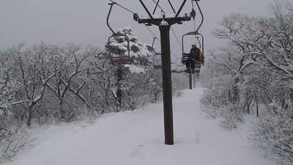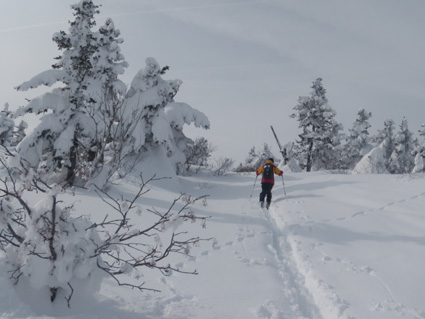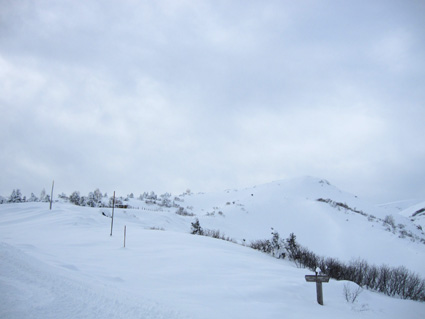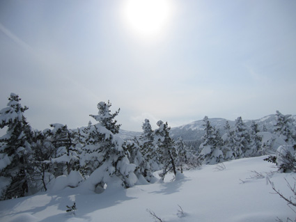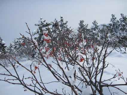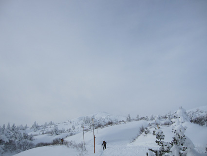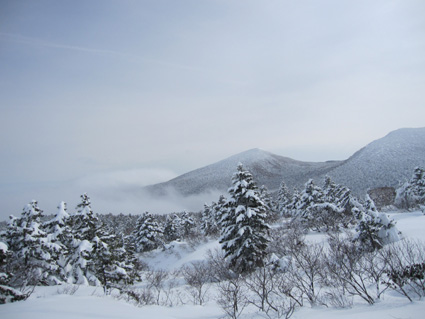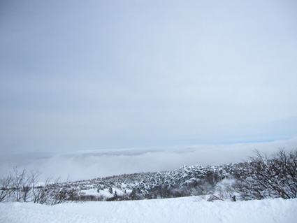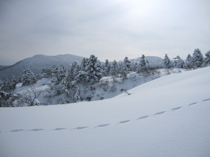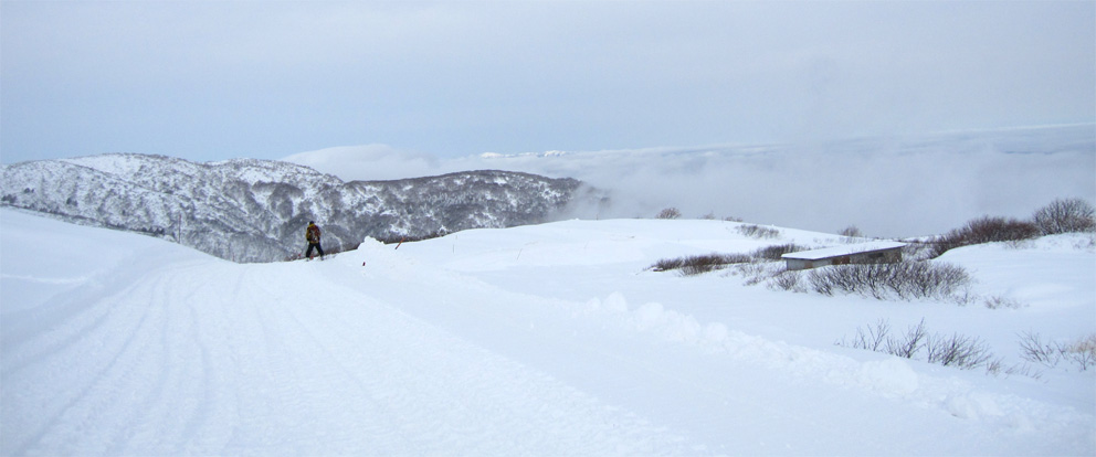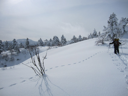 ![]() 眼下の雲海(東方面の風景) 週末は刈田岳へ行きました 高速道路は雪で通行止め・・仕方なく4号線を白石へ向かう AM7:30分に郡山を出て澄川スキー場へ着いたのがAM10:45分でした ![]() ***** 新雪をラッセルして中央の尖り刈田岳へと進む! ***** リフトを3本乗り継ぎTOPへ、ゲレンデを移動中はガスの中で視界不良です ショートカットをして標高1435mくらいまで来たところで雲の上に出た 風もなく汗が噴き出てきます 先行する山家さんの姿も十数人見られるが林道の圧雪された道を進んだようで 雪面にトレースは在りません 20〜30cmくらいのラッセルで苦には成らないで進むことが出来た 此処は今日のように標高を上げると雲の上に出ることが在り、来て見なければ解らない山でもあります 出だしが遅かったためにピークを踏まずに下山したが 怪我(昨年の骨折事故)以来初めての楽しい山スキーツアーでした。。 ![]() ゲレンデのコース案内板 雪上車に乗り込む観光客 ゲレンデハウス前にはボーダーやスキー客の姿は疎らですが 樹氷原ツアー観光のお客様がいっぱいでした ![]() リフトに乗る人は疎らでした 殆ど人の姿が見あたりません ハウス前のリフト乗り場には数十人いたのですが2本目〜三本目に乗るお客様が・・・? 居ない ![]() Sei リフト TOPの道標 Gonちゃん 三本目のリフトを下りて準備をしてると隣で単独の山家さんが一人準備をしてた 出足が遅かったので午後の一時を折り返しと思って山頂を目指す ![]() 氷柱 飛行機雲のようだが・・・? 標高を上げるとガスの上に出て太陽の顔も見られた 歩いてると風もなく汗がにじみ出る 久しぶりの山スキーの為か自然に足が速くなり気持ちが逸ります ![]() 太陽が出てきました ひなたぼっこ 下界が雲に覆われてたために展望を期待しないで来たが山並みが揃い踏みだ! 烏帽子〜杉ヶ峰〜前山〜刈田岳〜五色岳〜北には雁戸山と真っ白い尖りが並んで見えた ![]() 標高 1450m付近の風景 Seiです 此程までに山日和に成るとは・・・思わぬ感動を頂きました ![]() 綺麗に並んだ動物の足跡 ヤブデブリの実・・・? ゆっくり そして ゆっくり 山を楽しむ! 雪面を歩く感触が気持ちいい 動物の足跡と並んで歩く Gonちゃんが足跡を消さないでと後ろからカメラを構えてました ![]() 杉ヶ峰〜前山 後烏帽子岳 雪付きが悪い樹氷原を歩く 眼下のガスが絨毯のように足下に広がる中で、雲上の景色を堪能しました ![]() 遠望の尖り 刈田岳 木立の隙間から目指す刈田岳を捉える 近づくに連れて肉眼でもピークの登山者の姿が解る 樹氷原ツアーのお客様か・・・? ![]() ラッセルは20〜30cm 奥に見える刈田岳(中央) リフト TOPで準備してた山家さんが途中から先行してラッセル交代です ![]() 雪原の目印 眼下の雲海 1520m地点で休憩をして折り返しました 天候はずれの大当たりの山歩きは2012年の山スキーツアー初日としては最高の一日と成る ![]() Gonちゃんです バス停の標識は頭しか出てない 蔵王エコーラインに在る大黒天のバス停標識はご覧の通り 此処で2mくらいでしょうか・・・? ![]() 右に五色岳 雪上車用の道標 五色岳の稜線上を追って行くと遠望に白い尖り(雁戸山・・・?)が見えた 下山は山には入るも雪が重く上手く板が走らない 仕方なく林道を滑り下りることになりました 動画をご覧くださいね! 戻る |