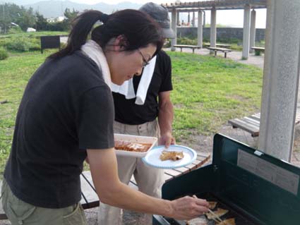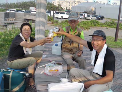 ![]() 青海海岸 炊事場が在りました 明日の登山に備えてキャンプ地を「おうみ海岸」にしました トイレやシャワー・炊事場も在る素晴らしい場所です ![]() テントを張った海岸 テントを張り海岸線を眺めてキャンプの準備に係る ![]() ハマナスの実 まずは泡ダスね! 海岸線にはハマナスの実がいっぱい付いた木々が並んでた 何はともあれ暑いときにはビールに限ると泡を頂きます ![]() BBQ 旨そう! 体力を付けるには肉が良いとBBQ 下味の付いた肉を焼くと良い香りが浜風に乗って漂う 此じゃ〜泡も進むで・・・(笑) ![]() 夕暮れの海岸 地元の野球少年と一緒 私達の隣で寛ぐ好青年を見つけて話しかけるSei 「焼き肉を一緒に食べねいかい」と話すと・・・ え〜 いいのですか 美味しいと食べる姿は最高の持て成しでした。 ![]() おうみ祭り会場 夜も更けて祭り会場へ伺う 多くの人で賑わう広場には出店も多く並び祭り真っ盛りです 輪になり踊る浴衣姿が暗闇に浮かび BGMに見事に乗った動きが夏の夜を彩ってた。 ![]() 夕日が沈む 地元の青年と合流 海岸線に日が沈む頃 青春を謳歌する地元の青年と酒を酌み交わす 話すほどに盛り上がり将来像を語る場面では! 若い力が持つ生き様に 確かな未来を垣間見ることが出来た 動画をご覧くださいね! 戻る |