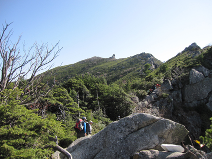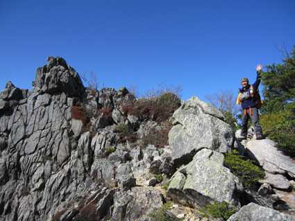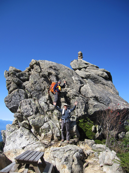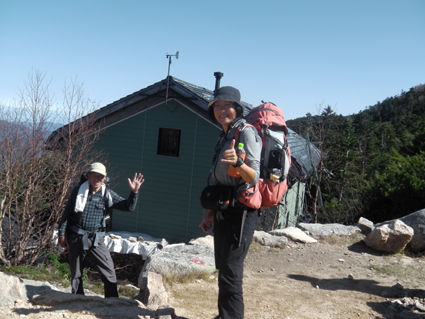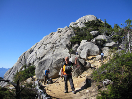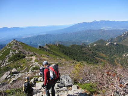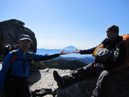 ![]() 金峰山頂 (南アルプスの山並み) 12日は瑞牆山へ登り、富士見平らに在る小屋へ泊まる 13日のAM6:30分に小屋を出て稜線へ着くと青い空に映えるアルプスの山並み広がります 金峰山小屋を経由して山頂に着くと、広いピークを埋める登山者の姿が凄いです 私達は何とか端の方に休む場所を見つけて寛ぎました 展望と道中の記録をご覧くださいね! ![]() 富士見平らより(富士山) 鷹見岩分岐のSei 早朝の富士山を眺めて出発です 最初に現れたのが鷹見岩分岐で一緒に歩いてる仲間が一言・・・ 「Seiさん待ってるから一っ走り登ってきたら」 往復何時間かかるのだ・・・(笑) ![]() 大日小屋(後方に鷹見岩) 大日岩 大日小屋は登山道の下方へ在りました ひっそりとした佇まいの小屋は人影はありません! 行く先を眺めると大日岩と思われる岩の尖りを確認することが出来ました ![]() 道標 八丁平分岐 金峰山の登山道は岩が多く巨木は見あたらない 緩斜面と急斜面が交互に現れ展望はなく足下のキノコに気を紛らわすしかない・・・笑 ![]() 砂払ノ頭より(富士山) 南アルプスの尾根を眺める! 樹林帯より抜け出すと砂払ノ頭に出ます そこは一変して素晴らしい尾根に出る 「うお〜凄いど〜」 ![]() 八ヶ岳や瑞牆山 金峰山(尖りは五丈岩) 稜線からは大展望が広がり一気にテンションが上がります 行く先々の荒々しい岩場の尖りと風景に圧倒された ![]() 稜線を行くSei Su−さんとHaruさん 何処までも青い空 稜線に出ると流石に気温も下がり露出してる所が冷たくなる ![]() 岩場に浮かぶ富士山 手のひらに載せた富士山 富士山に魅せられたHaruさんとSeiでした ![]() 頭に乗せた富士山 金峰山小屋脇の奇岩(Sei〜Su−さん) 富士山は何処から見ても素晴らしい姿です 小屋の分岐から寄り道して小屋へ 何故・・・山頂で頂くビールをゲットしたのだ ![]() 金峰山小屋 Gonちゃん 金峰山の小屋は綺麗です ゲットしたビールはクラーで冷やされてた為にヒエヒエでした 奇岩の上に石を積み上げてきたと豪語するGonちゃん 嘘でしょう・・・笑 ![]() 金峰山頂にて!(Su−さん〜Sei〜Gonちゃん〜Sadaさん〜Haruさん) 山頂は本当に広いです 凄い登山者にも係わらず休憩を楽しむことが出来ました 山頂直下にある五丈岩に登る登山者の姿が在ります 登るルートも在るらしいですが高度恐怖症のSeiは辞退いたしました ![]() 下 山 遠望の八ヶ岳 下山は登りの急登(小屋コース)を避けて稜線を下りました 山頂から砂払ノ頭までは大展望が約束されてます ![]() 砂払ノ頭より(富士山) 砂払ノ頭(Sei) 登りでも楽しめた砂払ノ頭にてチョイ休憩です ![]() 大日岩 見晴台より(瑞牆山) 樹林帯をドンドン下り大日岩で写真を撮り下山を急ぎます 富士見平らの分岐を過ぎると展望台に出る 其処から眺める瑞牆山を確認して私達は登山口へと無事に下りました 瑞牆山〜金峰山の山旅を終えて清里へ 今日のお泊まりの宿へ着いたのは午後の5時を回るところでした ![]() 清里(お泊まりの宿)Sadaさん〜Sei〜Haruさん〜Su−さん〜Gonちゃん) 素晴らしい二泊三日の山旅と清里観光を楽しむことが出来ました 参加の皆さん全ての段取りを頂きましたSu−さん 有り難うございました ・・・Sei・・・ 動画をご覧くださいね! 戻る |