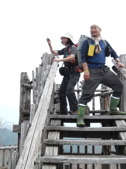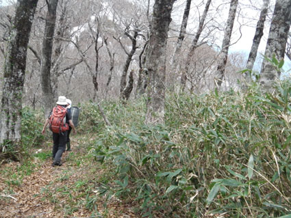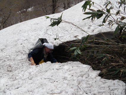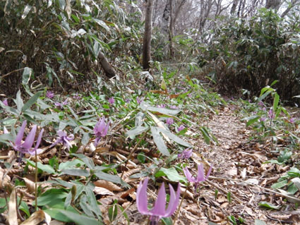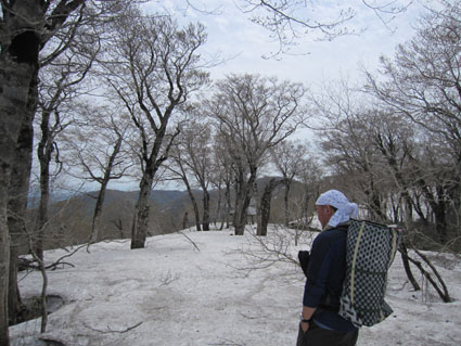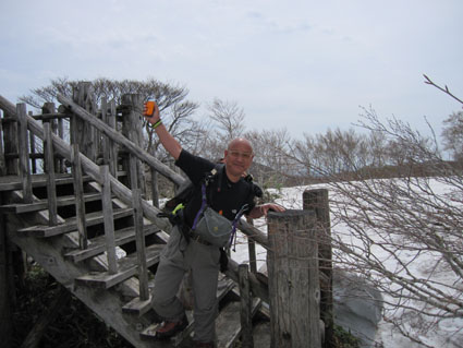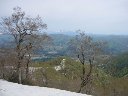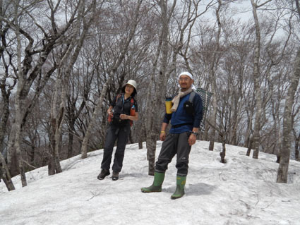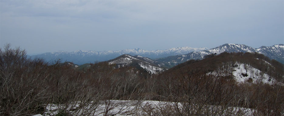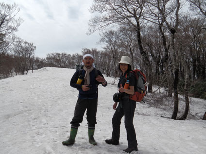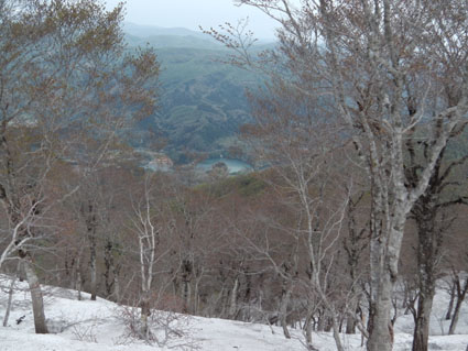 ![]() 稜線より船形山〜月山方面 鬼首へキャンプに来ました 山も登りたいと近くに在る山を検索したのが大柴山〜花渕山です キャンプ場から山を見上げると雪の斜面を見ることが出来る 稜線まででゴンドラで上がり残雪の中を歩いたときの楽しい記録です ![]() 鬼首スキー場ゴンドラ乗り場 稜線の道標(Gonちゃん〜タッシーさん) 当初は登山道を登る予定でしたが残雪と斜度を考えると危険と判断ゴンドラを利用する (と言うよりは楽したいから・・・?です) 終点に降りると其処は稜線です 道標の前で写真を撮り西へ進めば大柴山〜花渕山へ ![]() 尾根は殆ど雪渓歩きです 眼下の鳴子ダム ブナの根元を覗くと幹は見えない 残雪は未だ1.5〜2m位は在るようでした 眼下には常に鳴子ダムや周回・・・?できるハイキングコース〜キャンプ場が見える ![]() 雪渓を踏み抜くタッシーさん ブナ尾根のGonちゃん・タッシーさん 尾根にある雪渓を歩きながら雪庇に近寄らないべね等と話す そこへ悲鳴が聞こえた 「ヒヤー」 前を行くタッシーさんの姿が一瞬見えなくなった 側へ寄ると 雪渓を踏み抜いて落ちた姿が在ります だ だ・・・大丈夫かい〜 大丈夫だ〜 と 笹に掴まって這い上がるタッシーさんが居ました 谷底へ落ちることなく無事で良かったと私達は顔を見合わせる! ![]() カタクリが盛りです 大柴山から二つ目ノピーク 雪解けの進んだ道へ出ると カタクリやキクザキイチゲ〜マイズルソウなどが登山道を飾る 大柴山を過ぎて二つ目のピークへ着いたときに時計を見ると11時を指してた キャンプ場で待ってる仲間と約束の下山時刻はPM1:00です 此処で休憩して往路を戻れば間に合うと予想し泡タイムと成りました。 ![]() 雪渓から外れると登山道が現れる 奥に見える花渕山 笹に覆われた夏道はホンの少ししか出てない 振り返ると折り返し地点の先には目的地の花渕山が見えてました ![]() ブナ林は冬の様相 遠望の栗駒山 ブナの芽は硬く若葉を見るのは未だ先のようです 里山の新緑を台座に見立て、栗駒山の尖りは白く縁取られてた ![]() 山肌も中段までは芽吹く 稜線より月山方面 眼下を覗くと尾根の木々とは色分けされ・・・ 山肌の中段までは新緑が風に靡き、 標高を上げるように視線を移すと残雪に見える木々は茶色の肌と変わる ![]() マイズルソウ カタクリ カタクリ蕾 ![]() カタクリ マイズルソウ チゴユリ ![]() 登山道のカタクリ キクザキイチゲ エンレイソウ 上記の写真は雪解けの進んだ登山道に咲いてた花です ![]() 崩落寸前の展望台 Sei Gonちゃん〜タッシーさん 危険と書かれた看板の在る建造物は展望台です 柱が腐り養生も無い為に使用できない状態でしたが素晴らしい展望に少しだけ使わせていただく! このまま崩壊するのかと思うと勿体ないな〜と 心の囁きです 残雪の稜線歩きは気持ちの良い一日となりました タッシーさんGonちゃん有り難うございました ・・・Sei・・・ 動画をご覧くださいね! 戻る |