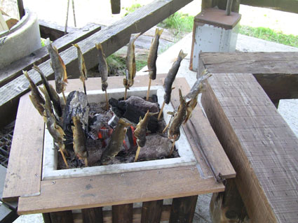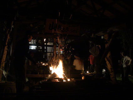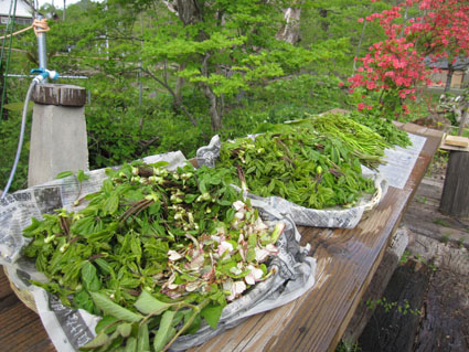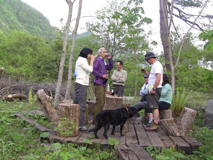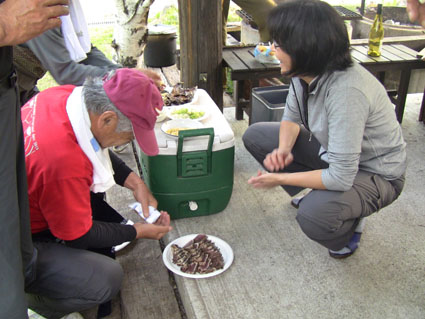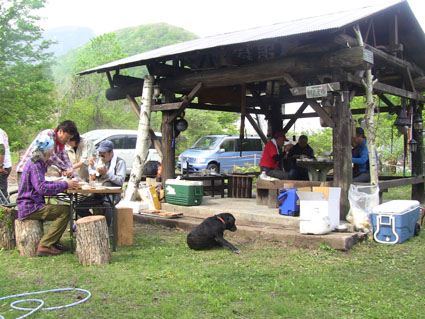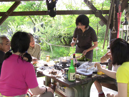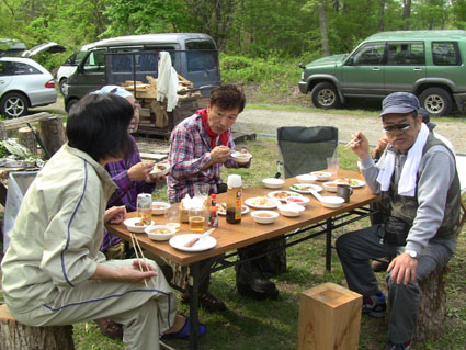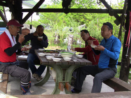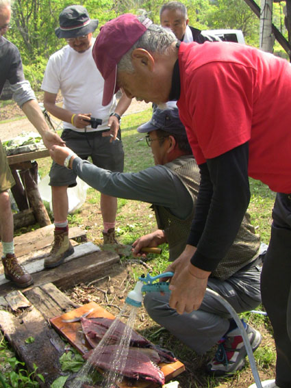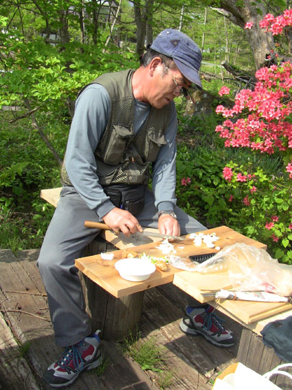 ![]() オフ会に使う山菜を山へ入り採ってきました 気の合う仲間が集う「山菜オフ会」 12名の参加者で24日〜26日の三日間を楽しみました 豊富に山菜が採れて食べきれなく帰りのお土産になるなど満足な時を過ごす 仲間が持ち寄った自慢の品々もテーブルに並び賑やかだ! 飲んで遊んで山菜を採って過ごした三日間の記録です ![]() 庭に咲く花々 ドウダンツツジ 山小屋の庭には チゴユリ・ ホウチャクソウ・ ドウダンツツジ・ スズラン・ シラネアオイ・ クマガイソウ ワサビ・ クルマユリ・ ショウジョウバカマ・ カタクリ・ オダマキソウ・ 等々が咲きます ![]() シオデ&ノノシロ ドウダンツツジ 山菜の女王と言われてるシオデを採る! この後に近くの山へ入りシオデ探索を試みると結構な量を採ることが出来ました。 ![]() 並べられた山菜 東屋にて! 山菜は数種類の料理を作り皆さんで食べます 天ぷらは作りたてをテーブルに並べ食べる贅沢だ。 また皆さんが持ち寄った日本酒やワイン・カツオにタイ等々・・・食べきれない豪華な食卓です ![]() カツオを捌きます 職人技のOkuさん カツオを捌くのは名人技のOkuさんです 包丁さばきを見てる参加者は一応に口を揃えて話す 「此はただ事ではない」 あまりの綺麗な包丁さばきに感動さい覚える! ![]() イワナの塩焼き カツオの叩き 山菜オフ会に付きものがイワナの塩焼きです 毎度の事ながら皆さんが美味しいと食べてくれるので渓流解禁から釣って保存するSeiでした。 ![]() 牛肉を焼きます サクラも仲間に! イワナと共に人気なのが牛ブロックの炭火焼だ! 一日目は薄く剥ぎ取り塩コショウで頂き 二日間焼いた物はブロックに別けて最後まで残った方へお土産として渡します ![]() 裏庭にて! 外で寛ぐメンバー 去年作られた裏庭の散策路でのんびりと過ごした 東小屋では思い思いに楽しんでる姿が見えます ![]() 料理の一部です いつもながら料理の写真がありません・・・苦笑 飲むほどにペースが上がり写真を撮るのを忘れるのです ![]() 夜 景 焚き火 月灯りと焚き火がオフ会の夜にコラボします ゆったりと流れる時間は正に至福の空間で和やかな話し声が静けさの中へ溶け込む! ![]() 朝 食 外は美味しい 朝食は外で食べました 美味しい福島の米を使ったコシアブラご飯やクレソンのサラダ等々テーブルに並ぶ 皆さん美味しいと満足げな顔に感謝です ![]() 空気入れを使うTakaちゃん 二日目の行動は! 一眼レフのカメラにゴミが入り苦肉の策で出てきたのが・・・ 自転車の空気入れで吹き飛ばす事だ 一人では無理とメンバーが手伝うと見事に成功しゴミが取れた 「この様子は動画に在ります」 ![]() 撤 収 大きなテントを撤収するムッテイさんとShunさん 慣れた手順で折りたたまれた。 ![]() 集合写真 タッシーさん・一匹さん・Hosaka先生・Okuさん・ムッテイさん・Shunさん・Nabeちゃん・Haruさん〜 Takaちゃん〜Gonちゃん〜Satoさん ・・・Seiの姿はない・・・ 解散前に集合写真を撮り各自予定の行動へと移ります 山へ行く人〜渓流釣りへ行く人〜山菜採りへ行く人と別れて三々五々の解散でした 参加の12名の皆さん有り難うございました 次回はキノコオフ会です それではまた会いましょう Sei・・・ 動画をご覧くださいね! 戻る オマケの早送り動画 固定ライブカメラ動画です |