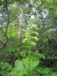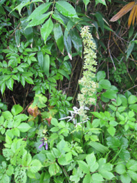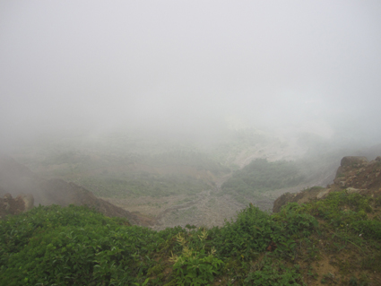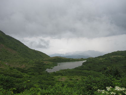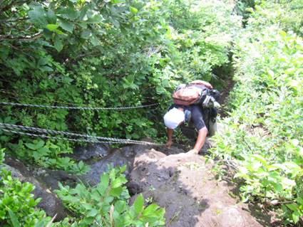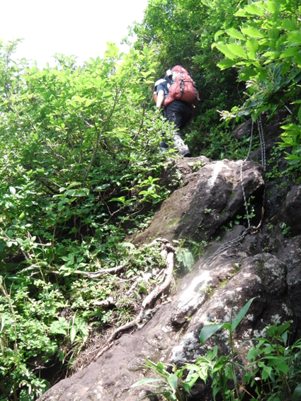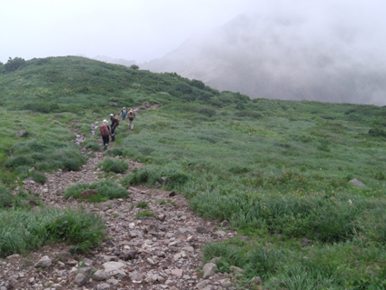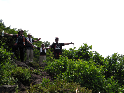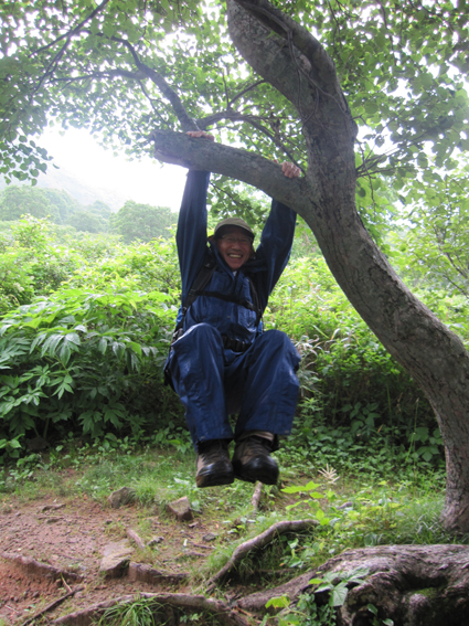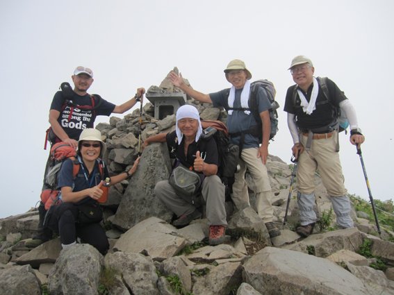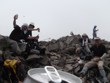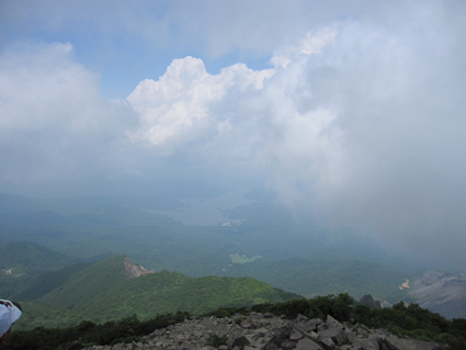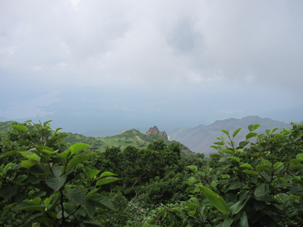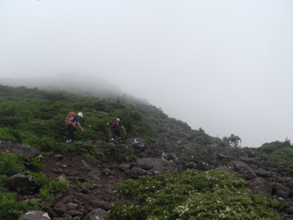 ![]() 磐梯山山頂より天狗岩 雨の確率が高い土曜日に磐梯山へ登りました 当初は翁島登山口より計画したが 標高を稼ぐためにリゾートスキー場のゴンドラに乗りゲレンデTOPへ行く 其処から2時間で山頂に着いた まだ雨も落ちてこないが雲行きが妖しい 山頂での休憩は30分で切り上げ猪苗代スキー場へと下山開始 ・・・弘法清水を通過したその時・・光線が走る・・・ ![]() 翁島登山口 リゾートスキー場ゴンドラ乗り場 登山口へ行くも標高差390m稼げるゴンドラは魅力がある 迷わず私達はリゾートスキー場に直行しゴンドラに乗りました・・・(笑) ![]() 空中遊泳のゴンドラ ゲレンデTOPに在る鳥居 ゲレンデTOPに着いた時間はAM9:30分 11時までには着けるかな??? そんな甘い読みも見事に外れるのでした ![]() 眼下の猪苗代湖を望む! 急登の岩場 途中の空けた場所から望む猪苗代湖 霞んでるが輪郭を捉える事が出来た ![]() 斜度のある登りが続く ようやくピークが見えた 急登と岩場が続きます 雨でぬかるんだ場所も現れ、木立の中は蒸されて全身から汗が流落ちる ピークを望む場所まで来ると谷其処から涼しい風が登って来て体を冷やしてくれた ![]() 谷から上がる風を抱く ガスの中を登る 風の通り道に来ると皆さん手を広げて風を抱きます 1700mくらいになると木々の背丈も低くなり展望が開けた・・・が・・・ご覧のと通りガスの中だ! ![]() 標高1700m付近の岩場 綺麗な物体 山頂は1819m間もなくピークです 何気に見つけた黄緑のシマシマ物体が足下に現れる ん〜 何でしょう 蝶の幼虫なんでしょうかね! ![]() 山頂直下 道標前にて!(Gonちゃん〜Su−さん〜Sei〜タッシーさん〜Ariさん) ガスの中から顔を出した山頂の道標前で写真を撮りピークへ ![]() 山頂(タッシーさん〜Gonちゃん〜Sei〜Su−さn〜Ariさん)) 祠のある山頂で笑顔の記念写真を撮る 山頂到着は予想に反して2時間かかりました。ゴンドラに乗らなければ3時間半のコース すこし楽しすぎかな。。。 ![]() 休 憩(乾杯) 猫魔ヶ岳(アルツ磐梯〜猫魔スキー場) ガスが時々去り眼下の景色が現れる お〜〜見えるど と 泡を片手に急いでシャッターを切ります ![]() 檜原湖方面の風景 天狗岩 檜原湖や中ノ湯跡〜猫魔ホテル等々が流れる雲の中から現れます 山頂休憩は30分で切り上げ下山開始でした ![]() 弘法清水小屋 噴火口 お世話になってる弘法清水小屋へ立ち寄り挨拶を交わし チョイ休憩は やっぱり泡です 小屋の管理人Sさん美味しいツマミご馳走様でした ![]() 下山(Ariさん〜Su−さん〜タッシーさん〜Gonちゃん) 櫛ヶ峰 弘法清水を後にして下り始めると光線が走り大きな地響きが近づいた ありゃ〜 やっぱり来たか 急いで雨具を着ることに成る ![]() 磐梯山&櫛ヶ峰のコル 沼の平 銀名水を足下に見てコルを足早に下ります 櫛ヶ峰の懐にある沼の平は雨水を溜めてか通年より多く・・・? 水量を見ることが出来た 磐梯山の花々 ↓ ![]() ![]() ![]() ![]() ![]() ![]() 渋谷口の分岐 湿原越しの裏磐梯 沼の平に在る渋谷口の分岐を越すと裏磐梯の絶景ポイントに着きます 尖りピークの裾野に広がる湿原には、風に靡く野草の姿を見ることが出来た ![]() 木登りSu−さん 赤埴山の分岐 枝振りの良い木にぶら下がるのはSu−さんです まだまだ体力が余ってるらしく元気いっぱいでした・・・・(笑) ![]() 登山道に出てた美味しいキノコ ゲレンデを下る 登山道を下ってると大きな笠のキノコを見つけた キノコ博士のタッシーさんが来るまで写真を撮り待ってると! 何とアワビのような味がする 一級品で在ることが判明して小屋へ持ち帰り 湯がいてワサビ醤油で頂くと 「こりゃ〜たまらんは」初めての珍味でした 下山は猪苗代スキー場へゲレンデを駆け下りたので在ります Su−さん Ariさん タッシーさん Gonちゃん 有り難うございました 動画をご覧くださいね! 戻る |