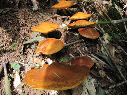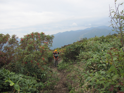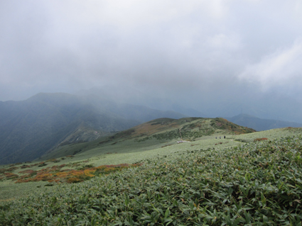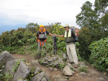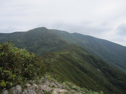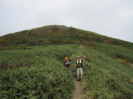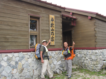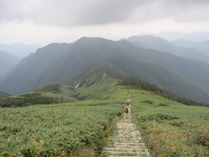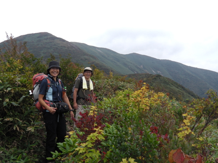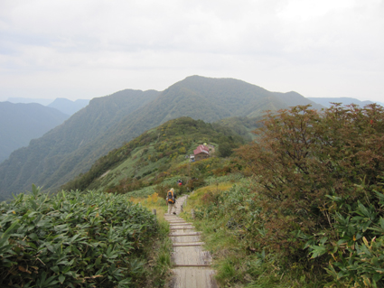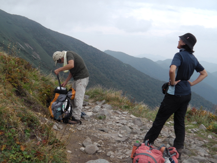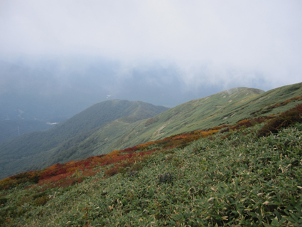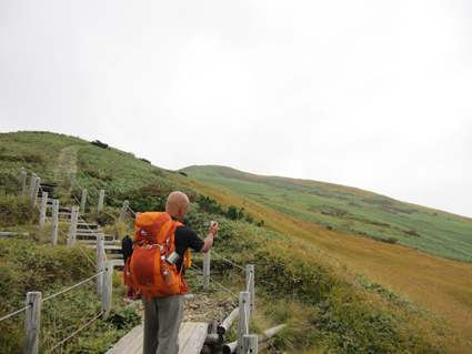 ![]() 平標山 (山小屋より) 久しぶりに登山日和のなか平標山に登ることが出来た。 国道沿いに在る登山道から松手山経由で平標山へ、 下山は山小屋から平元新道を通り河内沢と平行する林道の下山です。 標高差が1000m近くある登山道の約8割(私感)が階段である、 登りは林の中で蒸され階段に絞られるが松手山を過ぎると展望の開けた稜線歩きだ ![]() 登山口(Gonちゃん〜Su−さん) 色付き始めた尾根 登山口は国道17号線沿いに在る 50台くらいは止められるであろう駐車場も満杯で端にようやく止める場所を確保できた 案内に沿って進むと舗装された道に出て直ぐに登山口です 其処から続く登山道は上信越自然歩道と言う階段で整備された完璧な登りで危険箇所は殆ど無い! 鉄塔台地の手前で一息入れられる平坦地に出る ![]() 鉄塔台地 松手山 (Sei〜Su−さん) 鉄塔台地に着くと3名の登山者が休んでたが先行します 暫く休憩して急登を登り切ると松手山山頂だ 其処からは稜線歩きで色付き始めた木々やクサモミジが疲れた体を癒してくれる でもでも階段は続きます ![]() 稜線を歩くSei 余裕の二人 木々の背丈も低くなり笹の原っぱが山肌を覆う様になると 一ノ肩のピークの先には平標山の姿が見えた ![]() 一ノ肩〜平標山 休 憩 目標のピークを眺めて一言、ヨッシャー休憩すんべ! ここからは標高差300m位だ、あと一時間半くらいで着きたいね等と話し休みます ![]() 流れるような山並と上信越自然歩道 Sei と Su−さん 登山道は完璧に整備されてます 家族連れから単独の登山者や団体の山家さんと賑わいを見ることが出来た ![]() 名残の花 松手山と紅葉 所々に名残の花が咲いてます 此からは俺たちに任せてと言ってるようにクサモミジやナナカマドの赤が際だってました ![]() 流れるガス 平標山 (Sei〜Su−さん) 登り始めて3時間30分で山頂に着いた 広いピークには大勢の登山者が寛いでます 登山口が四方にあり親しまれてる山の姿を垣間見ることが出来ました ![]() 雲に隠れた松手山&一ノ肩方面 仙ノ倉山(2026.2m) 山頂から360度の展望を楽しもうとカメラを構えるもガスが駆け足で通り過ぎた 私は見え隠れする山々を捉えるとカシャッとシャッターを切る! ![]() 淡い色の苔 山小屋へ下る階段 長い ながい 階段を下ります 足下には淡い色の苔が笹を包み階段の先には大源太山が見える ![]() クサモミジ 赤いザックのSei 山頂から山小屋へと下るとクサモミジが山肌を覆う様になる 地味な赤いザック・・・?を背負うSeiがクサモミジと何故かコラボするのでした・・・(笑) ![]() 大源太山 階段の道が続く 平標山は階段の山です ここまで特徴のあるコースは本当に珍しい山だ! ![]() 山肌が燃える 平標山の家 眼下に見える山小屋まで階段は続きます ![]() 山小屋(Su−さんSei〜Gonちゃん) 山小屋の脇に湧き出てる水は冷たく柔らかい味です 私達は美味しいと手ですくって頂きました 小屋の先にはテラスが在り大きな鐘が下がってる Seiがするすると寄って鐘を鳴らすと澄んだ音色が山に響き渡りました ![]() 奥に見える万太郎山・・・? 山小屋より平標山 仙ノ倉山の裾野に見える荒々しい尖りは何か・・・? 谷川岳 いやいやそんな近くではない では万太郎山かなと話が弾む! 平元新道を下る前に平標山を眺めて小屋を後にした ![]() ブナの実 行儀良く並ぶキノコ ![]() 林道分岐のSu−さんとGonちゃん 林 道 急勾配の平元新道を下ってると足をかばって休んでる登山者の姿があります 私も足がパンパンに成り階段の厳しさを思い知りました・・・苦笑 ![]() 沢を埋める石 お泊まりの宿「高野屋」 林道沿いにある沢は前回の台風の影響か大きな石がゴロゴロしてる 林道も埋め尽くし自然の驚異を感じました 下山はPM3:30分です 全行程6時間30分の山歩きに満足して今日の宿「高野屋」さんに着いた ![]() ”ブタしゃぶ”と”へぎそば” 地酒と宿の女将さん 宿は源泉掛け流しの温泉に料理が素晴らしいです 軟らかい肉の「ブタしゃぶ」&「へぎそば」等などで迎えて頂きました 美味しい「しゃぶしゃぶ」 & 「へぎそば」 が食べ放題と感激に涙します 其処に現れた地酒がたまりません 素晴らしい宿に恵まれて新潟の夜を満喫できました お宿は「浦子の湯 高野屋」さん 電話025−787−3054 新潟県南魚沼郡湯沢町土樽146ー2 此方方面へ出かけるときには是非お立ち寄りをお勧めいたします 女将さん初めスタッフさんが素晴らしい気遣いでした お帰りには「魚沼産コシヒカリ」をお土産に頂きました有り難うございます Su−さん・Gonちゃんまた泊まりに行きましょう ・・・Sei・・・ 動画をご覧くださいね! 戻る |