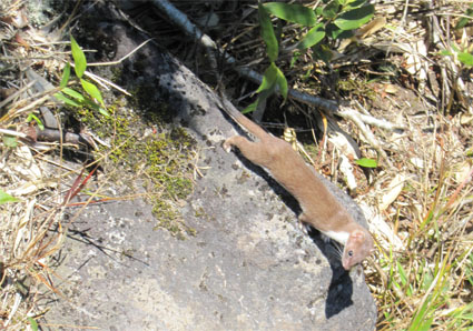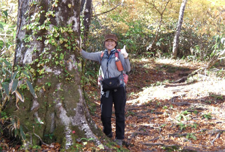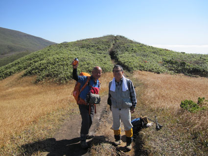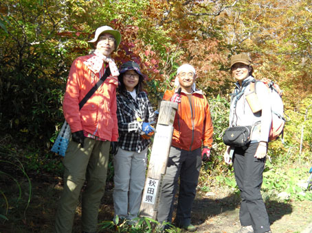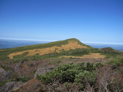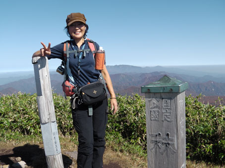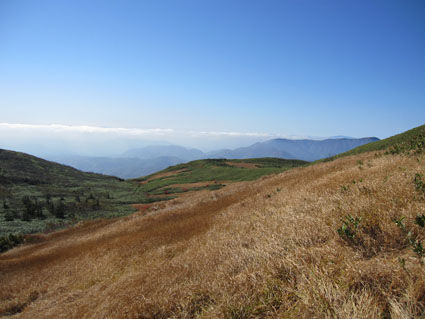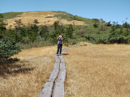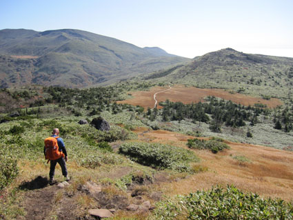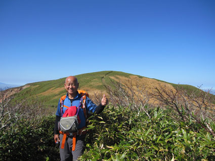 ![]() 天馬尾根から栗駒山 キャンプ二日目は秣岳登山でした 快晴無風の素晴らしい登山日和に歩く尾根は360度の大展望を欲しいままに贅沢三昧です ![]() キャンプ地を出発 登山口にて! (Hiroちゃん~タッシーさん~Gonちゃん) (Shunさん~Hiroちゃん~タッシーさん~Gonちゃん キャンプ地を出て登山口に着くとキノコ狩り隊と登山組に分かれました ![]() キノコ狩りへ 山頂へ行くGonちゃん キノコ採りへ向かうメンバーは藪の中に消える 私たちはブナ林の急坂を山頂目指して進みます ![]() 紅葉が綺麗です 眼下の須川湖 登山道から稜線に出ると彩の山肌から展望のいい道へ案内された ![]() 鳥海山方面を望む! 秣岳のSei 一時間30分で秣岳の山頂へ到着です 遠望には鳥海山が見えてる ![]() 山頂のGonちゃん 眼下の須川温泉 山頂から望む景色に満面の笑顔はGonちゃんです ![]() 天馬尾根を歩く! 南方の風景 栗駒山に続く天馬尾根を眺めて私たちは引き込まれるように歩きました 小さなピークを二つ越すと栗駒の緩斜面が見える 何処まで行くかな・・? 時間的には十分余裕があるがキノコ狩り隊には折り返すと約束したために 栗駒山へは次回にと戻ります ![]() 秣岳縦走コース 西方の遠望 稜線の草紅葉が絨毯の様に敷き詰められてた 取り巻く山々に小さな尖がりを見つけては、あれは舟形山かな~あれは焼石岳かな等と 展望を楽しみました ![]() 振り返り秣岳を望む! 大岩のSei 稜線から振り返る秣岳は須川湖からの山容と一変してる 昼食で大休憩したピークの大岩に乗りポーズはSeiです ![]() オコジョが現れました 可愛いですね~ 栗駒山方面へ足を延ばすとイワの隙間から現れたのは可愛いオコジョです カメラを向けるとチョロチョロと動き回る仕草が面白い 隠れては出てくるを数回繰り返して茂みに消えました ![]() 稜線の池塘 日焼けしたSei 折り返し地点には池塘がありました 生き物がいるのかなと覗き込むも動く姿は在りません 火山地帯で住めないのでしょうかね・・? ![]() 火山研究のDoi先生と! ラッパキノコ出現 稜線を歩いてると地面を削り作業してる人と会いました その方は地質調査をしてたDoi先生です 火山活動や火山灰・火山性ガスの濃度なども調べてると 短い時間でしたが話を聞くことができました 分かれる前に記念写真を撮りました Doi先生 ご活躍くださいね~ 動画をご覧くださいね! 戻る |