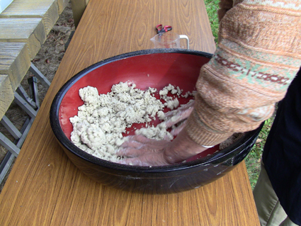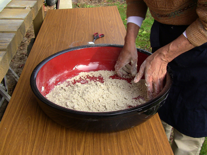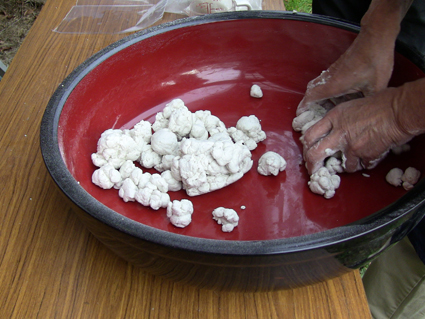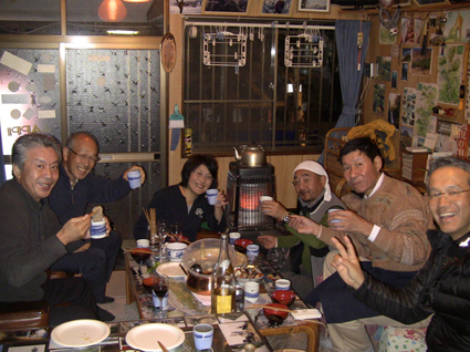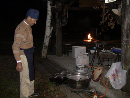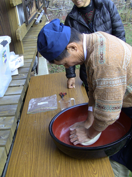 ![]() 出来上がった新蕎麦 2014年の新そば祭りが各地で開催される中 私たちも磐梯の山小屋でInokosi名人が打つ新蕎麦をいただきました ![]() キノコを採る二人 泡をお供にキノコの選別 蕎麦を食べる為にキノコ汁の素を採るタッシーさんとGonちゃんです 小屋の周りだけで十分だ。 ![]() 採りたてのキノコパスタ パスタの試食は笑顔の三人&Su-さん ちょうど昼時だったためにキノコパスタをいただきました イノキタケはナメコのようにヌメリガあり美味しいです ![]() 粉を解す 混ぜる いよいよInokosi名人が手際よく準備にかかりました ![]() 練る 小玉を作る 見事な手さばきです ![]() 厳選された蕎麦粉 蕎麦玉 蕎麦粉は「常陸秋ソバ」と「会津・加藤そば道場」から取り寄せたものです 水にもこだわる名人は全てがピンの横並びで打ち上げる ![]() 延ばします 切ります 芸実的な蕎麦打ちです ![]() 見事な包丁さばき 新蕎麦が出来上がりました 寸分の狂いもない太さに切る包丁さばきは正に職人の域をこえる超人だ 蕎麦粉100の出来上がりは艶のある美しい物です ![]() 大きな鍋で湯がくInokosi名人 参加のメンバー 大きな鍋で湯がく名人の姿は立ってるだけで絵になります 沸騰したお湯に麺を入れて茹で加減を見計らい手ばやにさらし 小屋の中で待ってる仲間のもとへ運び込まれる みなさん満面の笑顔でいただいた。 素晴らしい名人技の蕎麦に「美味い」と歓声が湧きます Inokosiさん本当にありがとうございました 今日の仲間 Inokosi名人・Outiさん・Haruさん・Su-さん・タッシーさん・GonちゃんSeiの7名です みなさん楽しい新蕎麦の集い有難うございます ・・・Sei・・・ 動画をご覧くださいね! 戻る |
