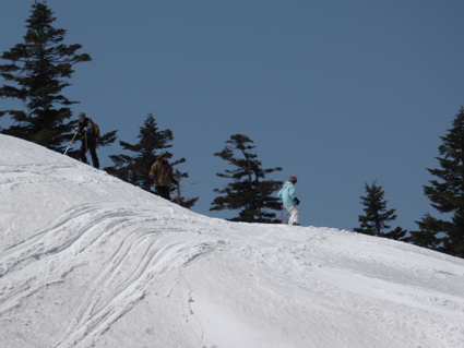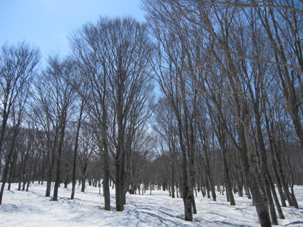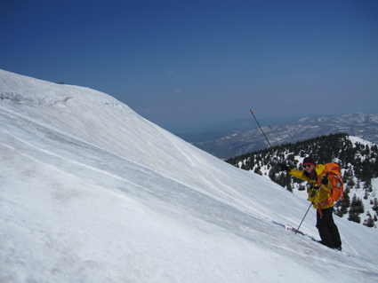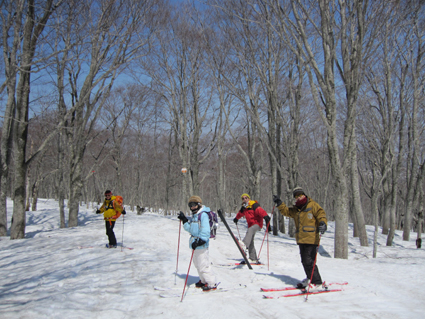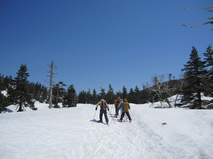 ![]() 八甲田山(赤倉岳〜井戸岳〜大岳) 4日は八甲田山(温泉ルート)を滑りました 真っ青に晴れた空を眺めて滑るバックカントリースキーは最高です 毎年訪れてるが此程までに太陽の下で滑るれのは暫くぶりだ ![]() ロープウィエ(右に太いワイヤーが見える) 南八甲田山 ロープウィエは混雑しててピストンで運行してました 南に見える櫛ヶ峰はまだまだ積雪が豊富で真っ白です バックカントリースキーを最後まで楽しめるのは南八甲田山何でしょうかね・・・? ![]() 田茂萢岳(山頂案内板) 八甲田山の峰 滑り出す前に山頂で記念写真に収まるメンバーです 少し風が強いが素晴らしい山スキー日和だ! ![]() コルを越えるメンバー 亀裂が走る斜面 山頂よりコルまで滑り込み最初の登り返しが現れ 小さなアップダウンを繰り返して広い尾根に出ると、ここからがガツッーンと滑降が楽しめます ![]() 尾根に立つ姿 赤倉岳の斜面 尾根に立つメンバー どちらに滑り出すか好みの斜面を物色中で在ります・・・笑 滑る姿は動画でご覧くださいね! ![]() 休憩(Shunさん〜ムッティさん〜Hiroちゃん〜タッシーさん〜Gonちゃん) 林間を滑るメンバー 大斜面を下り腹が減ったと休憩をする 其処でギンギンに冷やされた泡を頂けば身も心も満たされて 再び滑降開始です ![]() ブナ林の二次林 真っ青な空 下るほどに気温も上がり見上げる空は真っ青だ ![]() 根 穴 萌える唐松林 根の周りが穴が空く春先の情景が見られる林・・・ 唐松の枝先も萌えて色付き始めてました ![]() 雪面を照らす太陽 奥に見える北東の山々 温泉ルートを確実に下り道路に出ます 其処にはデポした車が待っててくれました 素晴らしい天候に恵まれて滑った温泉ルートを振り返ると 輪郭を縁取る八甲田山の姿を捉えることが出来ました 明日はシーズン最後の滑り板納めです 皆さん楽しみましょうね・・・Sei・・・ 動画をご覧くださいね! 戻る |