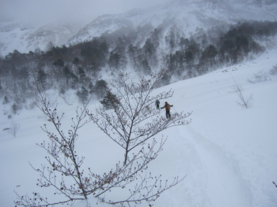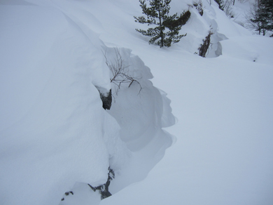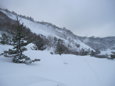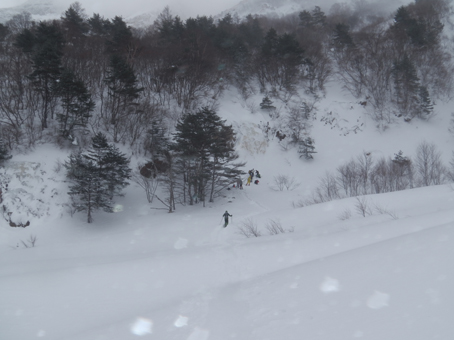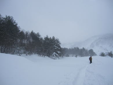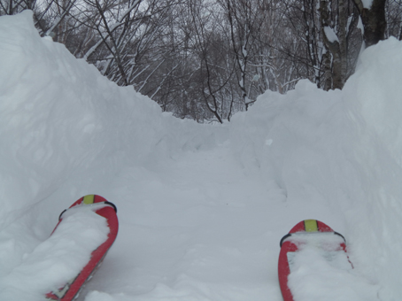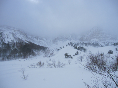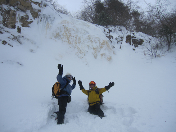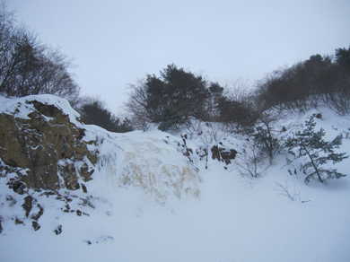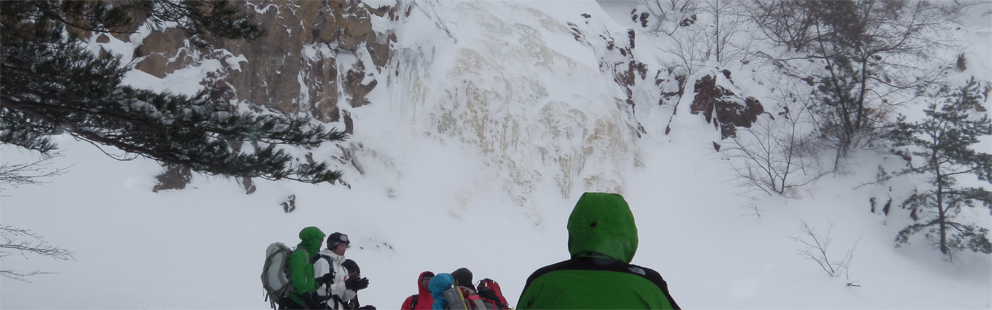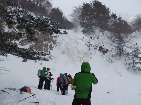 ![]() 2015年の滝 今年も来ましたイエローフォールへ 荒れた天候の為に誰もいないだろうと訪れるも・・・ ![]() ゲレンデTOP ラッセル ゲレンデTOPに着くと何と先行者のトレースが在ります 新雪の深さは30~40cm位でラッセルは大変でした・・・が・・・ ここは甘んじてトレースを使わせていただきました。 ![]() 銅 沼 湖面上を歩く 銅沼に着くと未だ全面氷結とはなってません 所々に水面が見える 湖面上を歩いてるとジワーッと水が浮いてきます 板のシールは水分を含み雪団子が付いて歩きにくくなる・・・苦笑 ![]() 新 雪 噴火壁 風がうなり地吹雪が舞う中を滝に向かってます 櫛ヶ峰の噴火壁が見え隠れしてました ![]() 深雪の斜面 磐梯山の稜線 今日はトレースを外れて歩くと結構しぼられます 今まで訪れた時は山裾を歩いてましたが、今日は小さなアップ・ダウンのルートだ それでも歩きやすい踏み跡に感謝でした ![]() 先行者の姿 フォール到着 いよいよ目の前に滝が見えます 先行してた若いグループの山家さんが思い思いの姿で写真を撮っていました ![]() 滝の前で! 私たちも写真に納まり休憩を楽しみます ![]() 発育途中の滝 復 路 滝の下で休むも何時もの泡は出てきません・・・? なんでかと言うと寒くて飲む気力がわきませんでした。 ![]() 岩 場 青 空 帰路に着くと時折青空が覗くようになります しかし相変わらず地吹雪が止みません(動画で確認) 毎年訪れるイエローフォール今年も素晴らしい姿を有難うございました ・・・Sei・・・ 動画をご覧くださいね! 戻る |