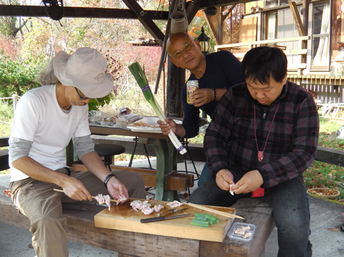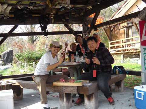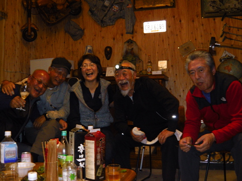 ![]() 山小屋の今 恒例のキノコオフ会が今年もやってきました 皆さんが楽しみにしてるマイタケは採れませんです・・苦笑 心配しました週末の天候も何とか崩れずに持ってくれた ![]() 第一陣が到着 真っ赤なモミジ 仙台の仲間が山小屋に着くのと同時に私たちも到着 早速 キノコの選別に係る ![]() キノコ汁の準備 焼き鳥(串刺し)Shunさん~Sei~モカパパ マイタケは無いが他のキノコは食べきれない程あります Gonちゃんとモカパパがキノコを吟味してた 分かるのかな・・・? (笑) ![]() 嵐の前の静けさ 牛タン串 & 鳥つくね 午前中は飲みながら作業をするも静かな小屋です 金串に刺された牛タンを焼いて試食 鳥つくねも焼いてみました お~~~ 美味い ![]() 順調に飲んでます 離れても飲んでます お昼頃になると酒も体の細胞に行き届きテンションが上がる 此方も飲んでますよ~ と Haruさん ![]() 枝豆を茹でる(Nabeちゃん~Nakaさん) シメジの酒蒸し (Haruさん) 此方では何やら次の作戦を練ってる様だ なになに 枝豆を茹でる 作戦を練るほどではないの~ (笑) ![]() 集合写真 (タッシーさん・Satiさん・Shunさん・Nakaさん・Nabeちゃん・Gonちゃん・Haruさん) モカパパ~Sei 今日の参加者は11名 まだ2名が来ていません Takaさんは3時過 Hiroちゃんは夜中になると連絡がありました ![]() 午後の東小屋 薪ストーブ小屋 背中が黄色のウエアがTakaさんです 予定通り3時には到着でした 今日も薪ストーブが快調です 暖が恋しい季節に成り暖かい小屋に入ると幸せな気持ちになりました・・・笑 ![]() 燃え上がる炎 笑いが響く小屋で! 夕方になると冷え込み釜戸で薪をいっぱい燃やすShunさん 燃え上がる炎を見てTakaさんがシャッターを切る姿が在りました 夜も更けて来ると外では寒くて耐えられない 薪小屋に入り宴会は続く・・・ 飲み始めたのはAM10時で早く寝た人がPM10時です 夜中の10:30分に着いたHiroちゃんのお供をしていただいた仲間が 寝たのは真夜中の0:30分でした 今年も一杯飲みましたね~ 食べましたね~ 飲みすぎて料理の写真が殆どないのが気がかりなSeiです 皆さんゴメンナサイね~ ・・・Sei・・・ 動画をご覧くださいね! 戻る |