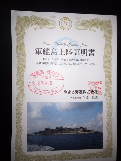 ![]() 海上から見る軍艦島 長崎半島から西に4.5km 三菱石炭鉱業の主力炭鉱が在った高島から 南西に約2.5km 長崎港から南西に約15kmの沖合に位置する 島は南北に480m 東西に約160m 周囲約1200m 面積約6300m2と言う小さな 海底炭鉱の島で岸壁が全体を囲い 高層鉄筋アパートが立ち並ぶその外観が 軍艦(土佐)に似てることから軍艦島と呼ばれるようになった。 ![]() 長崎港 観光丸 雨が降る港から島へ向かいます ![]() 接岸橋 岸 壁 島に着くも波が荒くなかなか接岸できません 接岸できず外遊して帰港することしばしばで、年に200回上陸できれば良い方と案内された ![]() 上陸いたしました ガイドの案内を聞きます 私たちは運よく上陸できました ![]() 三菱炭鉱跡 上陸したSei 先ほどまで降ってました雨も上がりました ガイドに先導されて軍艦島の歴史を聞きながら島内の遊歩道に沿って歩く! ![]() 軍艦島から離れます 観光船が来ました 150分の軍艦島上陸クルーズも終わり港へ戻ります ![]() 長崎港へ戻る 上陸証明書 九州の旅 最後は軍艦島でした 順調に予定コースを回り長崎空港へ、乗り換えて伊丹空港に着いたのがPM4:00です 福島行きの便はPM6:25分 他の便の遅れなどなどで離陸はPM7:30分と案内された・・・苦笑 再び搭乗前のアナウンスで 福島空港が濃い霧のために着陸できない可能性があると説明がある それでも予定時間には離陸して、一時間後に福島空港の上空へ 着陸態勢に入るも再び急上昇する・・・ん~・・・何だ・・・ 機内アナウンスで濃い霧のために視界が悪く着陸できないと! 上空を旋回して着陸許可が出るのを待ちます 再び着陸態勢に入ります・が・またもや急上昇する飛行機の状況に皆さん沈黙でした 三度の着陸を試みるも改善されない視界に着陸を諦めて関空へ引き返す 戻った時間はPM11時を大きく回ってました それから宿を探して新大阪駅までたどり着く 駅前にあるラフォーレ新大阪に泊まることが出来た(6日の0時50分) 寝床に着いたのは午前2時です 夜明けとともに帰る準備に入るも空の便は無く 新幹線で帰ることになりました 電車を乗り継ぎ郡山に着いたのがPM3;10分 それから福島空港に置いた車を取りに、リムジンバスで一路空港へ 着いたのがPM4:00です 空の便ですと伊丹空港から一時間で福島空港に着くが! 一日がかりで郡山へ戻る。。。 初めての珍道中に悪戦苦闘、旅の終わりに素晴らしい経験をすることが出来ました ご一緒頂きました皆さんお世話になりました ・・・Sei・・・ 動画をご覧くださいね! 戻る |