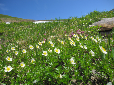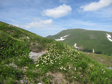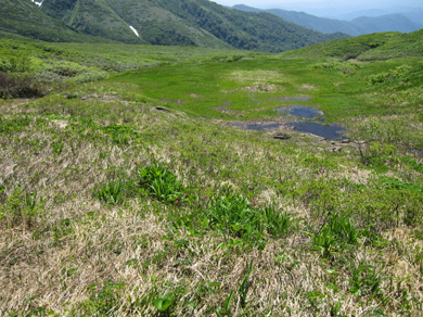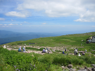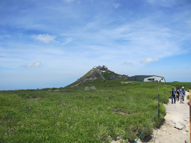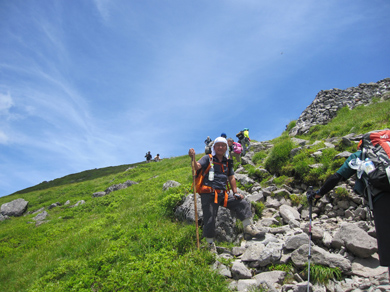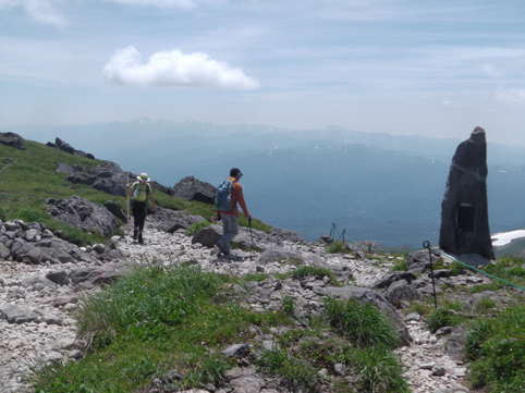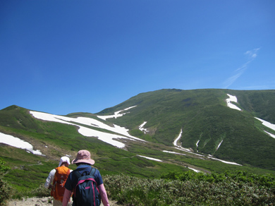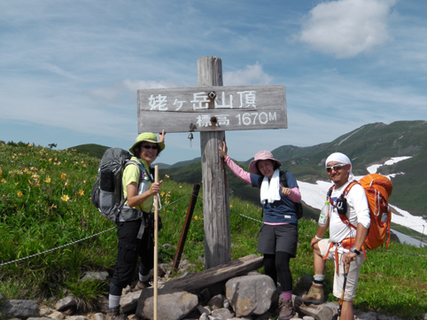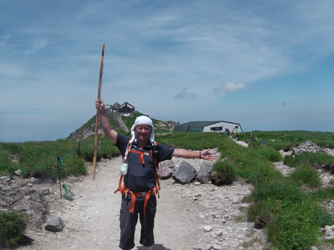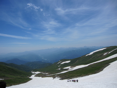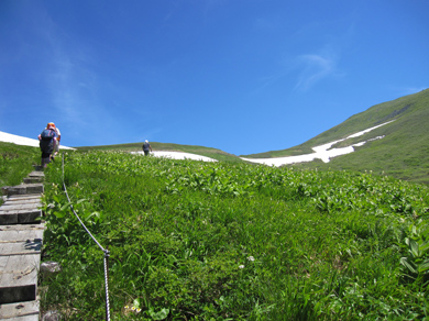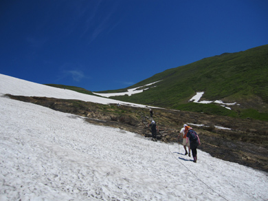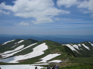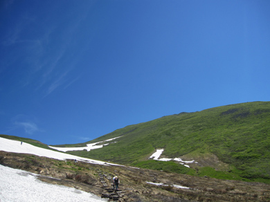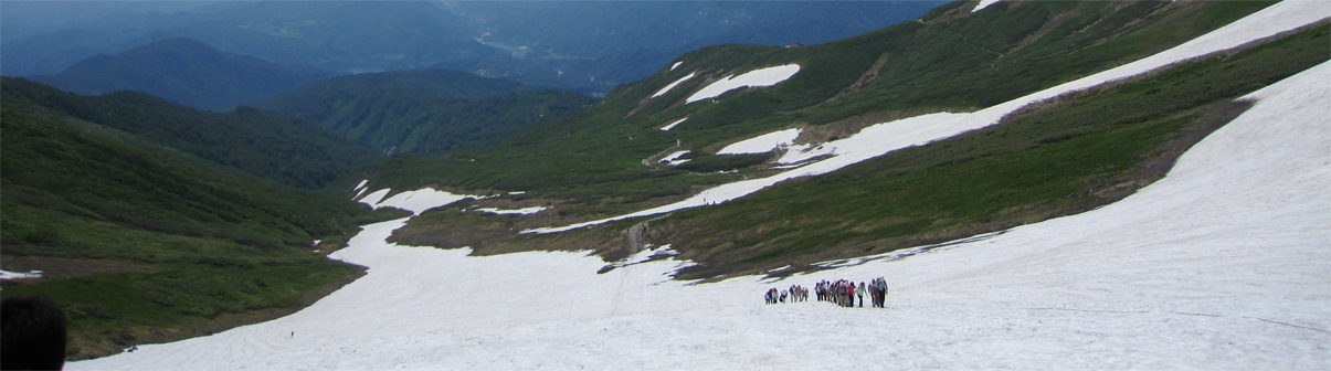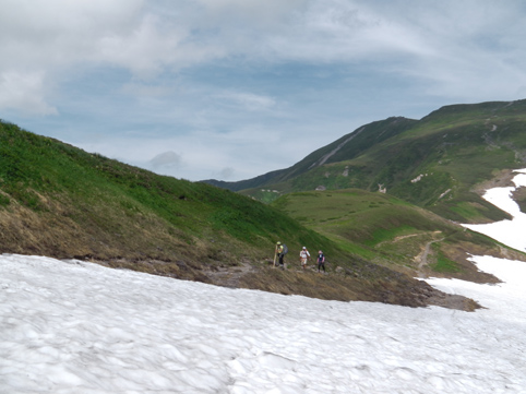 ![]() 雪渓を登る登山者 真っ青な空を眺めて月山に来ました 朝から気温がグングン上がり汗が噴き出てる 姥沢の駐車場は満杯で登山者が列をなして歩く姿が在りました ![]() 姥沢駐車場 月山リフト 一番奥のスペースを見つけて車を止めた 此処からリフトまで歩くのが結構な体力を使います・・・苦笑 ![]() 奥に見える尾根が月山 チングルマ リフト終点から歩き出したのが9時を回ってました 残雪を眺め足元には高山植物が咲き、暑さをしのぐ景色に癒されスタートです ![]() 池 塘 残雪にて!(Sei・タッシーさん・さっちゃん) 雪が消えて池塘が現れ植物が一斉に芽を出す 月山にも遅い春が訪れてました ![]() 雪解けの登山道 汚れた雪面 五月に春スキーで来た時は一面雪原でした 松脂に悩まされた滑らない雪も今は黒い汚れた雪しか残ってません。 ![]() 木 道 コバイケイソウ 雪解けの後にはニッコウキスゲやコバイケイソウ等々が咲いてる! ![]() 四ツ谷 右後方は姥ヶ岳 振り向けば四ツ谷に残る雪渓の上を並んで登る登山者の姿が見えます ![]() 残雪の尾根 お花畑 ![]() 鍛冶小屋跡の急坂 月山神社 月山では此処が一番の急坂でしょう 鍛冶小屋跡を過ぎれば稜線に出て山頂はすぐそこだ。 ![]() 山頂(Gonちゃん・Sei・さっちゃん・タッシーさん) 山頂広場 途中で挫けそうになった初登山の(さっちゃん)の姿が山頂に在ります 負けん気の強さで登って来た、凄い! ![]() 尾根にて!Sei Gonちゃんが来ました ![]() 下山(タッシーさん) 丑首を過ぎれば月光坂分岐です 雪原を避けて尾根を歩く 分岐を過ぎて姥ヶ岳の登りにさしかかると 自らファイトと気合を入れて登るのは初登山の山ガールです 高山植物のスライド ![]() 姥ヶ岳山頂(Gonちゃん~さっちゃん~タッシーさん) 本日2座目の登頂は姥ヶ岳山頂だ! お花畑を見る余裕はない様子だが笑顔が弾ける満足の瞬間です さっちゃん ばんざ~い ![]() 姥ヶ岳の池塘 お花畑 PM4:10分に駐車場へ戻り二日間の楽しい時が終わる 帰りには志津温泉に在る「えびす家」で汗を流し 山菜蕎麦を食べて解散でした タッシーさん さっちゃん Gonちゃん 二日間お世話になりました ・・・Sei・・・ 動画をご覧くださいね! 戻る |