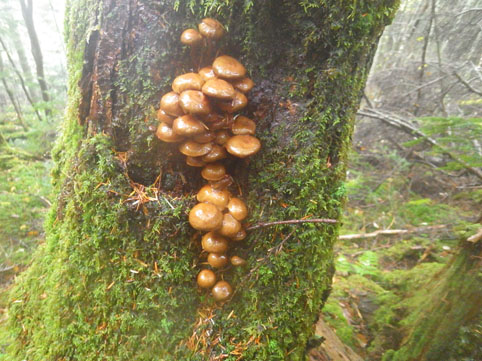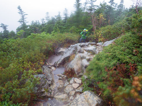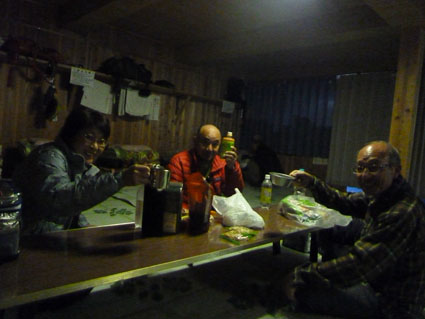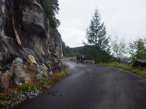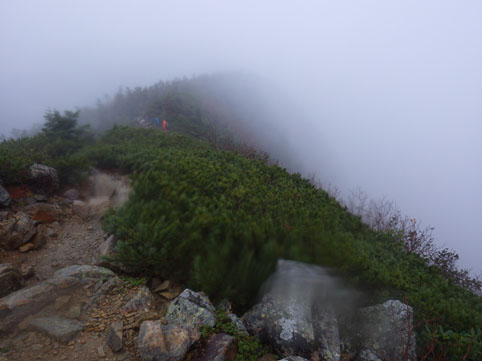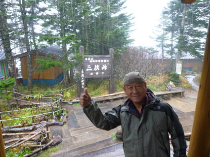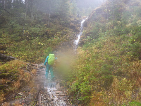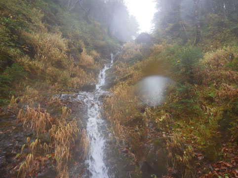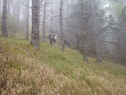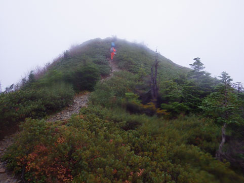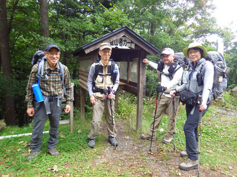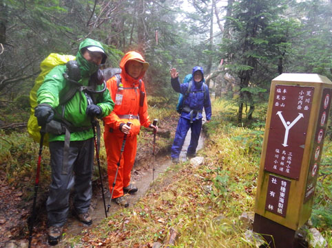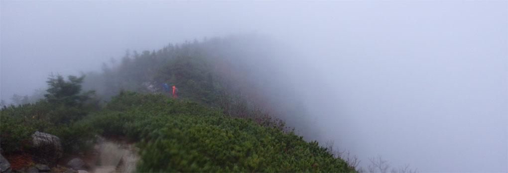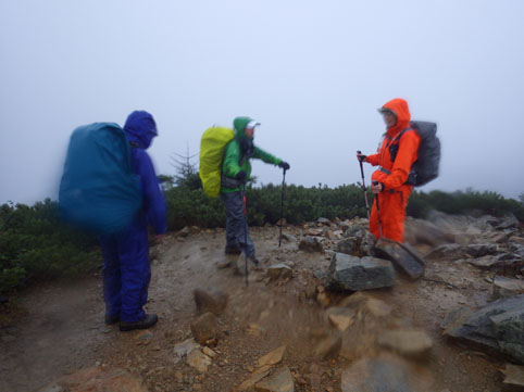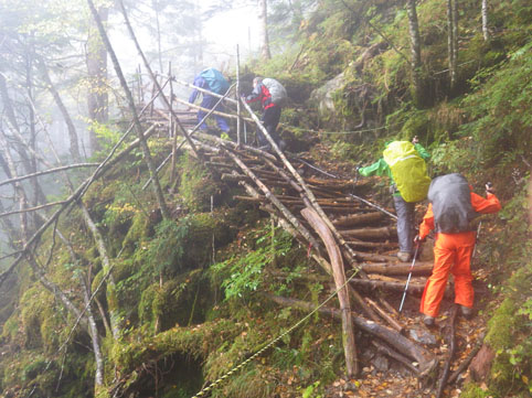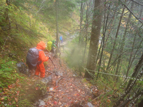 ![]() 三伏山(塩見岳前峰) 8日の朝 AM3:30分起床 準備を整えて 4:30分に第一陣と合流しました 東北道~北関東道~上信越道(甘楽)でSu-さんと合流します 之で今回のメンバー5名が揃いました。 車窓から見る空は分厚い雲に覆われてる 時折強い雨が車に打ちつけられる天候です ![]() 林道ゲート 駐車場(Su-さん・Sadaさん・タッシーさん・Gonちゃん) 登山口にはPM12:00に到着しました 既に起床してから8時間30分が過ぎてます 之から4時間半をかけて三伏小屋まで登る、南アルプスは遠いですね~ ![]() 豊口山 林 道 林道駐車場は豊口山の中腹に在ります 其処から登山口までは45分の道のりだ ![]() 豊口ルート(タッシーさん・Sei・Sadaさん・Su-さん) 唐松林 登山口にはPM12:53分に着きました ![]() 漂うガス 道標(休憩) ガスが漂う登山道を歩きます 霧雨の様な天候に変わり気温が一気に下がってきました ![]() 丸太の階段 ほとけの清水 歩き始めて3時間が過ぎたころから雨が強くなりウエアを着ます 気温が低くても蒸される 私は登山道脇に在った「ほとけの清水」で喉を潤しました ![]() 三伏峠 小屋へ到着 小屋へ到着したのはPM4:30分です ![]() 夕ご飯 小さな宴会 到着早々に夕ご飯を食べるように言われてビックリです 濡れたウエアを乾燥室に吊るして食堂へまっしぐら急いで食べる! 遅い到着に小屋のご主人が機嫌を悪くしたようだ・・・苦笑 部屋へ戻り小さな宴会を楽しみます 暫らくすると消灯は7時ですのでと、寝る準備を促された 疲れてるので早く寝るのは結構なことと横になる しかし屋根を叩く強い雨音や木々を吹き抜ける風の音が止みません 明日の事を考えると・・・ 浅い眠りの一夜を過ごすことになりました ![]() 9日の朝(風雨強い) 分 岐 朝食を済ませて小屋のご主人に天候状況を聞きます 山頂の風は風速27mで危険 塩見小屋から先の岩場は滑るので登るのは止めた方がいいとの事だ 協議の結果 行程時間や危険度・下山予定を考慮し 今日の登山は中止となりました それでは前峰に在る三伏山のピークまで行って来ようと 雨の中を出発します ![]() 三伏山 ガスの中を歩く ガスの中は何も見えません 風雨も全く弱まる様子が無いなかピークを目指しました ![]() 三伏山(2615m) 休 憩 真っ白い雲の中のピークは何も見えない 塩見岳の方角を眺めて、 天候が良ければ見えるはずの山を心の目で確認いたしました ![]() ガスが流れる稜線 滝が現れた 小休憩のあと直ぐに下山です 登山道の斜面には滝が現れて勢いよく流れる水の様子が在りました ![]() 不思議なキノコ 3個並んでました 展望のない登山道歩きは飽きてきます 其処に可愛い天使が現れた 薄紫色のまあるい形のツルツルしたキノコです 横に三個並んだ姿に癒しの時を頂くことが出来ました ![]() 落ち葉が綺麗な道 雨の中を歩く! 林の中はガスが漂い続ける 晴れていても木々に遮られて展望のない歩きは疲れます 足元に目線を落とすと落ち葉に飾られた道が何とも綺麗でした ![]() 川となった登山道 キノコの団子 登山道が川に成り 団子のキノコが現れた 間もなく林道に出るのかな、 AM7:10分に小屋を出て三伏山へ行き下山開始から 林道駐車場に着いたのはAM10:50分でした 山は逃げない、 また行きましょうと合言葉を残し塩見岳登山が終わった 動画をご覧くださいね! 戻る |