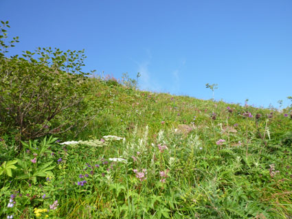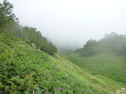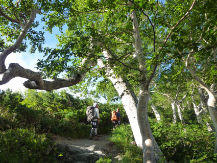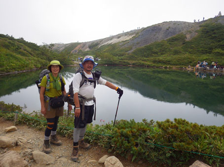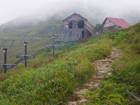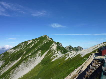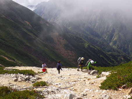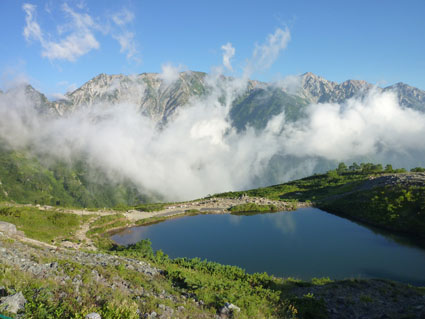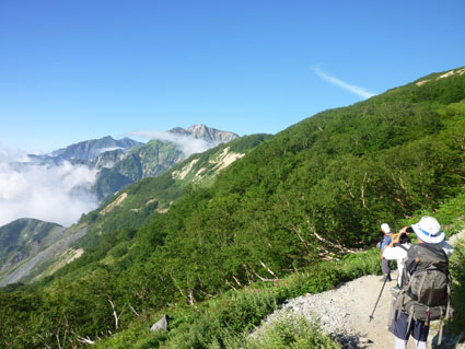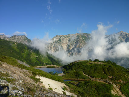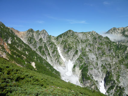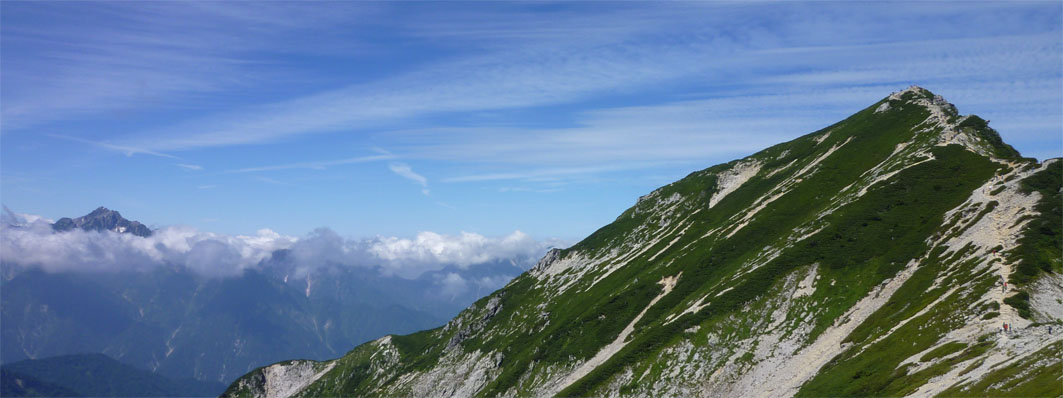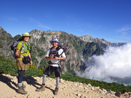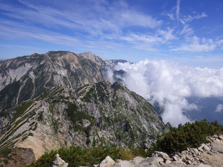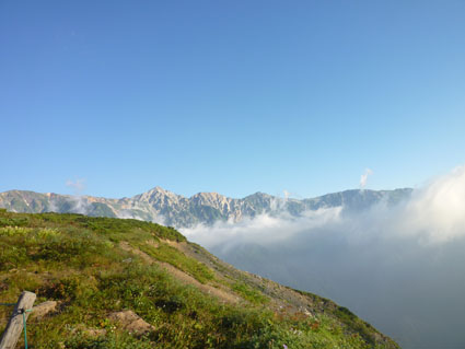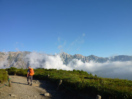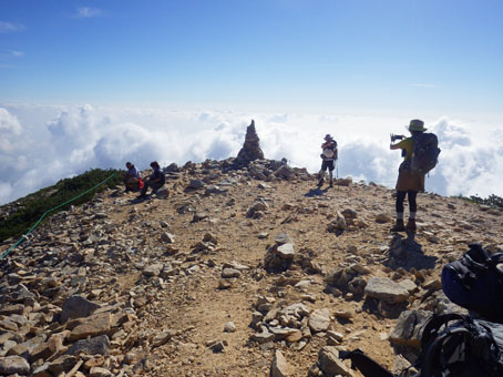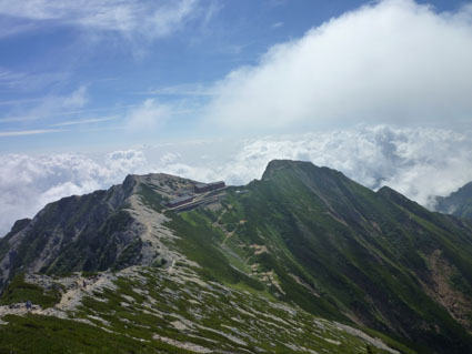 ![]() 剣岳と唐松岳 お盆休みを利用して唐松岳へ 郡山を出てから7時間強で今日の宿、八方池山荘に着いた ゴンドラとリフトに乗り、兎平まで来ましたが! 時間が予定より早かったのでTOPへはリフトに乗らず歩くことにしました ![]() 兎平リフト グランドクワットは歩き 兎平は観光客でにぎわっています 軽装で散策を楽しむ姿が多く 登山者は疎らで、重いザックを背負った姿が時折すれ違う ![]() 八方池山荘 癒しの時間 山荘に着くころはガスが立ち込め、山並みは隠れています 到着早々にすることは喉を潤すことだ・・・笑 ![]() ワイン タイム 14日の朝(白馬三山) ウッドデッキで飲んでると外の風景は見るみる変わってきます 白いガスが被い先ほどまでの展望は在りません リフトの最終がPM4:45分の為に時間とともに人影が消えた ![]() 尾根を歩く 八方ケルン 14日はAM5:30出発です 山荘を出るときは登山道に人の姿は在りません 曇っていました空も、歩き始めて30分くらいで青い空に変わります ゴロ石の尾根を登り八方ケルンに着く 顔の様に見えるケルンは尾根上で一番大きい道しるべと思う。 ![]() 不帰のキレット(左側の稜線) 八方池 尾根上からの展望は左から不帰のキレット~天狗の大下り 天狗の頭~白馬槍~杓子岳~白馬岳~小蓮華岳~白馬乗鞍岳~栂池と姿を現した ![]() 雪の重みで曲がった岳樺 お花畑 八方池を過ぎてダケカンバの林に入ると 雪の重みに耐えて生き抜く極端に曲がった木が登山道に在ります 林を過ぎて五竜岳側の開けた場所に出るとお花畑が現れた ![]() 鹿島槍~五竜岳 丸山(Sei&タッシーさん) 標高を上げると迫力の山々が近くなってきます 丸山の稜線に出ると一変する展望に視線が彷徨う、凄い風景だ! ![]() 丸山(Gonちゃん&タッシー) 丸山ケルン 湧き上がる雲海が演出する山は 生き物のように躍動感があり、 稜線が動き、ピークが背伸びしているように見えます ![]() 天狗の大下りを背景にSei 五竜岳 数十年前に来た時に、此処、同じ場所で撮った写真が在る その時を思い出してポーズをとってみました・・・笑 ![]() 不帰のキレット(1~3峰) 唐松山荘 稜線の展望場からキレットを覗き山荘へ向かう 小屋が近くなると風が強くなり気温が一気に下がります ![]() 唐松岳 最後の一登り 五竜分岐に在る小屋を通過して山頂を目指した ![]() 山 頂 Gonちゃん~タッシーさん(手のひらに剣岳) 山頂には数十人の登山者が居ます 皆さん360度の展望に喜び、 夢中になってシャッターを切っていました ![]() Sei & タッシーさん 白馬連山(眼下のキレット) 山頂からは遠望の槍ヶ岳や立山~剣岳~白馬連山が 振り返れば鹿島槍~五竜岳が、眼下のキレットを覗き込み一言 「縦走は・・・?」 ![]() 剣 岳 眼下の唐松山荘 素晴らしい条件がそろい、湧き上がる雲海に現れる山々は 神々しい風景だ 迫る展望を見てとれるのは、ピークに立った者にしか解らない感動と思う! ![]() 谷に咲く花 下山時の八方池 山荘で50分の休憩を楽しみ下山しました 八方池の周辺は凄い人盛りです 登りでは人影が無かったが多くの観光客の姿が在りました 動画をご覧くださいね! 戻る |