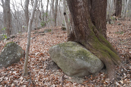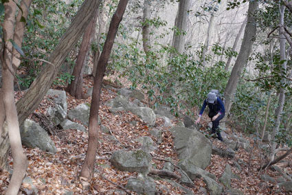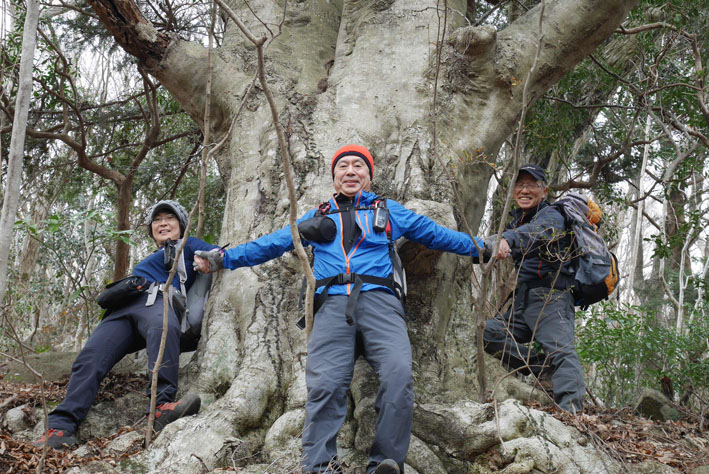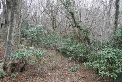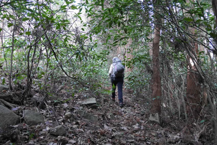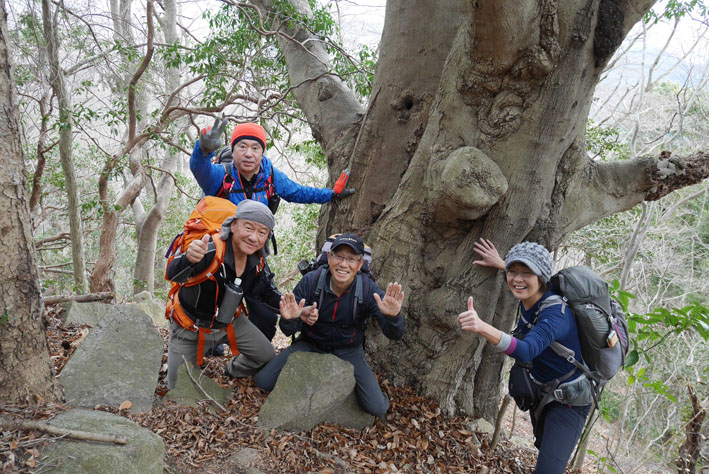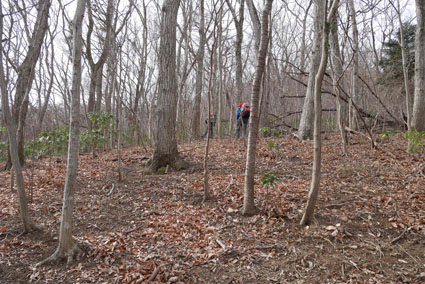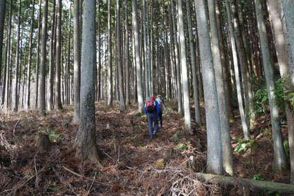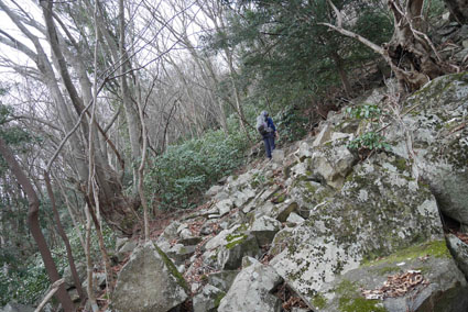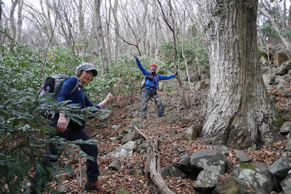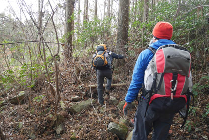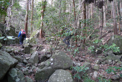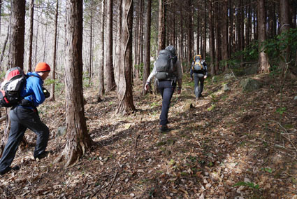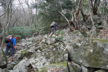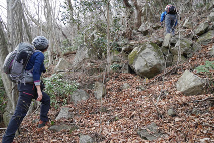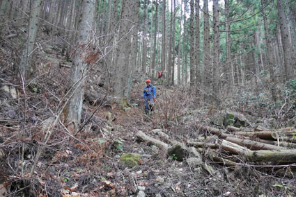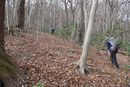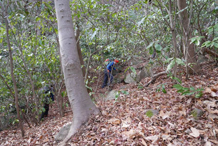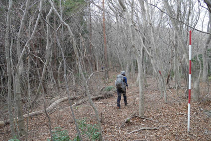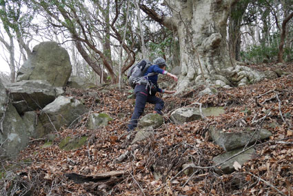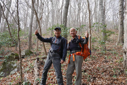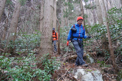 ![]() 湯の岳 2017年の初登山は いわき市に在る「湯の岳」です 低山の為に登山道を使わないで藪漕ぎを楽しむ事にしました ![]() 常磐道下(隧道) 杉 林 常磐道、湯の岳 P 近くに在る隧道脇に車をデポした 此処から道なき道を突き進むことになります ![]() 入山して間もない風景 目印・・? 藪を乗り越えて杉林に入る 此処は歩きやすく林業の方が入ってる場所なのか目印もありました ![]() 鬱蒼とした山肌 沢へ しかし直ぐにゴロゴロした山肌に一変します 取りつきが上手くいかないために沢筋を登ることにした ![]() 野バラの攻撃 楢 林 登り始めて1時間くらい過ぎたころから藪が濃くなり苦戦します 暫らくすると楢林に出た ![]() 歩きやすい場所に出た 抱き石の木 楢林は歩きやすく展望は無くても気休めの場所です 大きな石を抱いた古木も現れる ![]() 斜度が強くなる 岩 場 見た目では解らないが此のあたりから斜度が強くなります ![]() アセミ&アオキの藪 ガレバ アセミとアオキが入交行く手を拒む斜面に出た 今度は浮石が多いガレバが現れる ![]() 浮 石 楢の古木 前方の方でラークと叫ぶ声が聞こえた 見上げると大きな石が転がり落ちてきます 危ない と 言う 声とともに身をかわし事なきをいました ![]() 汗が噴き出る ラクの場所 一月と言うのに汗が噴き出ます 天気予報では曇り~午後は雨でした が ・・・ 午前中は晴天無風と登山日和です 其処でHaruさんが一言「ゴルフ日和」と言い直す一幕がありました・・・笑 ![]() 鎮座する大岩と巨木 アオキ&楢の藪 山頂まで残り三分の一くらいまで登った時に主が現れます ![]() 山の主(大ケアキ) 5人でも回らないくらいの幹の主はケアキの巨木です 何百年と言う歳月を過ごし この地に鎮座して下界の安全を守り 人目に触れることなく過ごしてきたのでしょうね。 ![]() Haruさん~Sei~Su-さん~Gonちゃん 木肌の艶もよく両手を広げてる様な形のケアキの前に並び写真を撮りました そして山の主に別れを告げて山頂を目指します ![]() 境界線のポール アンテナ 急斜面を過ぎるとなだらかな場所に出た 其処には境界線の看板とポールが現れ近くにはアンテナが設置されてます ![]() 山頂に在る鉄塔 ここで休憩する 登り始めて2時間強で山頂に到着した 数基の電波塔の様な鉄塔が在ります 此処で25分の休憩を楽しみました 休んでると風が出てきて雲行きも怪しくなります 午後は雨の予報なので急ぎ下山しました・・・笑 ![]() 展望のない山頂(Gonちゃん~Sei~Su-さん~Haruさん) ![]() 下山します 野バラが強い山肌 勿論のこと下山も藪漕ぎだ! 杉林の中でも野バラやタラノメのトゲが攻撃してきます 地図やGPSを見ながら急斜面や沢を避けて下りた ![]() 竹 林 謎の館 沢を下りた所に竹林が現れ謎の小屋も発見します 石積の箇所も在り山に残された歴史を垣間見ることが出来ました ![]() 下 山 隧道をくぐれば! 午前10:10分にスタートした私たちは午後2時に無事に下山 藪漕ぎでは多くの発見をすることが出来ました 展望もなく林と藪を突き進むだけの登山でしたが充実した山です Su-さん Haruさん Gonちゃんお世話になりました ・・・Sei・・・ 動画をご覧くださいね! 戻る |