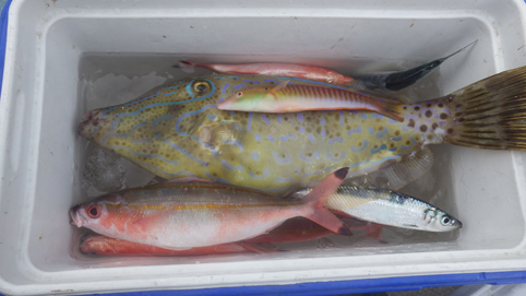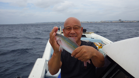 ![]() 嘉手納漁港 那覇からタクシーに乗り嘉手納漁港へ来ました 釣り船の予約はPM12:30分 既に他のお客さんは船に乗っています ![]() 漁港(係留場) 湾 内 漁港の係留場から船が出ました 湾内の波は穏やかだ ![]() サンゴ礁の岩 釣り船 之なら船酔いもしないだろうと気楽な乗船でしたが・・・ ![]() 沖に出た 揺れてます 港を出て30分くらいたつと波が荒く船が大きく揺れた 船長さんに気分が悪いと話すと遠くの景色を見て我慢できますか? 我慢できない様なら港に戻りますと優しい言葉が帰ってきました 船酔いの薬も飲んでいるに何だべ! 他の釣り客も4人いるだに帰るとは言いない 我慢すること1時間余り 少しずつ酔いが治まってきました ![]() 船酔いのSei 赤い魚 ? 釣りたい気持ちが勝り釣り糸を垂れるSei 早くもHITします ![]() 解りません? 気持ち悪い 気持ち悪いが釣れると緩和される不思議な現象だ 綺麗な色の魚が釣れます ![]() グルクン カワハギ グルクンやカワハギ等が釣れて元気になる! ![]() タモで上げた大物 60cm 名前は? 続いて道糸が海中に引き込まれる お~~~ なんだ おおきいど~~~ 船長さんが側に来て無理に上げないで糸が緩んだ時に巻いてとアドバイス! 暫く格闘して海面に現れた大物をタモですくい上げた ![]() ご機嫌のSei 雨が落ちて来た 今日は大物一匹で大満足のSeiでした その後 空が暗くなり雨粒が落ちて来て予定時間の4時間に迫ります ![]() 奇妙な岩 帰 港 船長さんが最後の一投で終わりに成りますと話され 無事に終了しました ![]() 船長(シマブクロさん) 釣り上げた魚(13匹の釣果です) 港に着くと船長さんが迎えのタクシーを呼んでくれた 何から何まで優しい方で 持ち帰りの魚はハッポウに入れて頂き夜の酒場へ・・・ 沖縄で初めての楽しい船釣りでした 動画をご覧くださいね! 戻る |