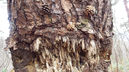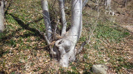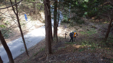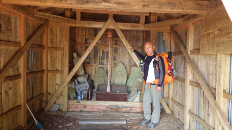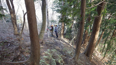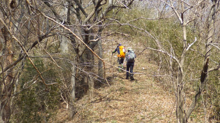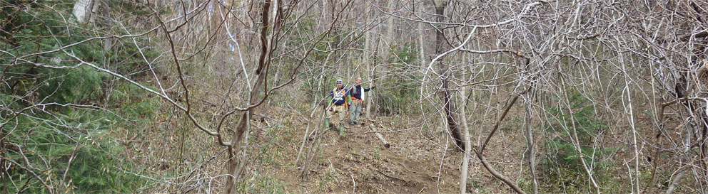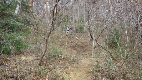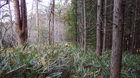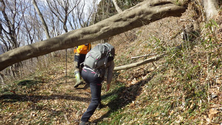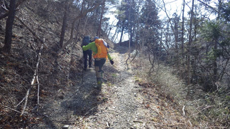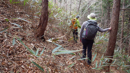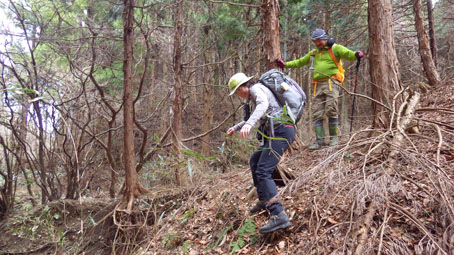 ![]() 藤ツルが多い山肌 先週に引き続き浜通りの山へ来ました 目的は尾根の山々を繋ぎ歩くことです ![]() 鈴宇峠 林 道 素晴らしい登山日和の中を鈴宇峠から歩き始める 最初の山は五社壇山頂です ![]() 降り注ぐ日差し ケヤキ 林道は比較的に整備されてる様ですが! 山へ入る人は少ない様子だ ![]() 荒れた登山道 分 岐 登山道は倒木が多く荒れています しかし自然の山道を歩くと言う贅沢な要望が満たされ楽しめた ![]() 五社壇 山頂 木登りGonちゃん 五社壇の直下は急斜面になってて低山ながら堪える道です 大きな松の幹に座ってるのはGonちゃん どうやら高いところがお好きなようだ・・・笑 ![]() 急斜面 峠に下りた 五社壇からは一旦 峠まで下りなくてはならない 登っては下りるを繰り返すのが尾根歩きの醍醐味と思う・・・苦笑 ![]() 福田峠 地蔵森へ登ります 縦走路に在る唯一の車の通れる峠です 此処から地蔵森へと登り返すのだ ![]() 石 碑 石 積 登り口には歴史を感じる石碑と 少し離れた所には石積のくぼ地が在りました ![]() インレイソウ 神 社(地蔵森山頂) 今回の縦走路で見つけた花はインレイソウ一輪です 歩き始めて1時間40分 地蔵森のピークに着きました ![]() 地蔵さん 境 内 神社の中には地蔵さんが祀られています 境内は広く桜の木が多くみられた 花が咲くころには山頂で花見をする光景が浮かぶ。 ![]() 地蔵森鳥居 参 道 踏み跡程度の道を下りると鳥居が在り 其処から先は車が通れるくらいの林道が作られています 祭事には此処まで車が入るのかな・・・? 等と話しながら下りたが進む方角が違うのに気づきます ![]() 踏み跡から外れる 藪越え 登り返すのは面倒と方向を定めて藪へ突入した ![]() 藪から尾根筋へ 林道に合流 藪越えを楽しみ斜面をトラバースして林道へ ![]() 分岐に出ました 権現堂山 分岐に着いて地蔵森に辿る道を見つける どうやら神社の後ろあたりから 尾根筋に下りると藪越えをしなくても良かったようだ・・・笑 ![]() 尾根から見る太平洋 眼下の展望 東の眼下には木々越しに海原を見ながら歩くことが出来ます 対面には阿武隈山地の山々が連なってた ![]() ツルが張巡る登山道 主義山 尾根筋の道はツルが張巡り荒れてる場所が多く 木々の葉が出てくれば視界は無くなるだろうな・・・? 楽しむなら今の時期か晩秋のころでしょうね! ![]() 音羽山 怪獣・・? 尾根歩きも5座目のピークに着きました 低山でもアップダウンを繰り返す道は結構体力が消耗いたします ![]() 金華山 小斎峠へ 今日の最終ピークは金華山 此処から小斎峠へ下りると車のデポ地へ着きます ![]() 峠のデポ地 真弓清水 峠に着いたのはPM2時10分だ 今日のコースタイムは4時間50分 歩いた距離は8・97km 累計昇量は783mでした タッシーさん Gonちゃん お疲れ様でした 続きの尾根歩きは新緑の季節かな? ・・・Sei・・・ 動画をご覧くださいね! 戻る |