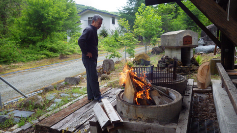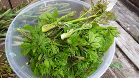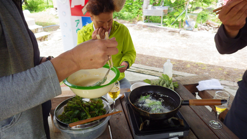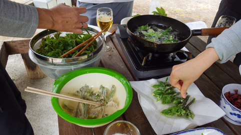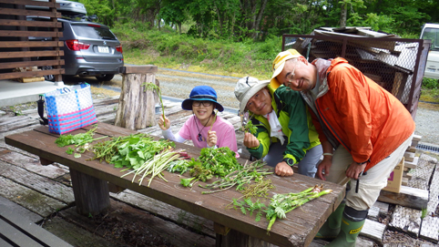 ![]() 深山へ入り山菜を採る キャンプが中止になり山小屋へ集合です 今は山菜の美味しい時期で深山の基地へ出撃いたしました ![]() 山が屋から出撃 野草が綺麗 小屋から出かける山仲間です 広場には野草の花々が競うように咲いていた ![]() 藪 を! 奥へと 藪を超えて山菜の寝床へ突撃です ![]() 野ばらが生えてる ニンジンソウの花 藪には野ばらが地面を被う様に生えていました 野を飾る白い花はニンジンソウです ![]() 櫛ヶ峰 山菜を探す 曇り空の奥に見える尖がりは櫛ヶ峰 裏磐梯の裾野に広がる山肌は山菜の宝庫でもあります ![]() 林道歩き! 談合・・・? 林道を歩き立ち止まり集まる姿を発見した なかなか解けない まさか深山で山菜談合か・・・笑 ![]() ワラビの基地に着いた 折り返し地点 ワラビの基地は時期既に遅し開いたホダが並んでます 突き進むと渓流の合流地点に着いた 此処から先は危険個所が在るので折り返すことに! ![]() シダの写真 中心を見る 多きなシダが並んでると豪快さも感じる 私の好きな風景です ![]() 帰りました 選 別 2時間の山歩きで適当に山菜を採り小屋へ帰る! 早々に選別をして食べる準備にかかりました ![]() 焚 火 コシアブラ&タラノメ 焚火は虫よけに欠かせない行事です・・・笑 木片を運び自ら担当を申し出たHaruさんが火種を消さない様にマブッテいました ![]() 天ぷら 揚げたてです 天ぷらを次々と揚げてゆきます 揚げたては美味いと お酒とともに腹の中に消えて行くので在りました ![]() 数種類の天ぷらが出来ました 小屋では! 東小屋での宴会も夕方には終わり小屋の中に入る 外は雨が降り出した 小屋の中に入っても美味しい料理が所狭しと並び 笑い声が震撼し・・・楽しく時がすきました 皆さん ありがとうございました Sei 動画をご覧くださいね! 戻る |