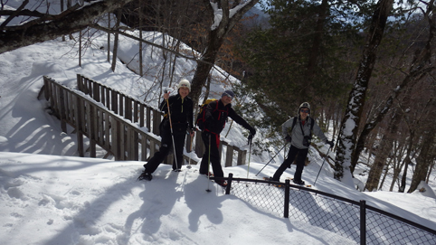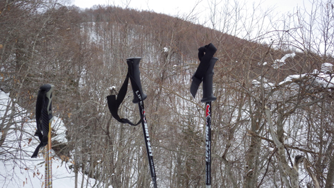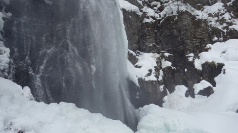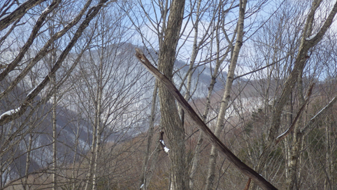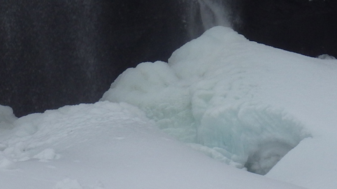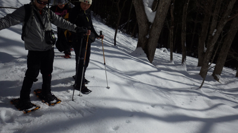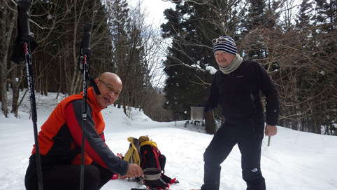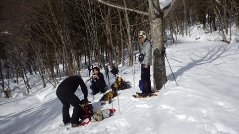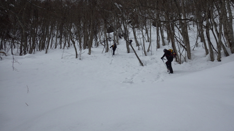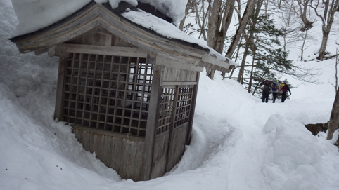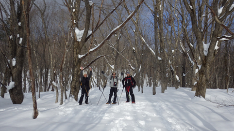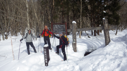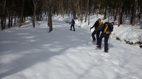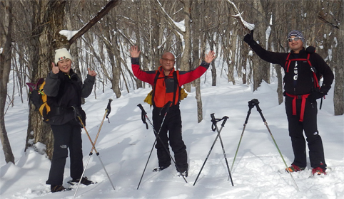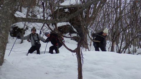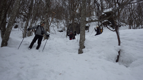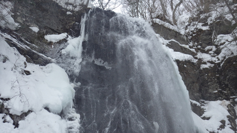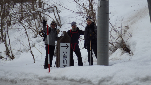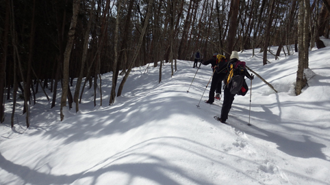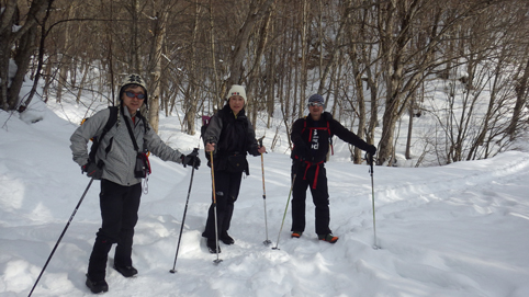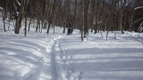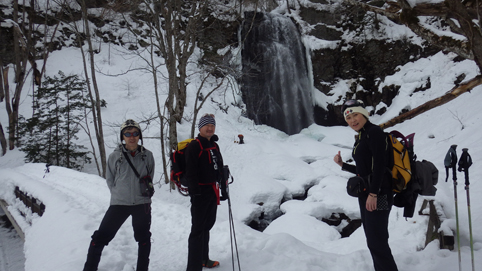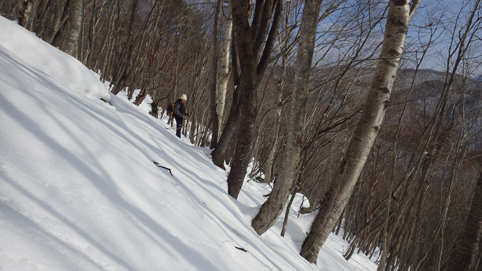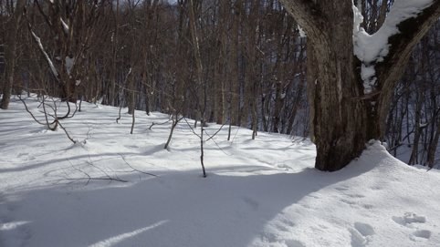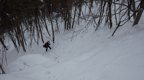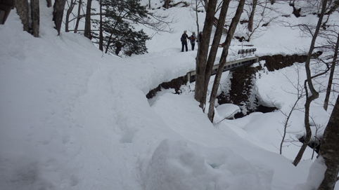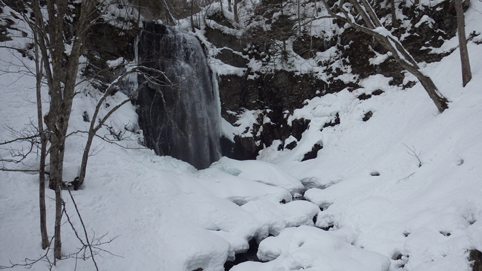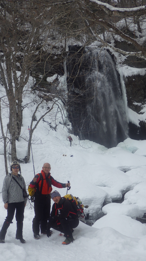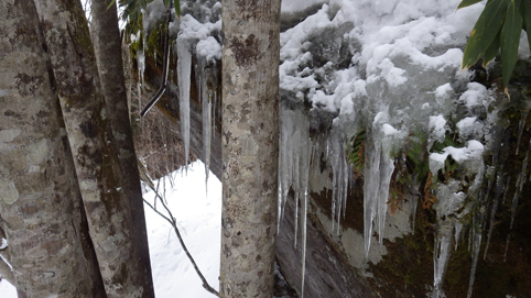 ![]() 陽だまりのスノーハイク 今日は朝から良い天気に恵まれました ブルーフォールから楢平「仮称」までのスノーハイキングを楽しむ予定で出発です ![]() 道標(小野川不動滝) ハイキングコース入口 不動滝入口へ着いた時には既に汗ばんでくる陽気だ ![]() 楢の巨木 踏み固められたトレース ブルーフォールまでのコースは踏み固められて! スノーシューやワカンを付けなくても沈みません ![]() 不動滝(神社) 林道に在る橋 歩き始めて30分強でブルーフォールに着いた 神社が祭られている脇を進むと橋の架かる場所に出ます ![]() 不動滝(ブルーフォール) 曝 流 曝流となって落ち込む滝は凍りついて青く色付いているはず しかし気温が高い日が続いたためか・・・? ![]() 不動滝前にて!(Takaさん・Sei・タッシーさん) Gonちゃん 雪化粧の中に豪快な流れの滝を見ることが出来ます ![]() 滝と渓流 氷の彫刻(色が薄かった) 滝の落ち込みには青い雪の層を見ることが出来ました ![]() 斜面を登る 楢平へ向かって! 滝の探索を終えて向かう先は楢平「仮称」です 急斜面を直登する予定でしたが雪が崩れて登ることが出来ません・・・笑 ![]() 休 憩 急斜面(35度・・?) 敢え無く挫折し、途ちゅの急斜面で休憩をすることに成る 汗をかいた後の冷たい泡は特別な味でした ![]() 一旦下りた 楢林の雪面 一旦下りてトラバース気味に進みます ![]() 氷 柱 動物の足跡 岩に張り付く氷柱や動物の足跡などを見つけて話がはずむ! ![]() 陽だまりのスノーハイク 床のない橋・・・不思議 林道へ着いてからは目的のピークを回り込む様に進みます 行く先で見つけた橋げたの様な工作物には床が在りません・・・? どう見ても沢に架かる橋なのだが! ![]() ホットワイン休憩 美味い 陽だまりの平らな場所ではホットワインを頂くことに 沸かしすぎたか熱くて飲めない(笑) 雪面にカップを置いて適温になったワインは極旨でした ![]() 楢平へGo~ 到着(標高1000m) 午後に成り雪面が緩んだ為にワカンやスノーシューを付けて歩く ![]() 予定コース完結 大早稲沢山方面 予定のピーク楢平「仮称」に着きました 快晴無風の雪山歩きは爽快で楽しさ満載です ![]() 眼下に見える小野川湖 急斜面を下る 眼下に見える小野川湖や大早稲沢山方面の風景を楽しみ下山 ![]() 下 山 車デポ地 車のデポ地に着いたのは歩き始めて3時間強のスノーハイクでした 山スキーも楽しいが歩きも良いもんだと話がはずむ・・・笑 皆さん又計画しましょうね! 動画をご覧くださいね! 戻る |