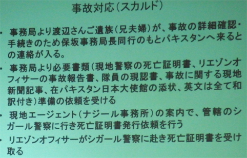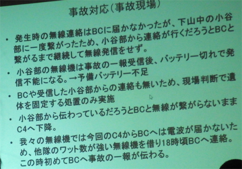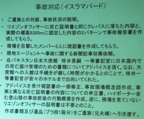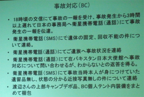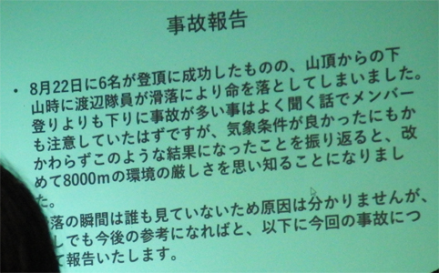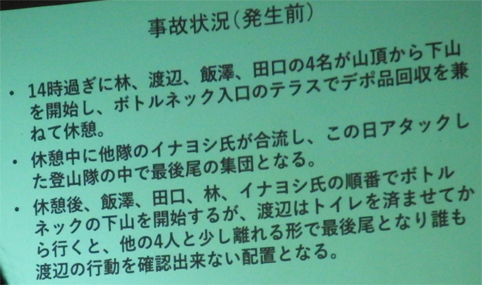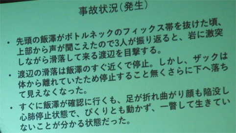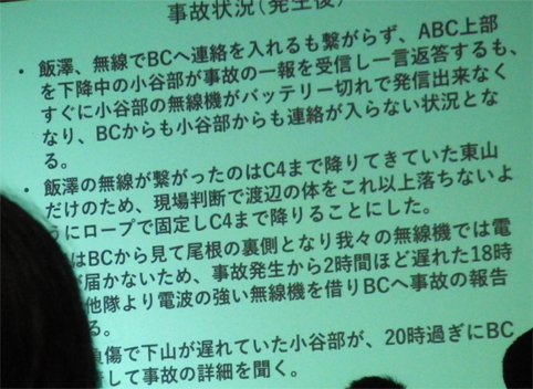![]() 蔵の宿 「菱風荘」 17日 新潟県で第16回 北日本海外登山研究会が開催された 東北の各県を始め栃木・埼玉・東京・山梨・大阪から 50名の参加でした ![]() 案内図 受付本館 会場は新潟県「福島潟」の側に在る 蔵の宿「菱風荘」 ![]() 担当幹事(Sirakuraさん) 代表(Hosakaさん) 担当幹事の挨拶を頂き会が進行されます 続いて代表のお話を頂きました 会の発足当時のことや経過を交えて現在に至る粗筋を聞くことが出来ました その後 亡くなられた会員2名を悼み黙祷 ![]() 協賛社(大塚製薬) K2報告(Oyabeさん) 遠征時などに栄養補助食品を協賛していただいてる 大塚製薬様の新製品の案内が在りました 続いてK2登山報告を 隊長のOyabe様から講演をいただきました ![]() 登頂報告(Higasiyamaさん) 遠征準備 登頂報告の講演はHigasiyamaさん 遠征時の荷物梱包の苦労や隊員の活躍などを聞くことが出来ました ![]() K2登頂 登頂装備 会場には! K2 遠征時の装備品が展示されてます ![]() 懇親会 福島潟 6:30分より懇親会が開催される 50名の参加は私が知る限りでは一番多い ![]() 世界一周の旅(Iwamaさん) ヨルダン遠征(Togaiさん) 18日は 世界一周の山と旅の講演を Iwama様からいただきました 続いてTogai様からヨルダン遠征 月の砂漠でジャベルラムを登ると題して講演をいただきました ![]() 小屋番から世界の高峰へ(Tagutiさん) 後半は「小屋番から世界の高峰へ」の講演を Taguti様から頂きました 皆様からの講演は途轍もない高みの道と思う中で感動の連続でした 2018・08・22 K2 登頂 下山時に滑落 ![]() 報告ー1 報告ー2 ![]() 報告ー3 報告ー4 ![]() 報告ー5 報告ー6 ![]() 報告ー7 報告ー8 ![]() 事故報告ー9 事務局(Takahasiさん) Watanabe隊員の事故報告を聞き ご冥福を祈ることしかできませんでした 合掌 K2登頂 世界の最高峰へ また世界一周の旅やロッククライミングなど 皆様のご活躍にエールを送ります 戻る |