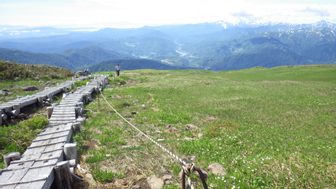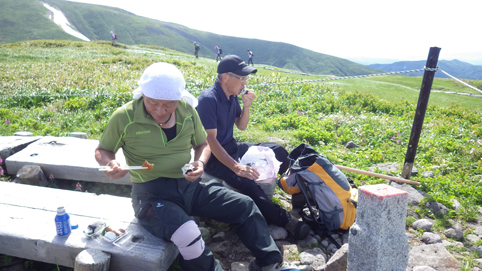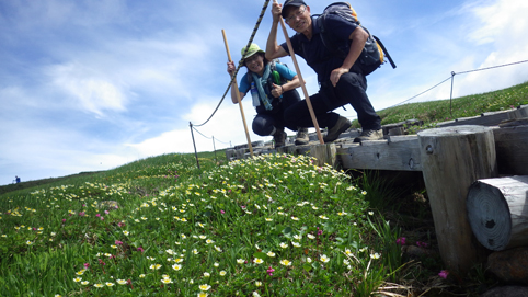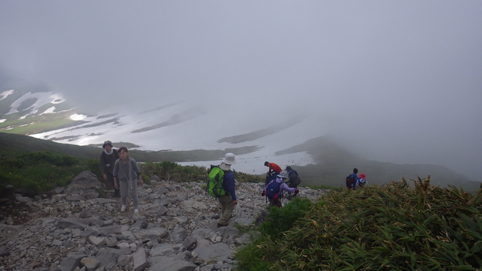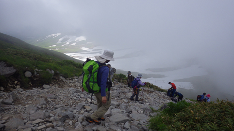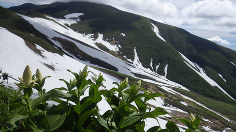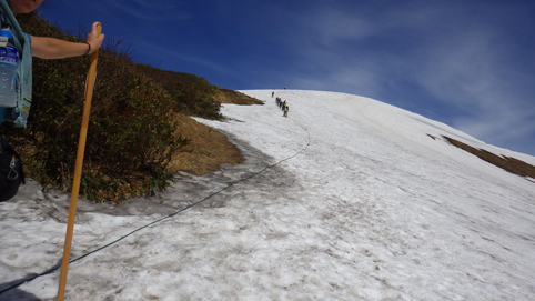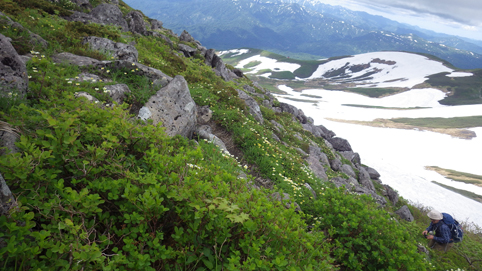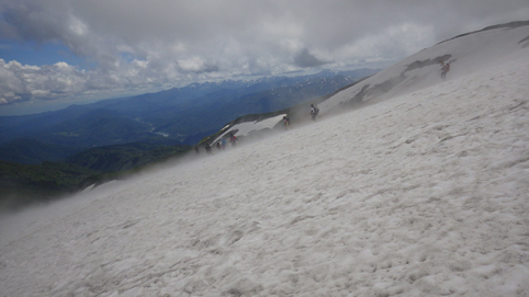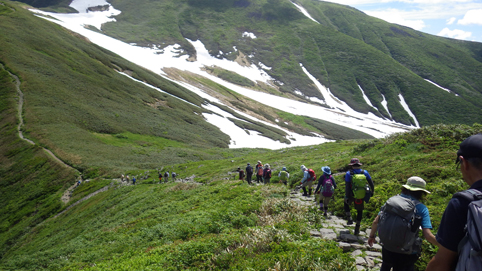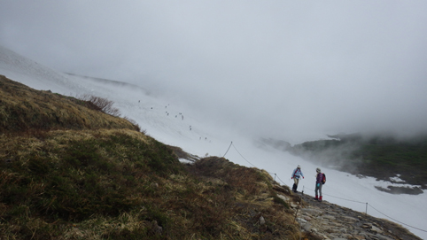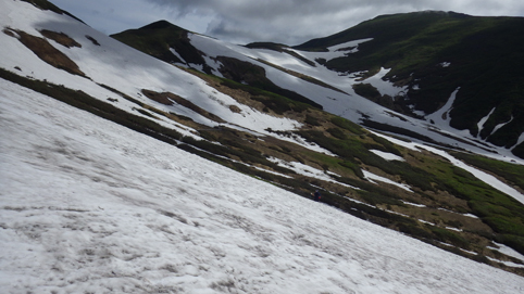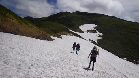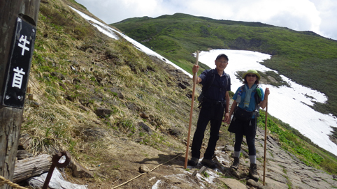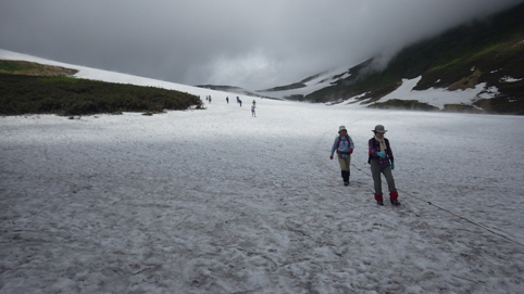 ![]() 姥ヶ岳山頂(大朝日岳~以東岳) 昨日は羽黒山から湯殿山へ参拝に行ってきました 三座目の山は月山です 朝から晴れ渡り素晴らしい天候に恵まれました 開山の日は雨が降ると言われてますが予想が外れ嬉しい山日和です ![]() 姥沢駐車場 姥 沢 姥沢駐車場に着くと既に車が埋まりつつあります 8時からリフトが動くと聞き 急ぎ準備を整えて乗り場へ向かいました ![]() ニッコウキスゲ 姥ヶ岳雪渓 リフト乗り場のニッコウキスゲが見ごろを迎えています リフトに乗り標高を上げると姥ヶ岳の斜面が見える 例年ですと多くの夏スキーを楽しむ姿が在るのですが・・・? ![]() リフト終点道標(Sei&Su-さん) Su-さん&Gonちゃん リフト終点に在る道標で写真を撮り山頂を目指す 姥ヶ岳の斜面にスキーをしてる姿がチラホラ確認できた(少ない) ![]() 姥ヶ岳への雪渓登り 雪解け水を集める四ツ谷川 姥ヶ岳の斜面は急勾配だ 皆さんの足元を見ると軽アイゼンを付けてる人が多い 四ツ谷は雪解け水を集めて水量が増している事だろう! ![]() 姥ヶ岳の木道 姥ヶ岳(お花畑) 急斜面を登り切ると姥ヶ岳のなだらかな山頂に出た 池塘が点在し、色とりどりの花が咲いています ![]() 姥ヶ岳山頂 休 憩 山頂に着くと爽やかな風が吹いてる 少し下った行きどまりの木道で遅い朝食を頂きました ![]() 南に望む展望(大朝日岳方面) コバイケイソウ 食事をとった場所からは 以東岳や大朝日連峰が目の前に広がっています ![]() 列をなす登山者 雪渓歩き! 姥ヶ岳からは一旦下り、湯殿山の分岐を経て月山方面へ 石段を登り雪渓に取りついた ![]() 小さな白い花が! 丑首分岐 丑首の分岐から再び雪渓を歩き進むと 最後の急登が待っています ![]() シャクナゲ 鍛冶小屋跡(岩場) 大きな岩場を登り着いたところが鍛冶小屋跡だ ![]() 鍛冶小屋跡(祠) クロユリ 今年で22回目の出羽三山巡りですが 最初の頃は鍛冶小屋へ泊まり風呂で汗を流したこともありました 今は残された木材が名残を惜しんでいます 稜線にはクロユリの花が咲いていました ![]() 山頂神社への列 月山神社(Sei~Su-さん) 山頂に着くと山頂神社へ長蛇の列が! 開山日とあって登山者やお参りする人々で凄いことに成っています 並んでから30分くらいで神社へ入ることが出来ました 寒く、休む場所もないために鍛冶小屋跡まで下り休憩をします ![]() シラネアオイ 下 山 休憩を終えて下山開始するとガスが立ち込めホワイトアウトに! 足元に注意しながら下った ![]() ガスが係る 視界不良 何度かガスが立ち込め視界不良になるが 雪渓にはロープが張られて安全に下ることが出来ます ![]() 幻想的な風景 ガスが去る ガスの中に現れる幻想的な絵に視線がうろついた ![]() 急斜面の雪渓 斜度が緩む 急斜面の雪渓も転ぶこともなく下山 22回目のお参りを終えることが出来ました ![]() 休憩所 月山蕎麦 蕎麦汁 志津温泉「えびすや」さんで食べた月山蕎麦がとても美味しい また食べたい極旨の山菜そばです 動画をご覧くださいね! 戻る |