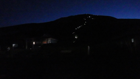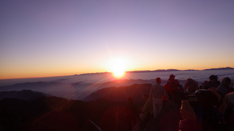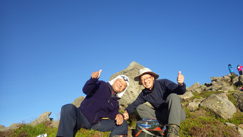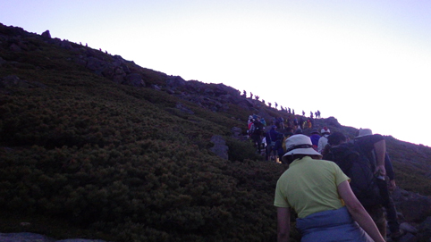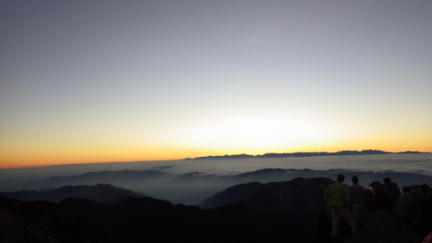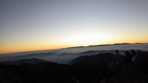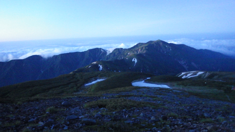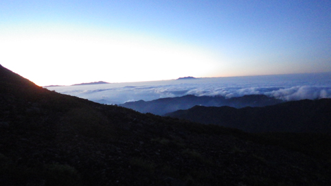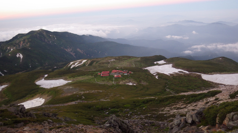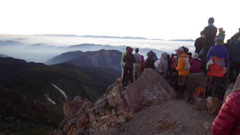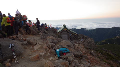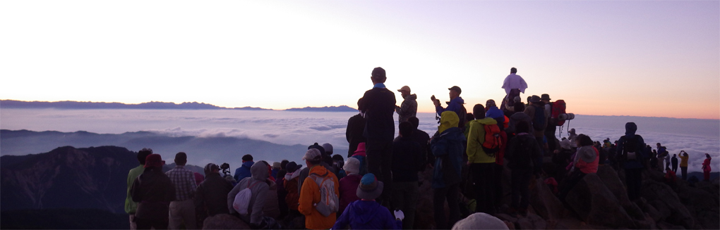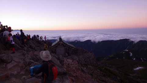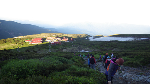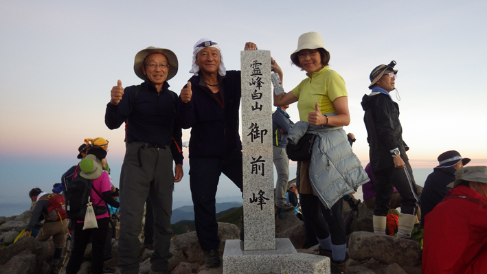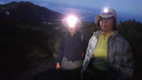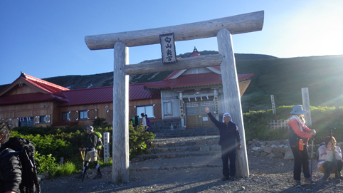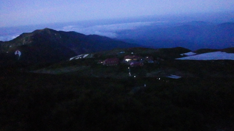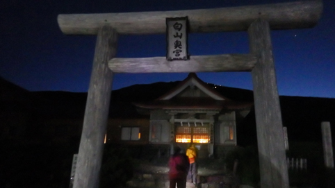 ![]() 御前峰(日の出を待つ登山者) 起床はAM3:30分、山頂でご来光を拝む予定です 早めに寝たので疲れも取れ快調な目覚めだ ![]() 列をなすヘッデンの灯り 白山奥宮 AM4:46分の日の出に合わせて4時に小屋を出ます 白山奥宮の鳥居を潜りヘッデンの灯りが繋がる登山道を進む! ![]() 暗い登山道の登り 眼下に見える白山室堂 登山者の列で歩みが遅く日の出まで山頂に着くか心配になった ![]() 雲海に浮かぶ北アルプス 大倉山 暗い足元とは裏腹に薄明りの中に見えるのは 北アルプスの山々や尾根が連なってる大倉山です ![]() 高天原 数珠繋ぎの登山者 高天原まで来るとヘッデンが要らなくなる 見上げれば連なる登山者の姿が在った ![]() 山頂にて(Su-さん~Sei~Gonちゃん) 夜明け前(AM4:00時)に山頂に着く 登山者の方にお願いして三人で写真に納まることが出来ました ![]() ご来光を待つ登山者 奥宮神社 日の出を待つ登山者が並ぶピーク ![]() 雲海を染める 待ち構える登山者 雲海を染めて、いよいよ平成30年7月15日の夜明けです ![]() 眼下に見える白山山荘 日の出の時 眼下の山荘を眺めて一刻一刻すぎる時を待ちます ![]() ご来光 AM4:46分 AM4:46分 ご来光です ![]() 歓声を上げる登山者 休 憩 登山者が一斉に拍手を送り歓声が沸き起こった バンザーイ と 手をかざす人やカメラを覗く人などの模様が映し出されます ![]() 下 山 クロユリの群生 山頂では45分の休憩を楽しみ下山しました 室堂にはクロユリの花が群生しています ![]() 室堂奥宮の鳥居 吊り橋 奥宮の鳥居を潜り室堂を後にしました 下山は観光新道を下る予定でしたが往路を忠実に下る ![]() 吊り橋を渡る 無事に下山 途中に在る甚之助小屋跡で朝飯を食べた 次に中飯場で10分ほど休憩して別当出合に着いたのがAM10:00時です ![]() 一里野温泉 イルミネーション 早い下山だったので道の駅や観光地に寄り時間調整して 今日の宿 一里野温泉街へ行きました 白山開山1300年を記念してスキー場にイルミネーションが灯されています ![]() 温泉街 お泊りの宿(つるのや) 温泉街をぶらり歩いてホテル「つるのや」に戻る 美味しいご飯に旬の野菜などでお腹を満たし二日目の眠りに着いた 動画をご覧くださいね! 戻る |