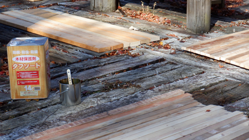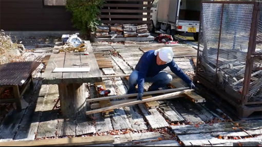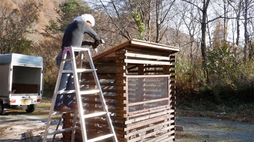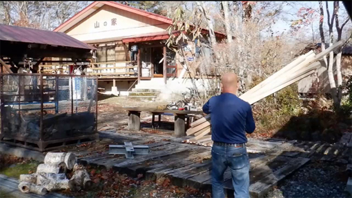 ![]() 秋晴れの山小屋で(薪BOXビフォーアフター) 秋晴れの13日 AM8:30分に家を出ます 山小屋に着いたのは1時間後で早々に作業開始でした ![]() 鉄のBOX 深山に適さない! 今までは鉄で出来てる薪BOXが自然の山小屋へは適さないと思っていました 木彫の外観にしたら良いのではと思って俄か大工が腰を上げる(笑) ![]() 資材を運びます 荷降ろし 前日にした工作をした材料を軽トラで運び 荷降ろしから段取りと全て一人で作業にかかりました ![]() 防虫防腐剤 塗ります 一番最初の作業が防虫防腐剤を木に塗る仕事です ![]() 一人大工 素晴らしい天気 次に寸法を揃いて柱を立てる ![]() 休む暇がない! 材料をセット(仮止め) 60本の横板(四方)に防腐剤を塗る仕事は大変です 次に柱を立てる為に仮止めだ ![]() 組立てに入ります 少しずつ 柱を立てるのにテコが居ないため余計な作業が増えます 昼飯も食べずに夢中に成って組み立てた ![]() 防腐剤を塗る ビス止め ある程度出来たら二度目の防腐剤を塗ります 最後に屋根を付けて完成だ ![]() ほぼ完成 完 成 作業開始から6時間が経つころ形に成ってきました ![]() 鉄 BOX 木彫に変わる 薪BOXも鉄篭から木彫に変わり自然の中に溶け込みます 材料費は合計で¥7000くらいでした 動画をごらんくださいね! 戻る |