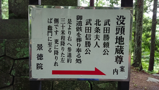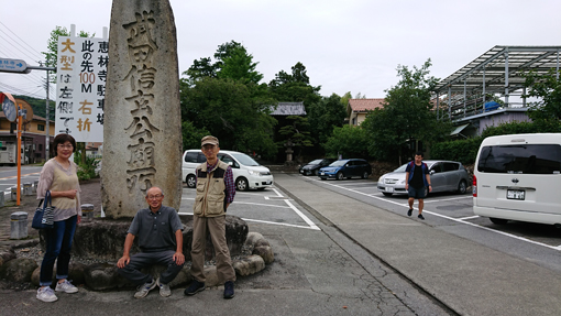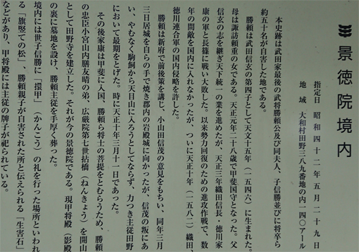 ![]() 甲州市内の風景 山梨県甲州市に在る景徳院・恵林寺へ武田一族の歴史を偲び訪れた 福島をAM5:30分に出発して着いたのは正午を回っていました ![]() 景徳院 道路側に階段を上る参拝道がある 駐車場は曲がりくねった細い坂道を進むと20台は置けるような広場があります ![]() 武田勝頼の墓 境内に在る山門 景徳院は勝頼公の死を弔う為に徳川家康が建立しました ![]() 本 堂 案内板 山門を入ると、「本堂」を挟んで「旗竪松」・「鐘楼」があり そばに「歌碑・武田慕情」・「人形塚」があります 本堂、庫裏などは、昭和53年(1978)に再建されました。 ![]() 甲将殿 勝頼公の墓 甲将殿 (影殿) 甲将殿には武田勝頼主従の位牌が祀られています。 天正10年3月11日この地に おいて織田・徳の連合軍と戦い一族と共に自害して果てた。 時に、勝頼37歳、夫人19歳、信勝16歳であった。 ![]() 墓 石 境内の様子 徳川家康が入国の時、 勝頼以下約50名の菩提のため田野寺(景徳院)を建てた。 ![]() 武田信玄公 恵林寺 景徳院の参拝を済ませ恵林寺に来ました 元徳2(1330)年、夢窓国師が開創した ![]() 参拝道 赤 門 年輪を感じる桜や杉の古木が並ぶ参拝道を進むと赤門に着いた ![]() 三 門 庫 裡 禅寺のなかでもめずらしい、日本有数の大庫裡。 信長による焼き討ちの後、徳川家康によって再建された 壮大な伽藍は、明治38年の火災によってそのほとんどを焼失。 現在の本堂、庫裏も、明治末期に再建されたものである ![]() 境 内 蓮の花 恵林寺は、臨済宗妙心寺派の名刹です。 元徳2年(1330)に、甲斐牧ノ庄の地頭職(領主)をつとめていた 二階堂出羽守貞藤が、夢窓国師を招き、自邸を禅院とし創建しました。 ![]() 境内にある鬼瓦 忠魂碑 天正10年(1582年)、甲斐へ攻め入り武田を滅ぼした 織田軍は恵林寺をも焼き討ちしました。 すでに信玄によって招かれていた臨済宗の僧 快川紹喜は、 「安禅必ずしも山水をもちいず、心頭滅却すれば火も自ら涼し」 という有名な句を残して他の僧とともに焼死したと伝えられています。 ![]() 仏舎利宝塔 お泊りの宿(川口園) 武田信玄は戦国時代の武将で、名は晴信で出家して信玄となった。 風林火山の軍旗の下、強大な武田軍を率いて 勢力を広めた戦国時代の代表的な武将の一人である。 甲斐の大名で、軍師の山本勘助を従え、駿河・信濃を征服して、 上杉謙信と川中島で何度も戦ったが、結局勝敗はつかなかった。 その後、京都に大軍を率いて上り、天下に勢力を示そうと軍を進めた。 1572年には、三方ヶ原で織田・徳川の連合軍をやぶったが、 この直後に病でたおれ、翌年に亡くなった。 後を継いだ子の武田勝頼は長篠の戦で、織田・徳川の連合軍にやぶれ、 以後、武田家は急速におとろえていった 歴史人物より抜粋 寺巡りも歴史を知ることによって感じる事が変わり 先人たちの偉業と戦国時代の壮絶な戦いが脳裏を過りました ![]() 宿からの風景 ぶどう畑 寺巡りを終えて宿へ着いた ワイン畑に囲まれた場所にあり二階の部屋から見下ろすと葡萄畑が見える! ![]() ハウスワイン BBQ 宿に着くなりハウスハインを頂き宴会突入です 早朝の出発と移動の疲れからか酔いが回るのが早い事・・・笑 結局寝た時間も記憶になく朝を迎える事となりました 動画をご覧くださいね! 戻る |