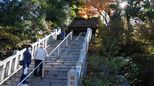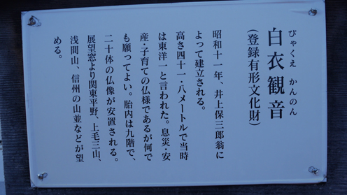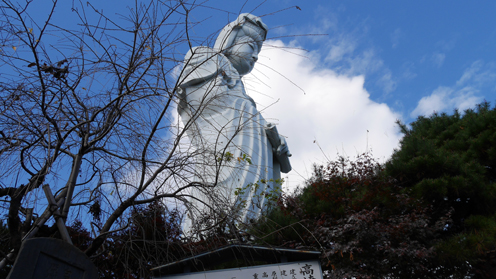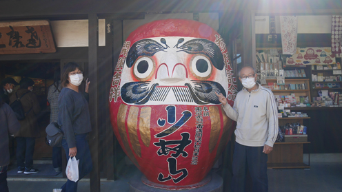 ![]() 紅葉の中に「高崎白衣観音」 観音山と呼ばれる丘の頂上に立つ白衣観音は 上毛カルタに白衣観音慈悲の 御手の札で紹介され群馬県民には広く親しまれています 地元では「白衣」を「びゃくえ」ではなく「びゃくい」と 読むのが一般的になっています この像は市内の実業家 井上三郎氏が昭和9年(1934年)の陸軍特別大演習の祭 昭和天皇に単独で拝謁できたことを機に 観光都市高崎の建設・陸軍十五連隊戦死者の慰霊 社会の平和などを祈願して建立したものです 上記の様に紹介されています ![]() 参道のお店 慈眼院本堂 路肩に車を止めて参道を進みます 茶店が並ぶが灯りが消えてたりシャッターが閉まってる建物が多い ![]() 案内板 観音様の背景 観音様は何処からでも圧巻の存在です ![]() 観音様横顔 御朱印 以前は多くの参拝者で賑わっていたと聞きますが! 歩いてる人は疎らでした ![]() 参道の茶店 紅 葉 丘の木々は紅葉真っ盛りです ![]() モミジの中に観音様 空に浮かぶ観音様 色んな表情を見せる観音様 これからも高崎の皆様を見守り続けることでしょうね~ ![]() 少林山達磨寺 大達磨 次に訪れたのは少林山達磨寺です 細い道をくねくね走り境内に在る駐車場に入りました ![]() 石段の参道 境 内 参道や境内の木々は赤や黄色に染まり青空と見事なコントラストです 銀杏の落葉が地面を彩り際立つ光景でした ![]() 鮮やかな木々 並ぶダルマ 達磨堂には縁起の良いカラフルなダルマが並んでいます 白色のダルマを求めました ![]() 達磨寺に納められたダルマ様 裏てのダルマ様 建物の軒下には供養される多くのダルマさんが置かれています ![]() 達磨堂 堂内の達磨様 年間を通じてダルマが納められてる本堂のほか 全国各地のダルマが展示されている達磨堂 ドイツの世界的建築学者ブルーノ・タウトが居住してた 洗心亭など見どころがいっぱいです ![]() 瑞雲閣 招福の鐘 石段を下りると瑞雲閣や招福の鐘が在る 御朱印やお守りを求める人で賑わっていました ![]() 観音堂への石段 観音堂 一旦おりた境内を登り観音堂でお参りを済ませて 達磨寺を後にしました ![]() ミカン狩り ミカン林 予定コースの最後はミカン狩りです 此処は去年も来た所だ 去年は雨が降ってる時で苦い思い出の在る所ですが! 今日は素晴らしい天候のもとで楽しめそうです ![]() たわわに実ってるミカン 甘くて美味い! 山肌全体を埋めてるミカン畑で 早々にミカン狩り開始です・・・笑 ![]() 頭になったミカン お土産です 甘くて美味しいミカンを食べて笑顔が弾けます 頭のテッペンにミカンが付いているような写真を発見しました 食べたほかにお土産まで付いて¥500と懐にも優しいです こうして楽しい「いいとこ旅」がおわりました 動画をごらんくださいね! 戻る |
