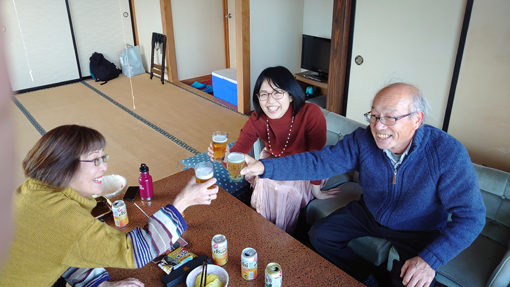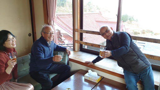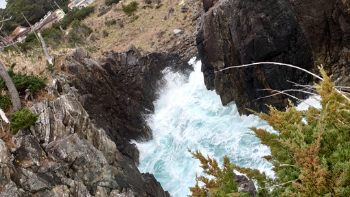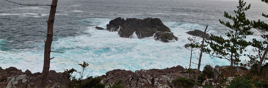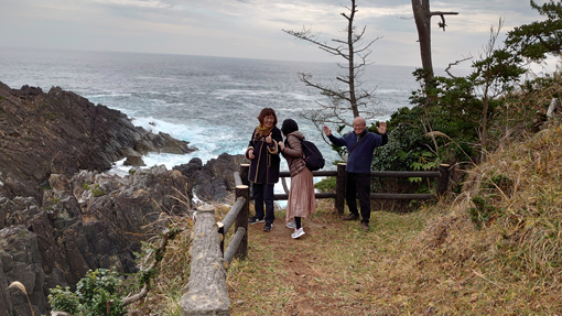 ![]() 唐桑半島(御先海岸) 忘年会の為に唐桑半島に来ました 初日は晴れで! 二日目は曇り空ですが寒くもなく観光には良い条件です ![]() 案内板にて! ハイキングコース(道標) 御先海岸の断崖絶壁を探索いたします 歩き始めは余裕でしたが崖の上に立つと腰が引ける姿が見られた ![]() 探索コース 断崖の荒波 最初に現れた崖の上に立つと! 荒波が轟音響かせて岩にぶち当たる様に 怖~いと叫ぶ声在り ・・・(笑)・・・ ![]() 打ち寄せる白波 うねる海原 透明度の高い海面ですが白波がうねっています ![]() こおきじま 由来の案内 荒れた海の為に戻る事が出来なくて子供を置き去りにした島です しかし穏やかになり島へ行くと! 無心に遊ぶ子供がいたと伝えられています ![]() 断崖に立つ人影 釣り人 鋭い岩肌 断崖の足元 打ち寄せる荒波 其処で釣りをする太公望の姿を見て「絶対無理」と話し声が聞こえた ![]() 小さな漁船 断崖の太公望 うねる海原で小舟で漁をしています 時おり大きな波に隠れて船が見えなくなる大丈夫なのか? 心配をよそに働く漁師さんの姿が在りました ![]() 御先灯台案内板 灯 台 一旦崖から離れて山道へと案内されます 林の中へとコースが変わった ![]() 御先最南端(埠頭) ツバキの花 林間から見える埠頭は地図から判断すると最南端?かな? 釣りが好きな私は大物の魚影を夢見るのでした ![]() 御先神社 参 拝 駐車場から鳥居をくぐり進むと御先神社へ ![]() 参道を登る 境 内 階段を登り境内へと案内されます 此処は陰結びの神様の様だ ![]() 本殿神社 白いツバキ 皆さん頭を垂れて願い事を唱えています わたしも健康で腰痛が出ないようにとお祈りをしました ![]() 早馬神社 カモシカ現る 帰り道で現れたのはカモシカさんです 愛嬌のあるクリクリ目にフサフサの毛がお似合いだ 近くに寄っても逃げる様子もなく遊んでくれました その時の様子は動画で見ることが出来ます ![]() 民宿(なぎさ) 部屋にて! お泊りは民宿「なぎさ」さんだ 前回にお泊りした時のお持て成しと美味しい料理に惚れた宿です ![]() 寛ぐ仲間 宴会の席にて! 部屋で暖機運転を済ませて宴会突入です 笑顔が素敵な女将さんが料理を作って待っててくれました アワビを始め海の幸が次々とテーブルに並べられます 漁師さんの宿で獲りたての魚貝が胃袋を満たしてくれました ![]() 部屋から見る日の出 朝 食 部屋から見る日の出が空を染め輝いています 朝食もお母さんの味が満載のとても美味しいご飯を頂きました ![]() 気仙沼港 漁船が並ぶ 最後は帰路にある気仙沼港のお魚市場に寄り買い物です お気に入りの品々を買って唐桑の旅が終わりました 動画をごらんくださいね! 戻る |