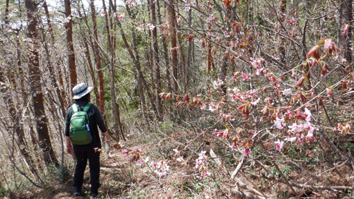 ![]() 白い尾根の飯豊山 週末久しぶりに好天に恵まれました 今日は会津地方の山へ登るために立木観音堂の在る登山口へ ![]() 登山口 タムシバ 集落にある空き地に車を止めてスタートです タムシバの巨木に咲く花が青空に揺れていました ![]() 杉林の道 倒 木 杉林の登山道を進みます 倒木が道を塞いでいる逸れて林に足を踏み入れると赤い鳥居が見える! ![]() 赤い鳥居 カタクリ 見明稲荷神社の石碑が在ります 参道らしき道は見当たらないが奥に神社が在るのでしょうね~? 此のあたりからカタクリの花が目立ちます ![]() シダが大きい ショウジョウバカマ シダも大きくなっています ショウジョウバカマが見ごろで山肌に群生していました ![]() ショウジョウバカマ群生地 キクザキイチゲ 遠慮気味に咲いているのはキクザキイチゲです ![]() 道 標 分 岐 味のある道標が多く目立様に成って来た 杉林に入ると落ちてる杉葉をGonちゃんが揺すります 花粉症の私は「何すんの」と驚くと粉が舞い散る え~~ こんなに出ると思わなかったと花粉が飛んで行った・・・笑 ![]() 取上峠 一休み! 取り上げ峠に付いた 名前からして此処には昔 山賊が旅人を脅して身包みを奪ったのかな?等と話す (笑) ![]() 二重平分岐 意味深な看板 二重平の分岐に着いた 先に行くか迷ったが下山途中で良いかと先を急ぐ ![]() 山 桜 7合目通過 山桜が山肌を彩ってる 7合目の看板に下界に向かってヤッホーと3回さけぼうと書かれています 麓にある青少年自然の家の学生が山に登って楽しむ一コマの様ですね~? ![]() コシアブラ 山頂三角点 尾根を歩いているとコシアブラの木が目立ちます 山頂近くになると芽も大きくなっているので少しだけ頂くことにした ![]() 帰宅してから作ったコシアブラご飯と天婦羅です ![]() 山頂にて! 林間の飯豊山 山頂に着いたが林に囲まれて展望は在りません 林間から見える飯豊山は真っ白でした ![]() 古墳の案内板 一本杉 尾根の倒木を見つけて休憩をします 近くにあった案内板には高寺山の一本杉の由来がかかれていました ![]() 尾根に咲くタムシバ ミネザクラ 25分の休憩を楽しみ下山です 尾根に咲くタムシバやミネザクラが見送ってくれた ![]() 二重平に咲くスイセン 清流に咲いていた 二重平の分岐に着いたので西へ足を延ばします 5分程で清流の流れる場所に着くとスイセンの群生地が現れた 丁度満開で見事な花の絨毯が敷かれています 人の手で移植されたのか?それとも自然界の成す術なのでしょうかね~ ![]() 灌木林 集落から飯豊山 麓は杉林が多いが登るほどに灌木林に変わり サクラの木が多く淡いピンクが本当に綺麗でした 動画をごらんくださいね! 戻る |