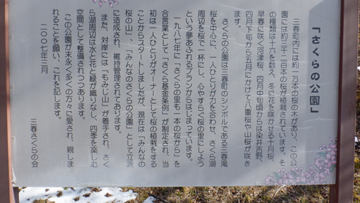 ![]() 三春ダム(管理棟) 1993年に完成した三春ダムに訪れました 脇道を通り過ぎた事はありましたが探索を楽しむために来たのは初めてです ![]() 展望台から見たダム湖 ダム本体 写真は展望台から見た眼下のダム湖と堰堤です ![]() ダム資料館 ダム堰堤 資料館前の駐車場に車を止めて探勝路を歩きだしました ![]() 放 水 取水塔 堰堤の上を歩く事が出来て! 轟音とともに放水する光景を見ることが出来ます ![]() ダム上部(展望台) 探勝路 管理棟の対面に回ると高台に在る展望台と 電波塔?らしきものが見えた ![]() 記念碑 公園の由来 湖畔を巡り探索開始です ![]() 湖畔で一休み 湖畔の東屋 湖畔には大きな東屋もあり 2300本の桜の季節には多くの市民が集うのでしょうね~ ![]() ダムを一望 探索路スタート ダムを一望して探勝路をスタートです ![]() 整備された道 高台の東屋 道は綺麗に整備されて所々に東屋が見えた ![]() 陽射しを受けて! 湖面の? 芝が張られているような綺麗な道を歩きます 湖面に浮かぶのは水鳥?かな? ![]() ベンチで一息 桜並木 大きなベンチも作られています 桜並木が見事で春先の光景が浮かんできました・・・(笑) ![]() ヤドリギの実 蛇沢大橋 雪原に落ちてる黄色い実は何か! 手に取ってみるとヤドリギの実で在る事が解りました ![]() 残雪の道 公衆トイレ 湖畔を巡るように作られている散策路は 小さなアップダウンと変化の在る風景を楽しむことが出来ます ![]() 少し危険 安達太良山方面 本日一番の危険個所です・・・(笑) 斜度の在る土手と遠望の安達太良山が白く染まっていた ![]() 雪積もる湖面 眼下の湖(遠望に春田大橋) 湖面は凍り雪が積もってる所もあります 極端に違うのは日当たりの良し悪しの変化なのでしょうか! ![]() 向山森林公園 ウスタビガの幼虫 湖畔から離れて森林公園へ向かいました 木に下がっているのはガの幼虫が入った繭です 昔はこの繭を集めて糸を作った???と聞いた事が思い出されました ![]() 森林公園は雪が多い ドウダンツツジ 湖畔と違い残雪が多く雪道を楽しむことが出来ました 垣根の様に植えられたドウダンツツジが並ぶ道を進んで一旦車道に出ます ![]() 戻って来ました ダム堰堤 そして舗装道路を歩き回り込んでスタート位置である ダム管理棟へ戻りました ![]() 展望台 ダムの高台 最後に高台に在る展望台へ登り景色を楽しむことが出来ました ![]() 資料館で食事 三春の里 資料館では食事もできる様なので一休みです 三春の里に寄ると野菜の直売所と温泉や宿泊施設などがあり 市民の憩いの場所と解りました 春先にまた来たいと思う様な素晴らしい所です 動画をごらんくださいね! 戻る |
