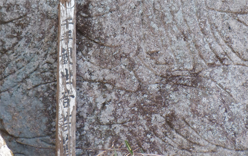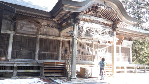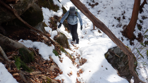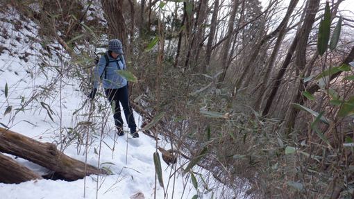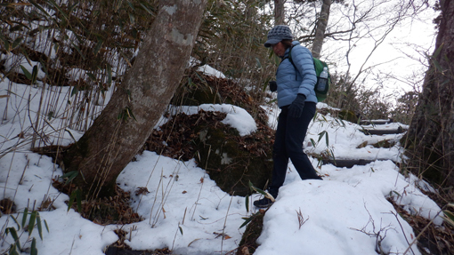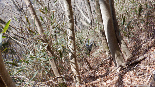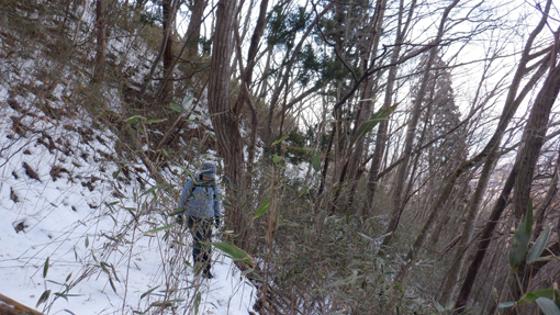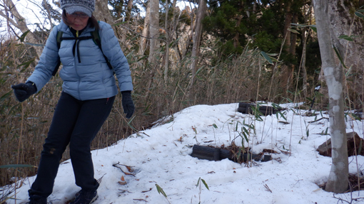 ![]() 木幡山(境内の階段) 木幡山へ登る為に訪れました 小雪がぱらつき風も強い一日です ![]() 駐車場の鳥居 手水舎 大きな駐車場に止めてあるのは一台だけです 御手洗場で手を清めスタートしました ![]() 記念碑 階段を登る 参道階段を登ると左手に見事な記念碑が祀られています ![]() 登山道への道 展望台 さらに階段を登って行くと杉の巨木が見事だ ![]() 東小屋 展望台(吾妻山方面) 展望台の登り口に東小屋があります 西に広がる山々は雲に遮られ見ることが出来ませんでした ![]() 展望広場 木幡の大杉 石椅子とテーブルは休憩場所の様です 木幡の大杉は樹齢700年の古木で数ヶ所養生してあり 支柱や3本のワイヤーで補強されていました ![]() 本 殿 医薬神社 本殿にお参りを済ませてから社を巡ります ![]() 隠津島神社道標 三重塔 ![]() 案内板 木幡の銅鐘 ![]() 養蚕神社 八坂神社 ![]() 疱瘡神社 白山神社 ![]() 足尾神社 藪 越 境内を巡ってから千手観音菩薩に会う為に道なき藪を越えます ![]() 残雪の山肌 危険斜面 斜度もあり残雪は凍っていて滑り危険だ ![]() 道 標 千手観音菩薩 慎重に山腹を登り観音様に逢う事が出来ました ![]() 藪急斜度 7番 観音案内板 観音様から先も藪藪です 登り切ってところが登山道でした ![]() 経 塚 尾根の道標 登山道に出て山頂方面に向かうと経塚群の道標が在ります ![]() 案内板 尾根の塚 案内板の所から尾根を進むと6基の塚が在りました GPSの標高を見ると661mと表示されています ![]() 尾根の道標 下山(アイスバーン) 木幡山は確か666mなので此処から先かな? 思いながら折り返すことにしました ![]() 此処が山頂(季節は違います) ![]() 見た目より斜度あり 転ぶ姿在り? 下山は残雪が凍っているために滑ります キャー と 2度悲鳴が聞こえました 危ない 危ない 幸い怪我もなく下山 ![]() 下山は綱渡り 最後の石段 登山道に在った足跡を見るとアイゼンを付けているのが解ります 今時期は阿武隈山系の山でも甘く見るのは危険ですね! 動画をごらんくださいね! 戻る |