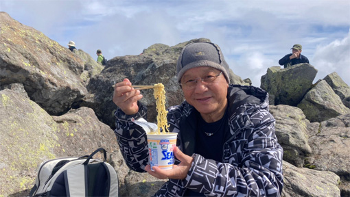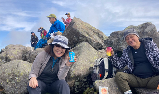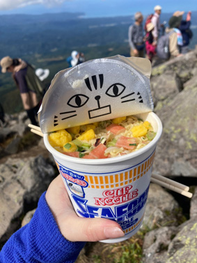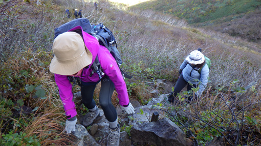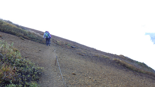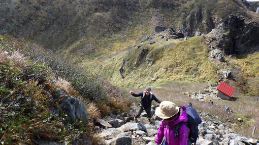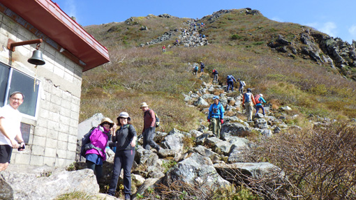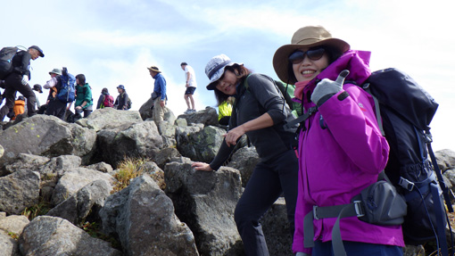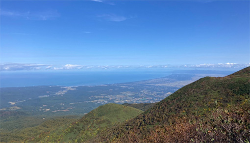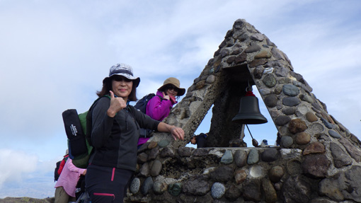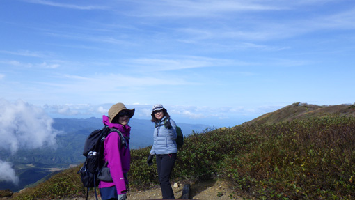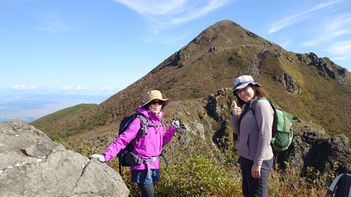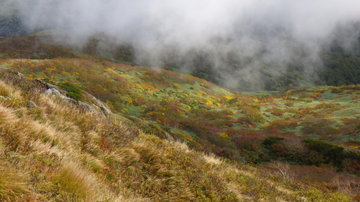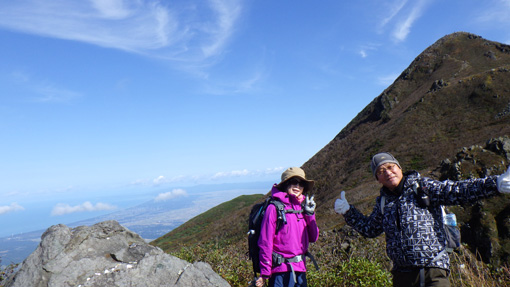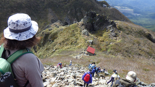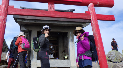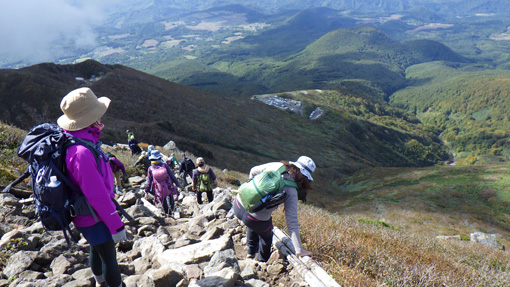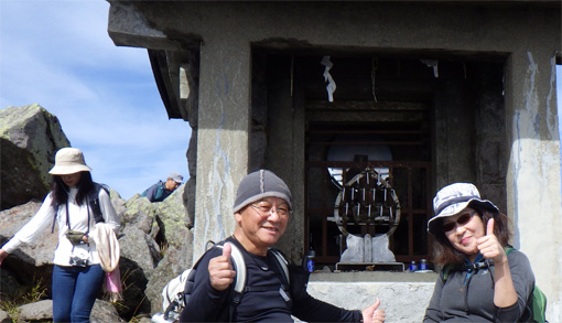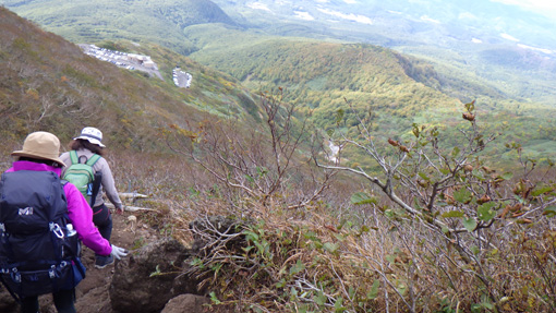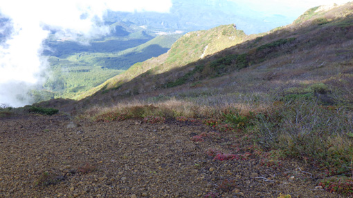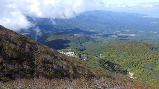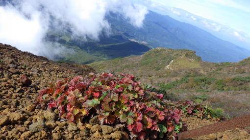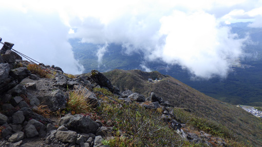 ![]() 麓から見る岩木山 昨日の雨が嘘のように晴れ渡る津軽地方の天気です 私たちは宿を出て岩木山へ向かいました ![]() 岩木山神社から(津軽富士) 駐車場 宿前の岩木神社から岩木山を望み! 津軽岩木スカイラインを走り終点の駐車場へ着きました ![]() リフトを使います リフト終点の道標 リフトの運行時間を待ち早々に乗り標高を稼ぎます 青空が気持ち良く山への気持ちが逸ります ![]() 鳥海山へ 雲湧き上がる まずは鳥海山へ行きます 分岐から15分程で山頂へ行くはずだ! ![]() 無木立地帯 鳥海山山頂(後方は岩木山) 東斜面から雲が湧き上がるがドンドン青空が広がります 予定通り鳥海山山頂へ着きました 案内板も道標(錆びた円盤あり)も無いが間違いなく山頂でしょう (笑) ![]() 稜線の一枚 登山道 休むこともなく折り返し岩木山へ向かった 雲の流れる風景が際立ちます ![]() 眼下に駐車場 青空に聳える尖り 合流地点(分岐)に来ると眼下の駐車場や! 青空を点く尖がりが見えます ![]() 之から岩木山へ 避難小屋 一旦 コルまで下りて少し上ると避難小屋へ着いた 小屋周辺は登山者で混んでいます ![]() 登山道は長蛇の列 ガレバを登る 山頂方面を見ると数珠つなぎの登山者の姿が見えます 此処から岩場の急登で絞られました ![]() 眼下の海岸線 間もなく山頂 眼下に見える日本海の海岸線は七里長浜です 津軽平野には白い風力発電のプロペラが多く見えた ![]() 凄い登山者 山頂の鐘 山頂に着きました凄い登山者の姿でごった返しの様相だ 人波をすり抜けて山頂のシンボル「連帯の鐘」に辿り着きますが! 鐘を鳴らそうとしましたが固定してあり鳴らない。。。 何か固定する訳があったのでしょうね~ ![]() 草紅葉 山頂から東斜面 東斜面を見ると草紅葉が綺麗に色付いていました 方角に寄って色付きも変わる山の景色です ![]() 山頂神社 赤い鳥居 最初に山頂に在ります岩木山神社へお参りです 麓にある岩木山神社の由来から山頂神社が最初に作られた事を知りました ![]() 山 頂 可愛いの~ 頂きま~す いよいよお楽しみの休憩です Hiroちゃんが持ってきたコンロでお湯を沸かしカップ麺を頂ました 山の上のカップ麺は極極極うまいのだ (笑) 見渡しても贅沢にコンロを使って食事は私たちだけです 流石に登山女子は違いますね~ ![]() 穏やかな山頂で休憩 私も頂きま~す (笑) 山頂休憩は35分で気持ちのいい秋晴れに誘われ! 心行くまで楽しみました ![]() 下山です 眼下に見える津軽平野 満点の登山日和を楽しんだ私たちは! 眼下の風景を望みおります ![]() 岩場を下る 間もなくリフト駅 岩場の急坂を慎重に下りてリフト乗り場へと行きます 途中の登山道は登ってくる人が途絶える事はなかった。。。 ![]() 駐車場到着 可愛い絵文字 無事に下山した私たちは山談義で岩木山は100名山か? 霞んでいた答えが出ました (笑) 駐車場に在ります休憩所に入ると可愛い絵文字の額があります 山の形が柔らかくホッコリしました 動画をごらんくださいね! 戻る |
