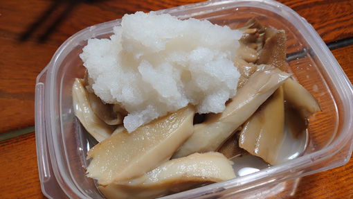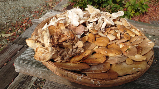![]() 会津の深山へ シーズン最後のキノコ狩りだ 雨の予報でしたが青空が見えています ![]() キノコ狩り シメジが出ています 今日は・・・ シメジ・ムキタケ・ヒラタケ・ナメコ等などがお目当てです ![]() ナラタケが流れてる スギヒラタケ ナラタケは時すでに遅く! 出ているものすべてが真っ黒で流れていました ![]() ムキタケ マイタケ ムキタケは行儀よく並んで出ています 形も大きさも申し分ない良いものだ 山を歩き始めて1時間ぐらい過ぎた時に なんと マイタケ が 出ているのを見つけました 大きな塊です やった~ と喜ぶも ぬか喜びになりました 手に取ると柔らかく流れています 良い香りもなく腐ったような匂いがしました 残念! 次年の為にと落ち葉を被せて養生です マイタケは遅くても10月いっぱいのキノコなのだ (苦笑) ![]() 今日の出来高 山小屋で選別 今日の出来高は素晴らしい 大きな平篭にいっぱいでした ![]() 大根おろしで! 今年の塩蔵 採れたてのムキタケは大根おろしをかけて頂きました 肉厚のキノコは美味いと~ 残りは今まで漬けておいた塩蔵のキノコに追加して 保存いたしました これで次のシーズンまでキノコを食べることが出来ます 「山の恵みに感謝」 動画をごらんくださいね! 戻る |